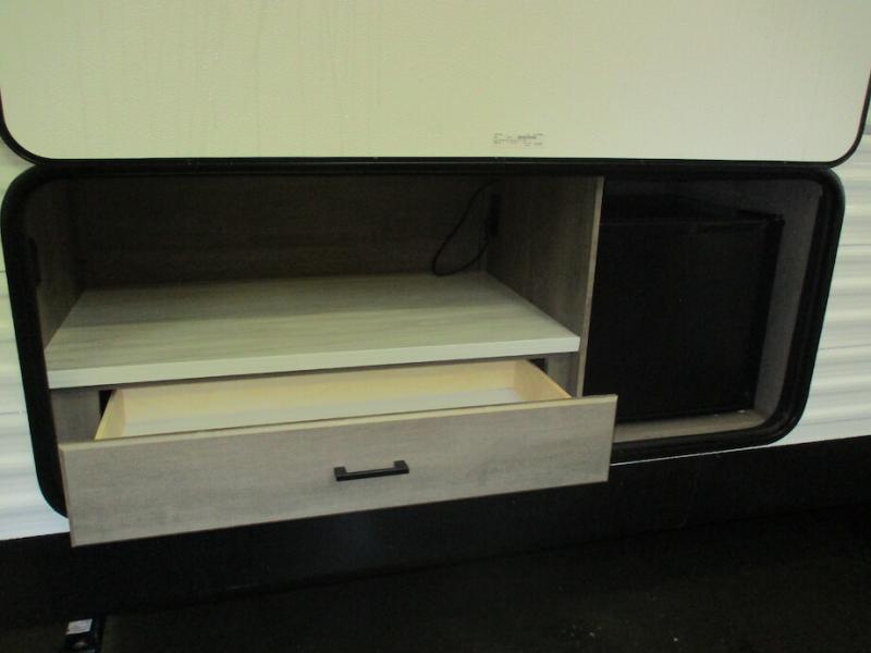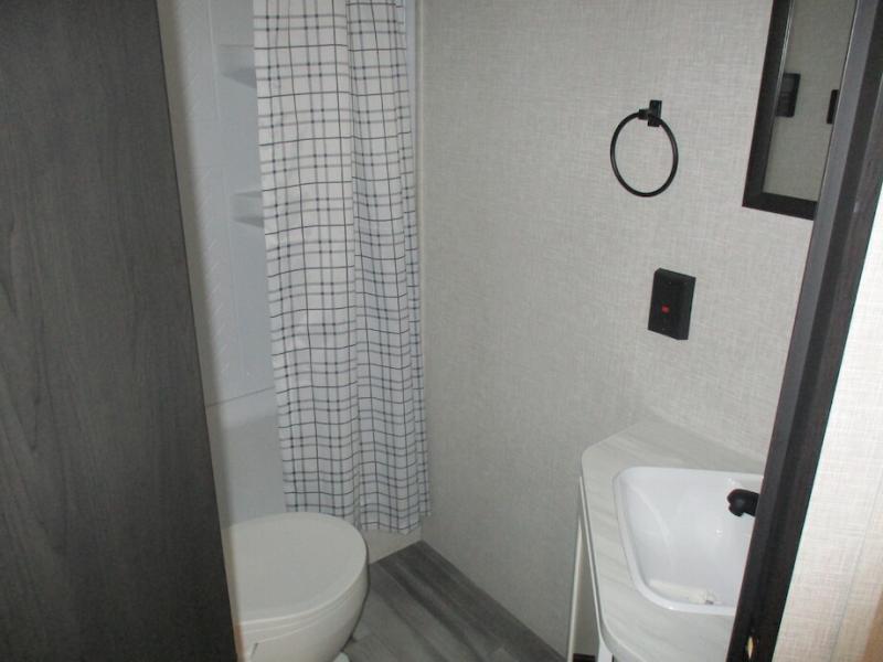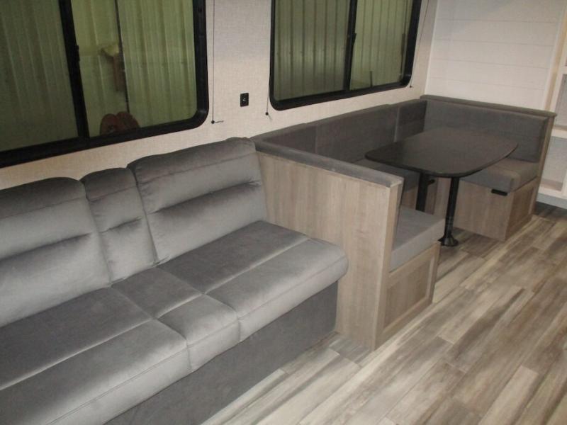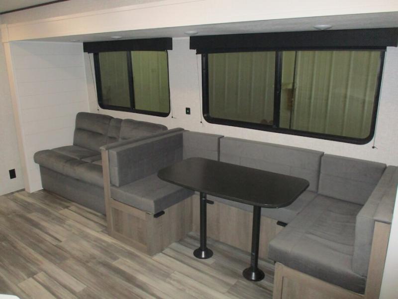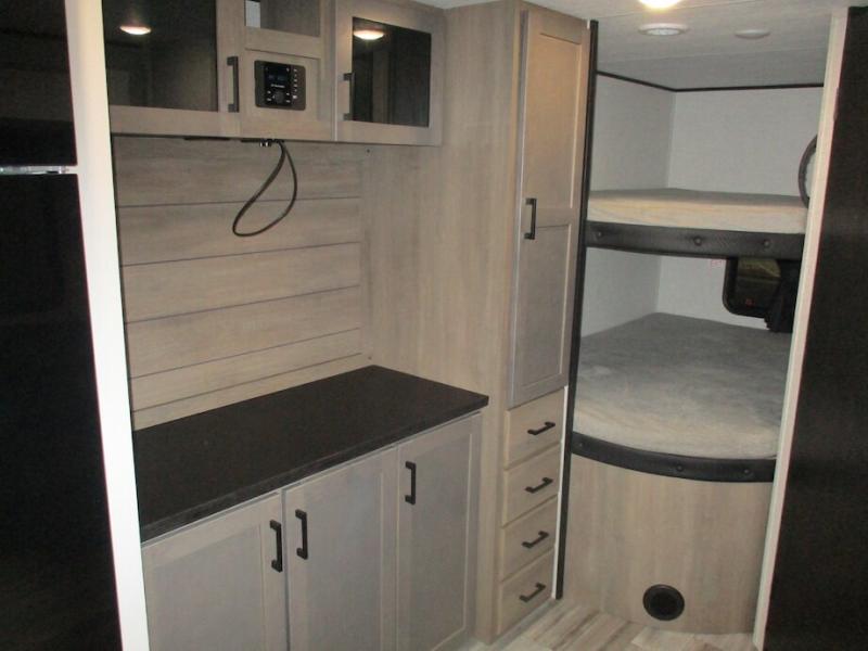 Loads of fun like hiking, fishing, and playing outdoor camping games are waiting for you to make that reservation, hitch up and head out! This trailer allows the owners to sleep in privacy behind the space saving sliding door on a 60" x 75" queen bed. And the kids or grandkids can sleep on the double-size bunks in the rear next to the full bathroom including a tub/shower. They even have a wardrobe nearby for their things. The slide out jackknife sofa and U-shaped dinette offers more floor space, a place to relax and dine, plus you can play games at the dinette. This model also includes an exterior refrigerator so you can grab a cold drink while under the 16' power awning!