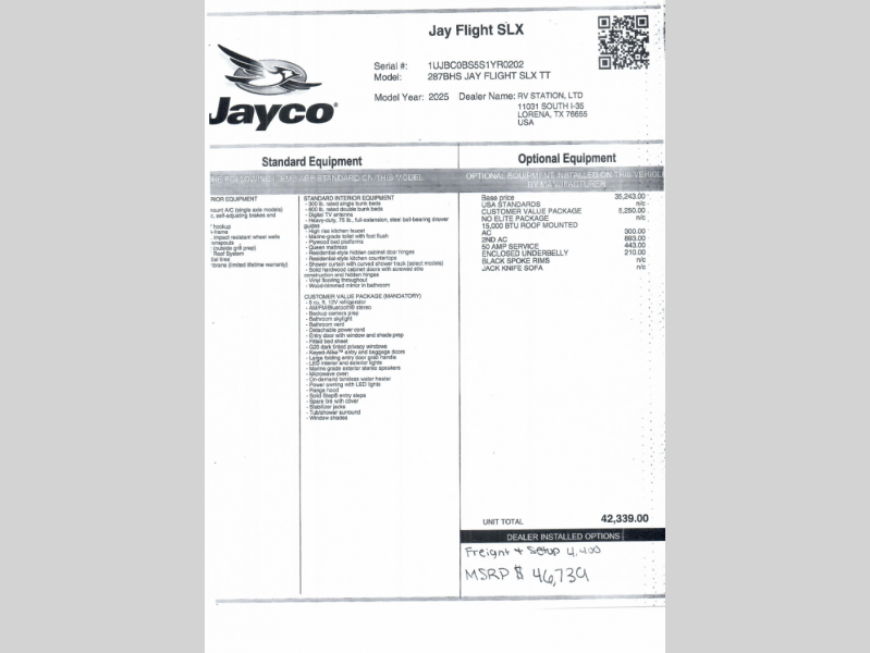 The Jayco Jay Flight SLX travel trailer is quite easy to own because it is lightweight for an easier towing experience. Built on a fully integrated A-frame with galvanized-steel, impact-resistant wheel wells, the Jay Flight SLX has quality at its very foundation. That quality continues on to the electric self-adjusting brakes, easy-lube hubs, Magnum Truss roof system, and LP quick connect. Some of what the mandatory Customer Value Package includes is backup camera prep, Keyed-Alike entry and baggage doors, marine grade exterior speakers, and an on-demand tankless water heater.