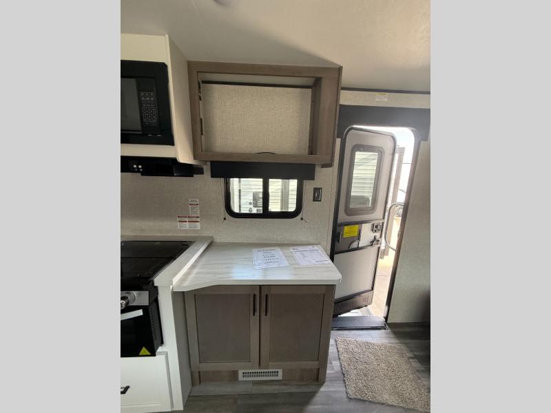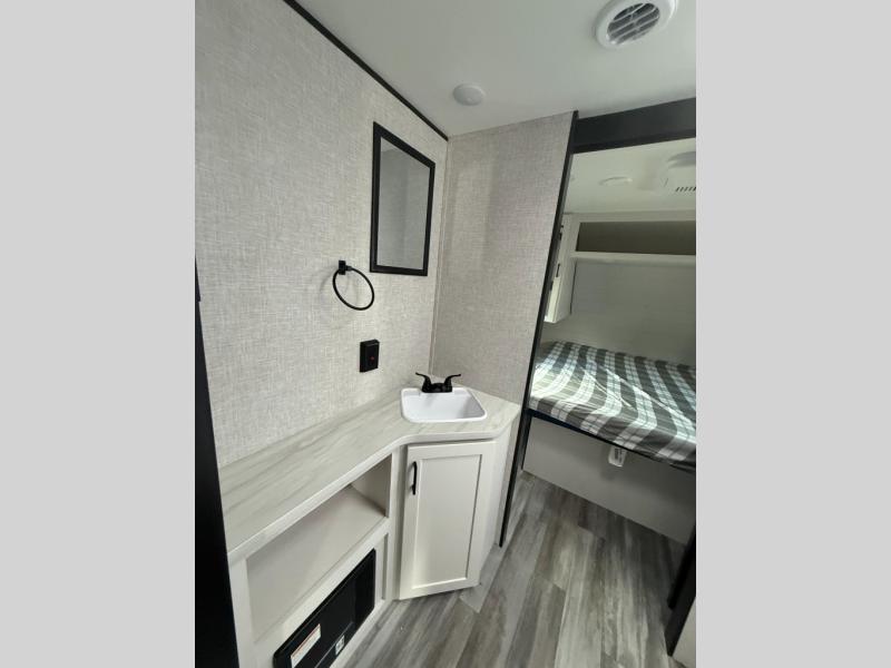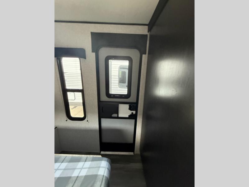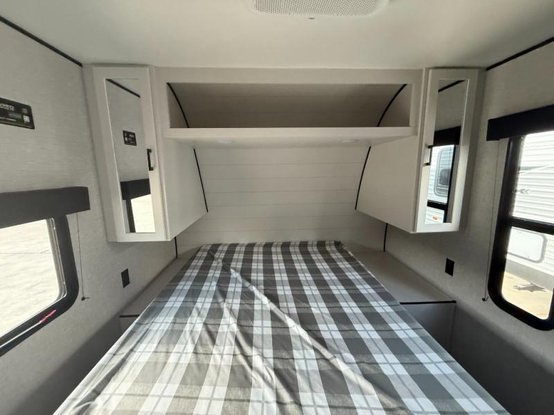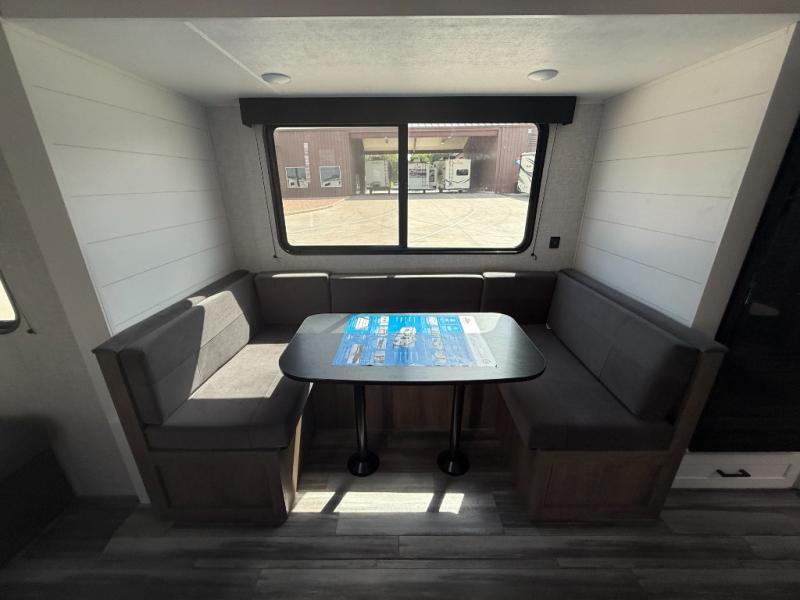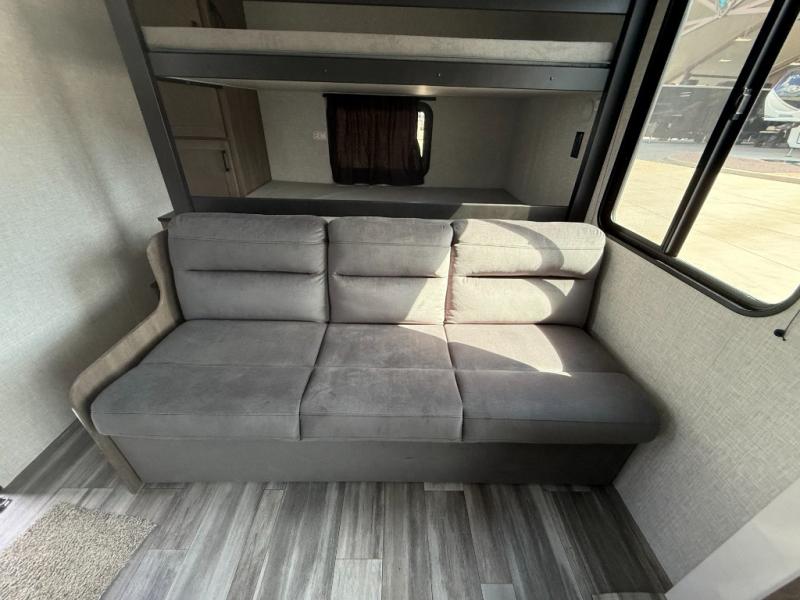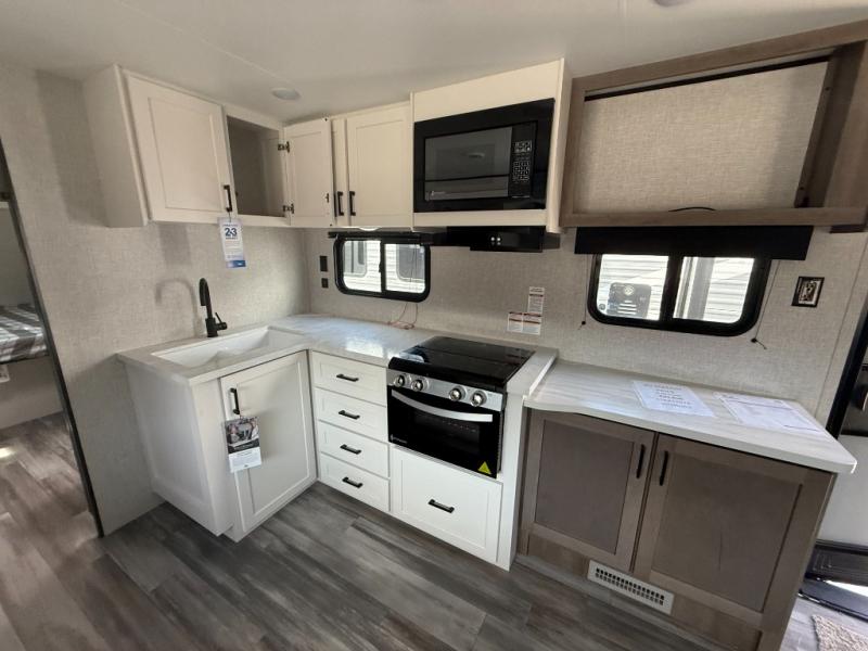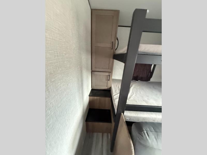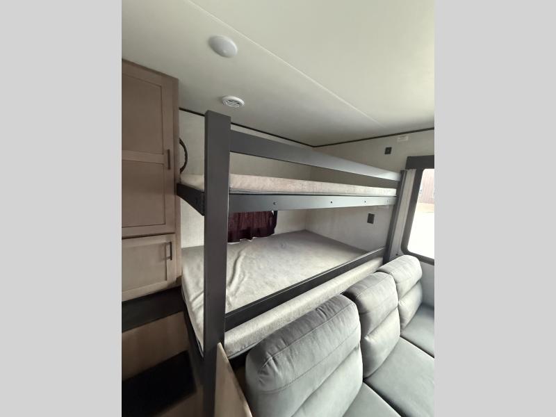 It's time to ditch that old tent and upgrade to this spacious travel trailer! The littles ones or your guests will love the double-size bunks with steps in the back, while you take the front master bedroom. One of the dual entry doors is also found here for convenience, and the walk-through bath is easily accessible for everyone. A U-shaped dinette slide and jack-knife sofa in the main living area provide your crew with space to relax and dine together, and the fully equipped kitchen lets you cook up your best meals. This unit includes ample storage space, including additional kitchen storage, wardrobes, overhead cabinets, and exterior storage!