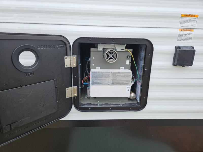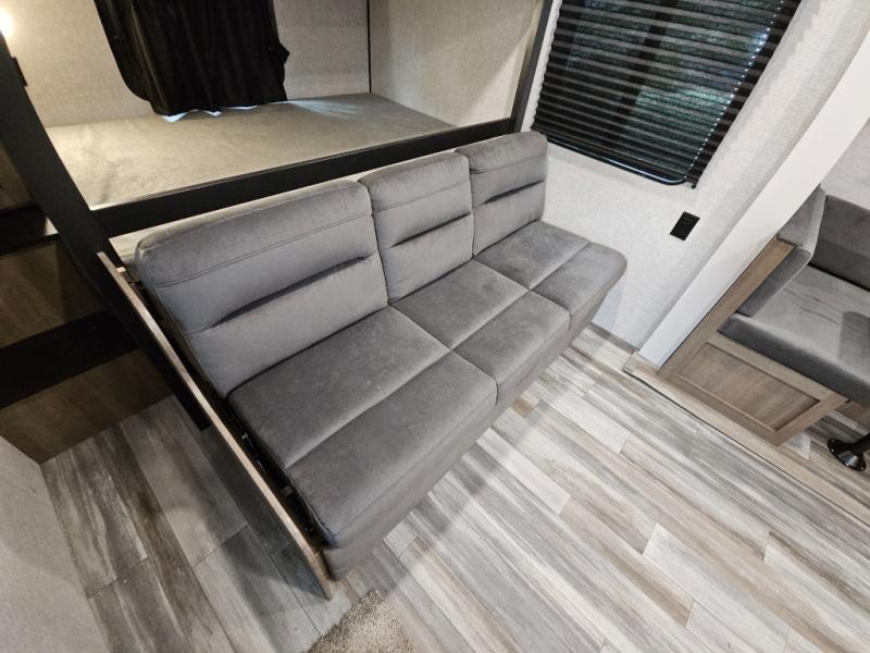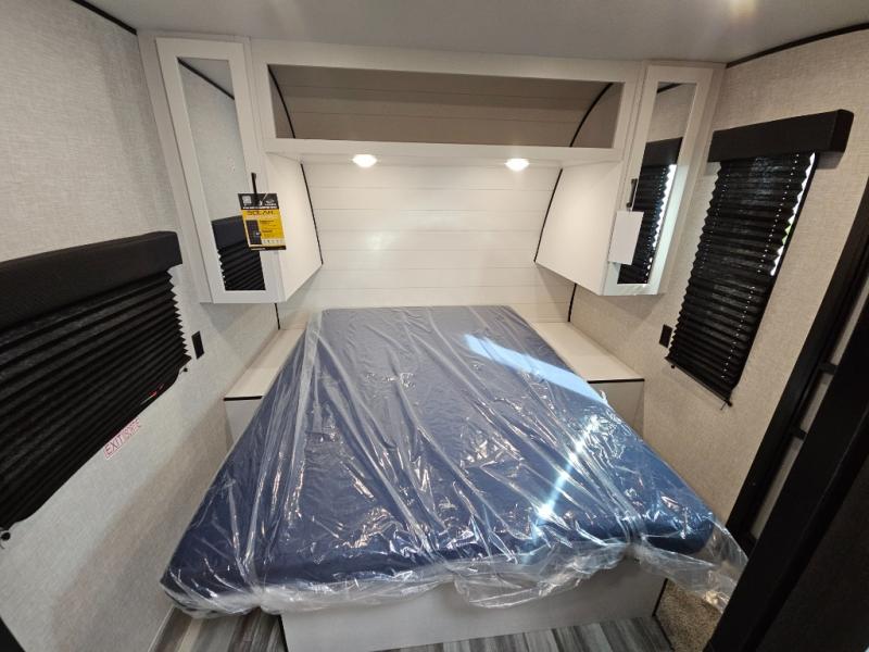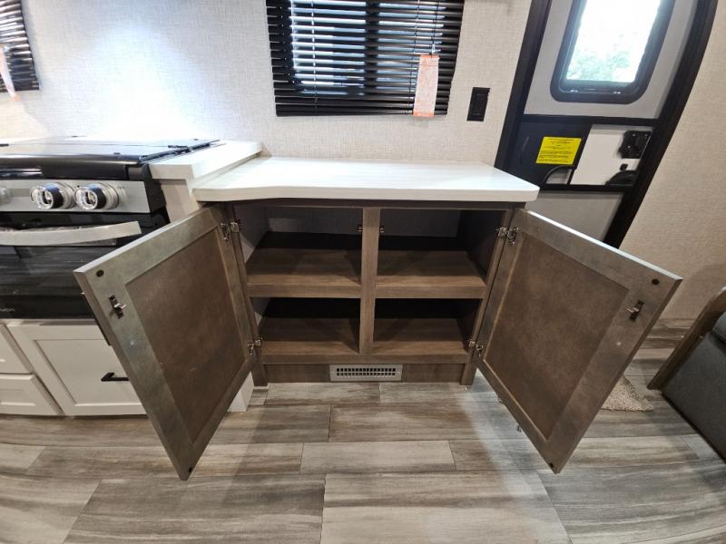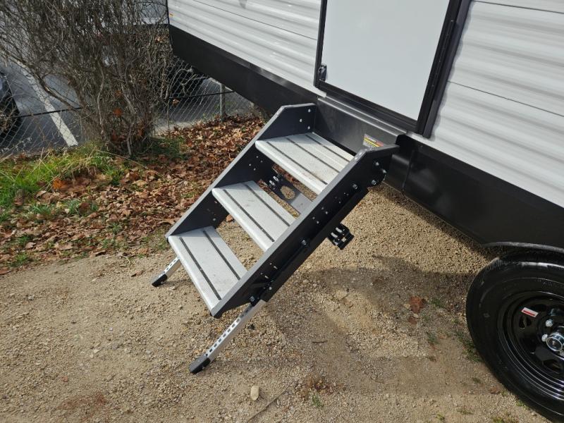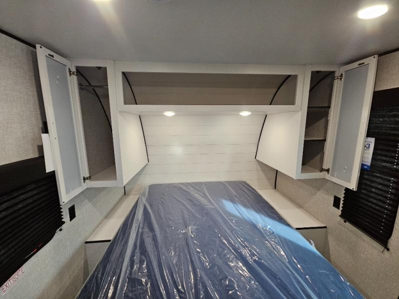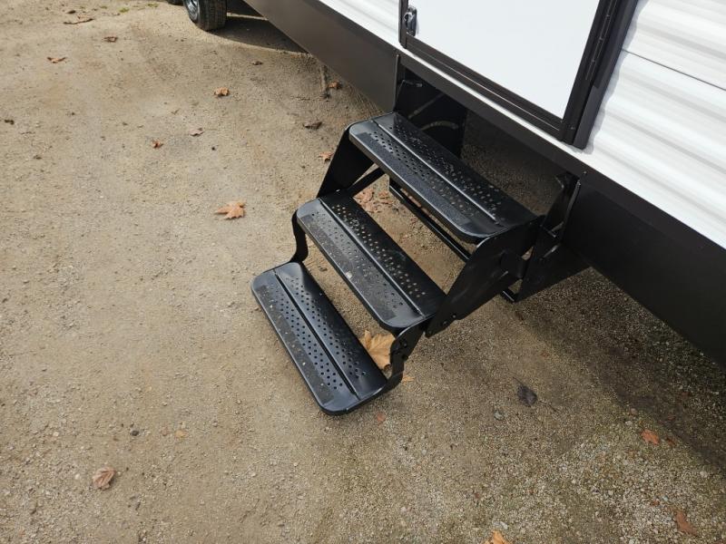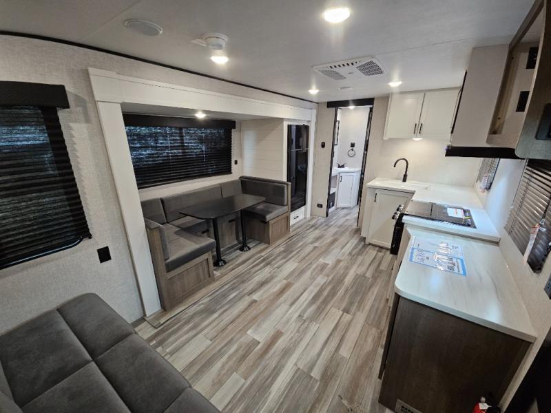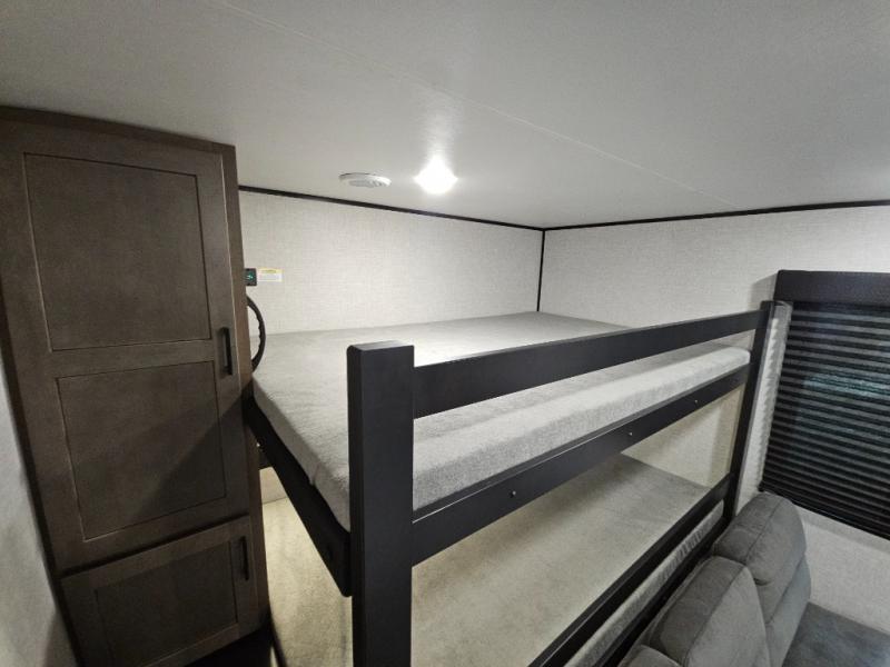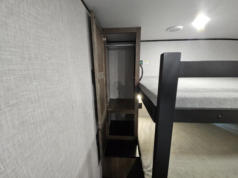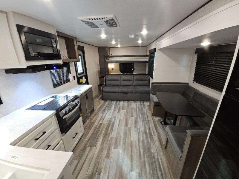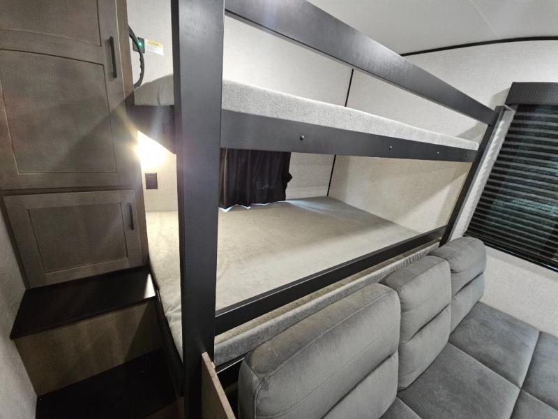 It's time to ditch that old tent and upgrade to this spacious travel trailer! The littles ones or your guests will love the double-size bunks with steps in the back, while you take the front master bedroom. One of the dual entry doors is also found here for convenience, and the walk-through bath is easily accessible for everyone. A U-shaped dinette slide and jack-knife sofa in the main living area provide your crew with space to relax and dine together, and the fully equipped kitchen lets you cook up your best meals. This unit includes ample storage space, including additional kitchen storage, wardrobes, overhead cabinets, and exterior storage!