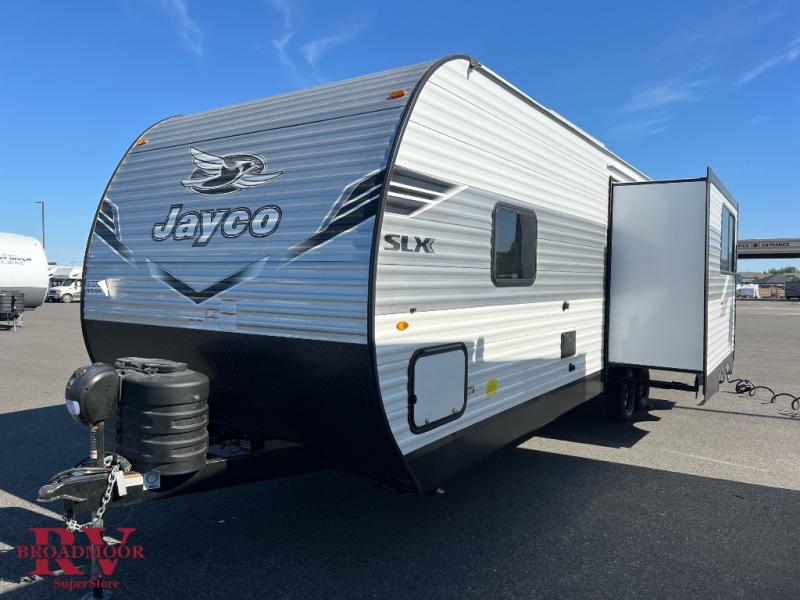 The Jayco Jay Flight SLX travel trailer is quite easy to own because it is lightweight for an easier towing experience. Built on a fully integrated A-frame with galvanized-steel, impact-resistant wheel wells, the Jay Flight SLX has quality at its very foundation. That quality continues on to the electric self-adjusting brakes, easy-lube hubs, Magnum Truss roof system, and LP quick connect. Some of what the mandatory Customer Value Package includes is backup camera prep, Keyed-Alike entry and baggage doors, marine grade exterior speakers, and an on-demand tankless water heater.