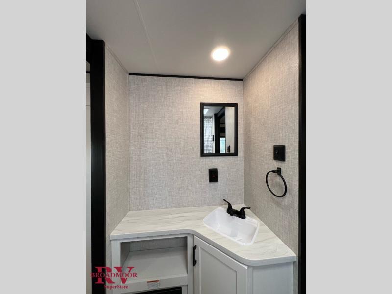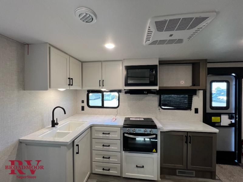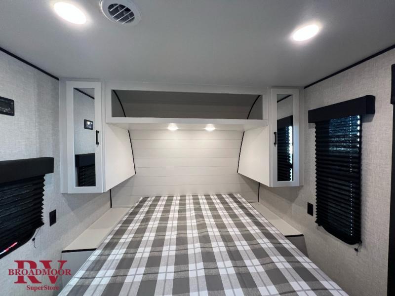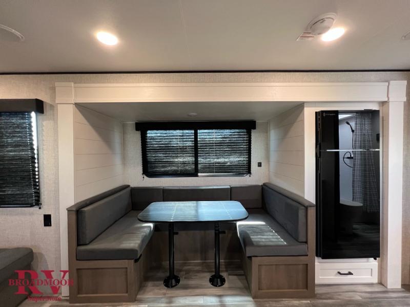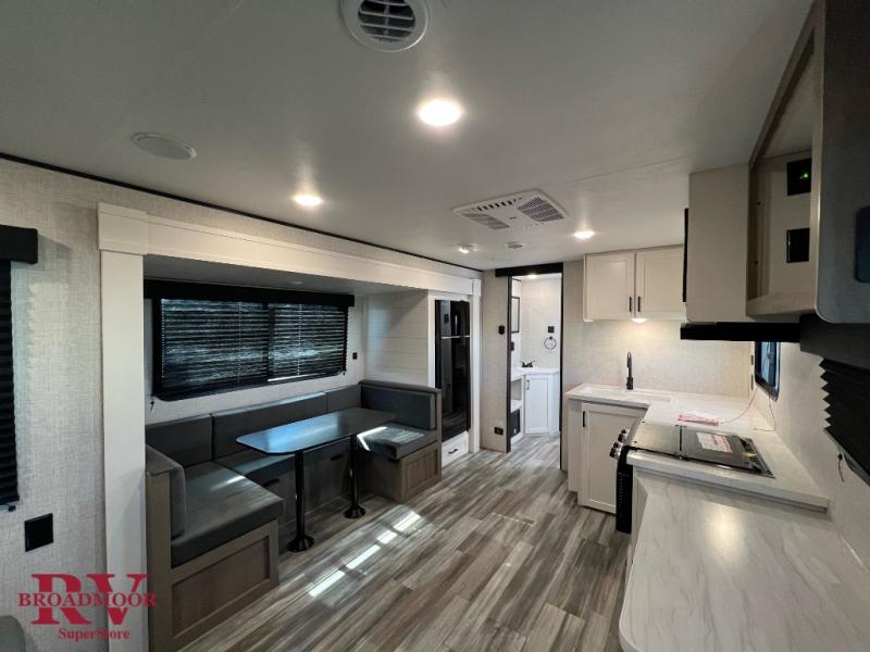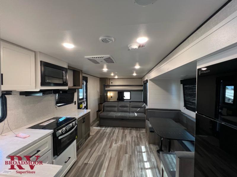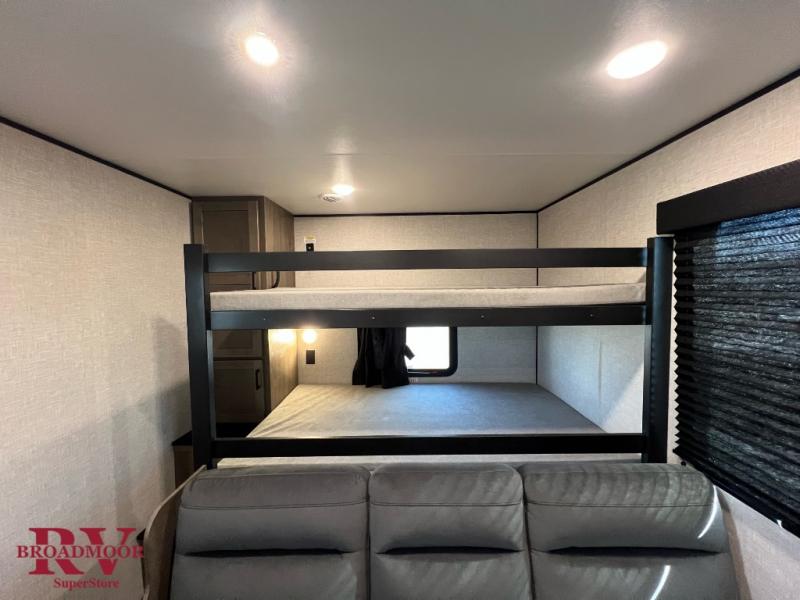 It's time to ditch that old tent and upgrade to this spacious travel trailer! The littles ones or your guests will love the double-size bunks with steps in the back, while you take the front master bedroom. One of the dual entry doors is also found here for convenience, and the walk-through bath is easily accessible for everyone. A U-shaped dinette slide and jack-knife sofa in the main living area provide your crew with space to relax and dine together, and the fully equipped kitchen lets you cook up your best meals. This unit includes ample storage space, including additional kitchen storage, wardrobes, overhead cabinets, and exterior storage!