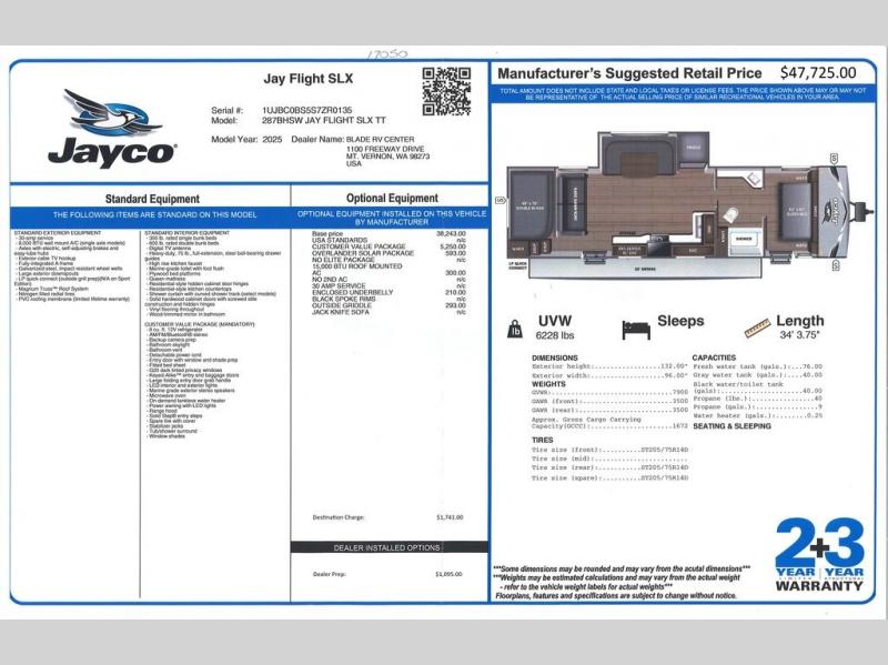 The Jayco Jay Flight SLX travel trailer is quite easy to own because it is lightweight for an easier towing experience. Built on a fully integrated A-frame with galvanized-steel, impact-resistant wheel wells, the Jay Flight SLX has quality at its very foundation. That quality continues on to the electric self-adjusting brakes, easy-lube hubs, Magnum Truss roof system, and LP quick connect. Some of what the mandatory Customer Value Package includes is backup camera prep, Keyed-Alike entry and baggage doors, marine grade exterior speakers, and an on-demand tankless water heater.