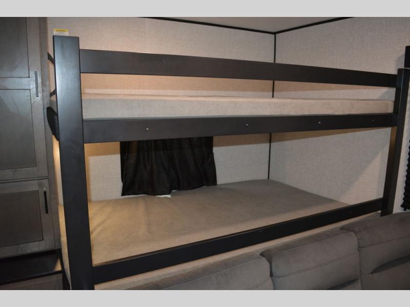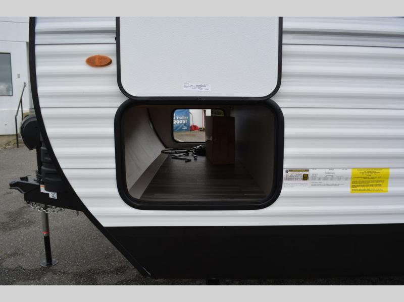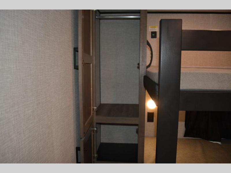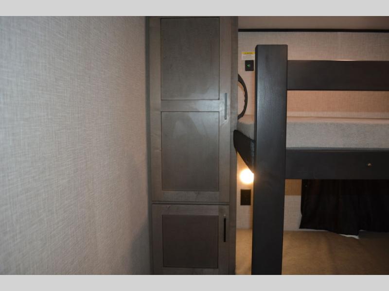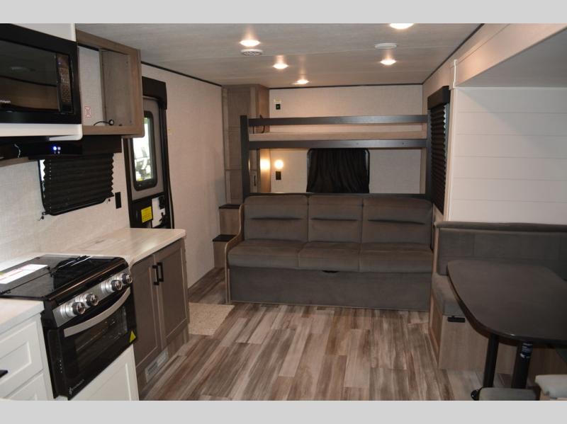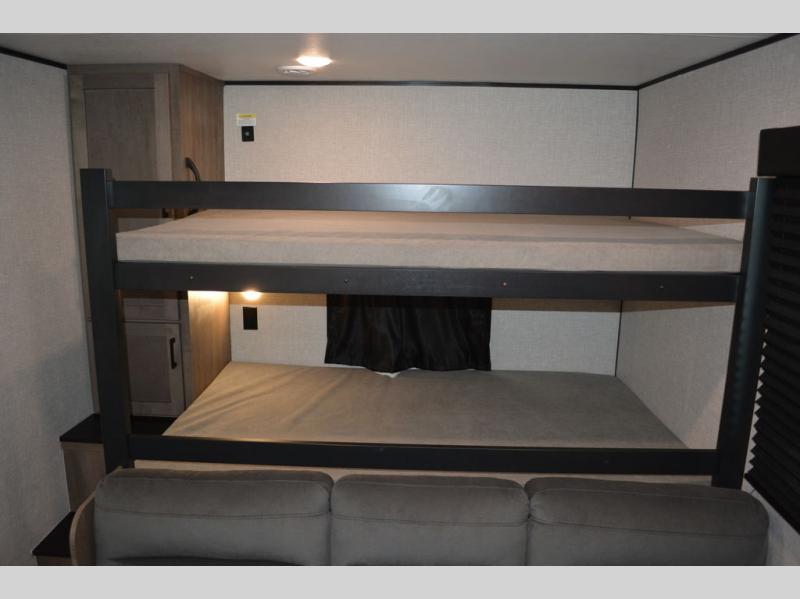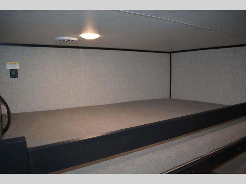 It's time to ditch that old tent and upgrade to this spacious travel trailer! The littles ones or your guests will love the double-size bunks with steps in the back, while you take the front master bedroom. One of the dual entry doors is also found here for convenience, and the walk-through bath is easily accessible for everyone. A U-shaped dinette slide and jack-knife sofa in the main living area provide your crew with space to relax and dine together, and the fully equipped kitchen lets you cook up your best meals. This unit includes ample storage space, including additional kitchen storage, wardrobes, overhead cabinets, and exterior storage!