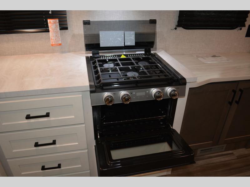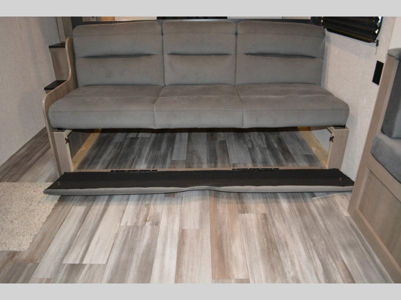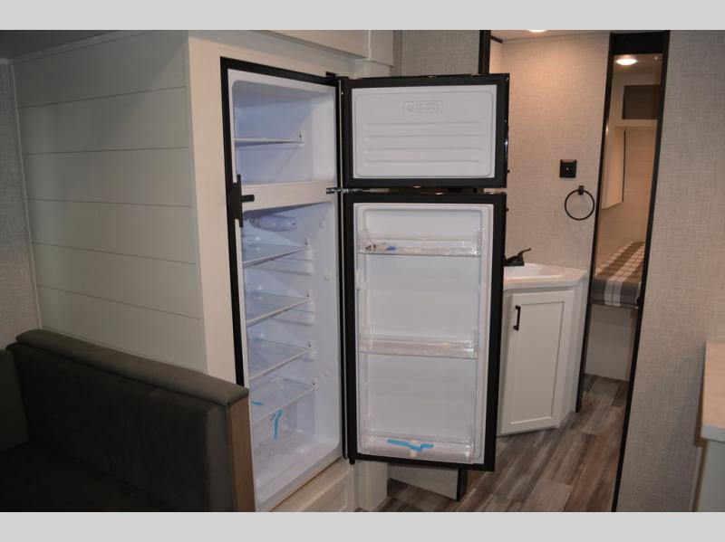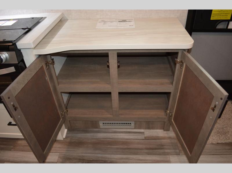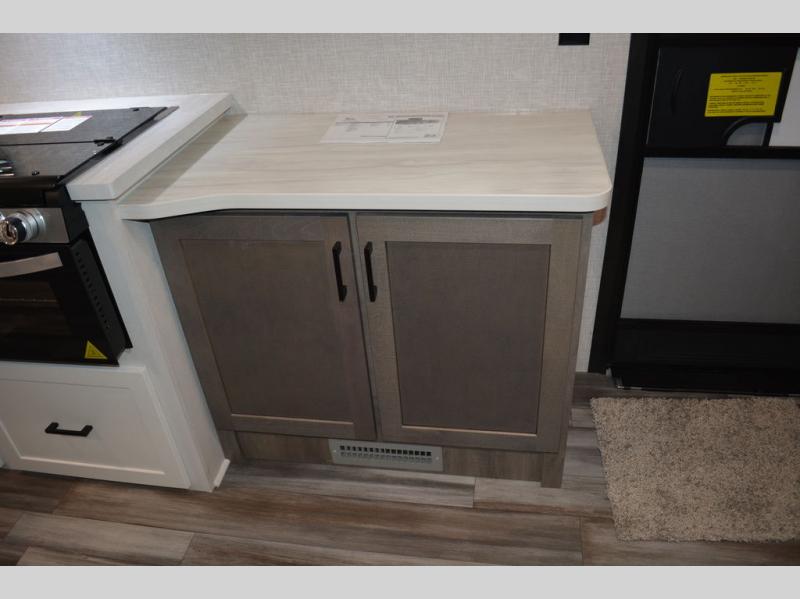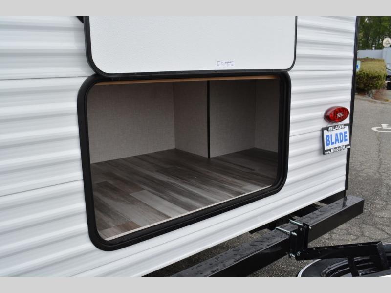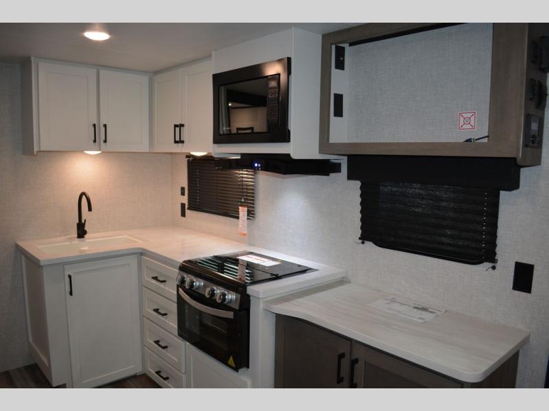 It's time to ditch that old tent and upgrade to this spacious travel trailer! The littles ones or your guests will love the double-size bunks with steps in the back, while you take the front master bedroom. One of the dual entry doors is also found here for convenience, and the walk-through bath is easily accessible for everyone. A U-shaped dinette slide and jack-knife sofa in the main living area provide your crew with space to relax and dine together, and the fully equipped kitchen lets you cook up your best meals. This unit includes ample storage space, including additional kitchen storage, wardrobes, overhead cabinets, and exterior storage!