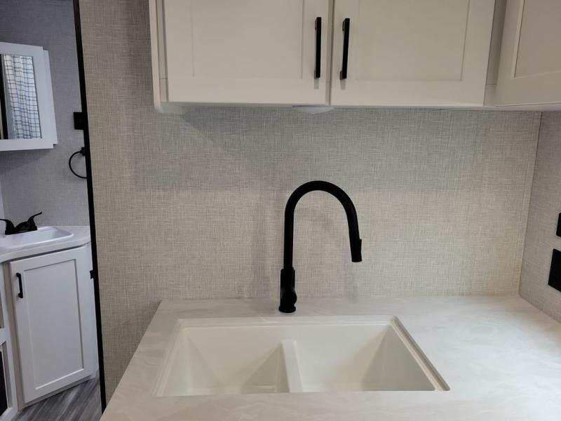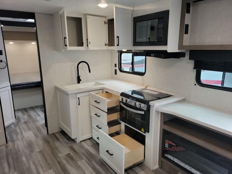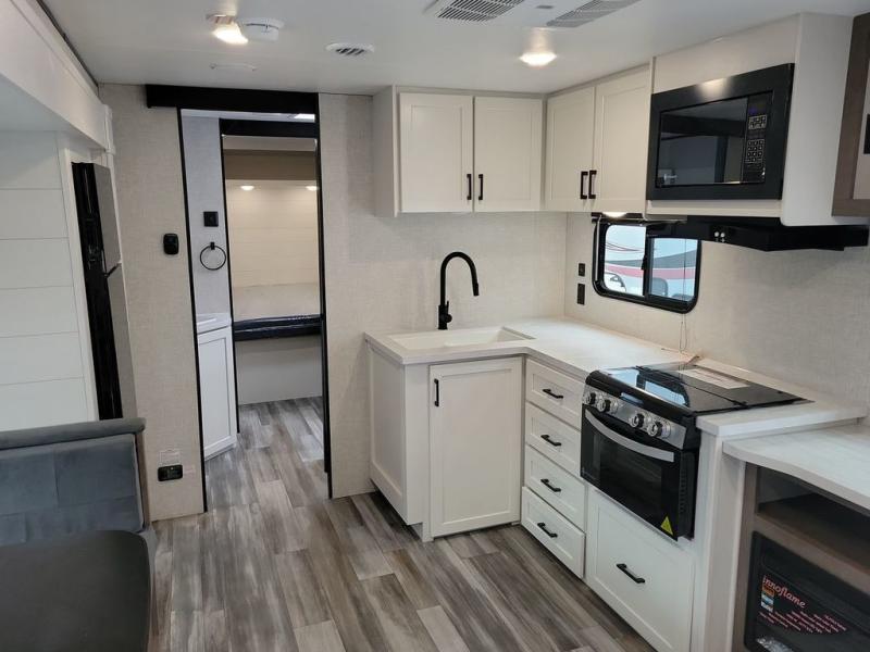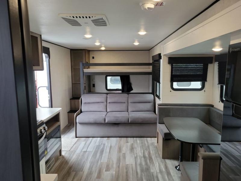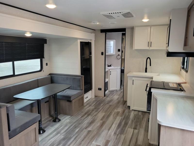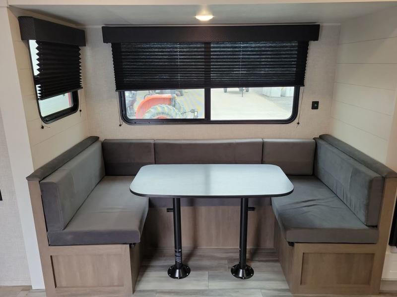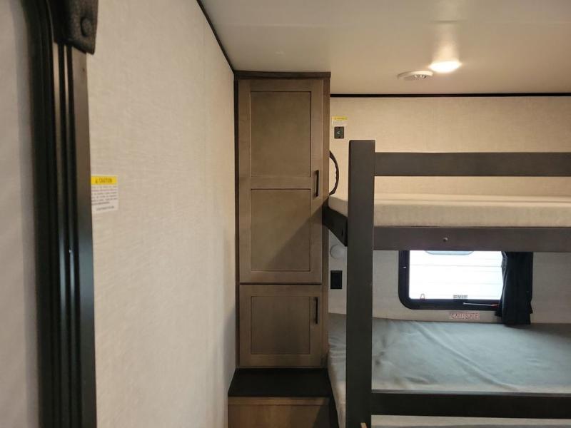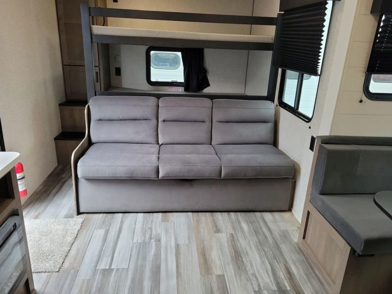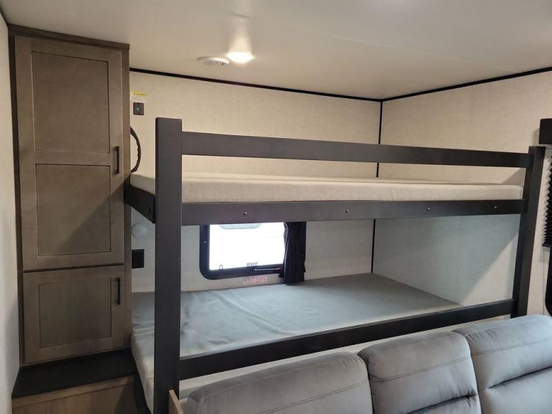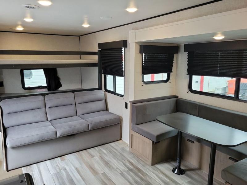 It's time to ditch that old tent and upgrade to this spacious travel trailer! The littles ones or your guests will love the double-size bunks with steps in the back, while you take the front master bedroom. One of the dual entry doors is also found here for convenience, and the walk-through bath is easily accessible for everyone. A U-shaped dinette slide and jack-knife sofa in the main living area provide your crew with space to relax and dine together, and the fully equipped kitchen lets you cook up your best meals. This unit includes ample storage space, including additional kitchen storage, wardrobes, overhead cabinets, and exterior storage!