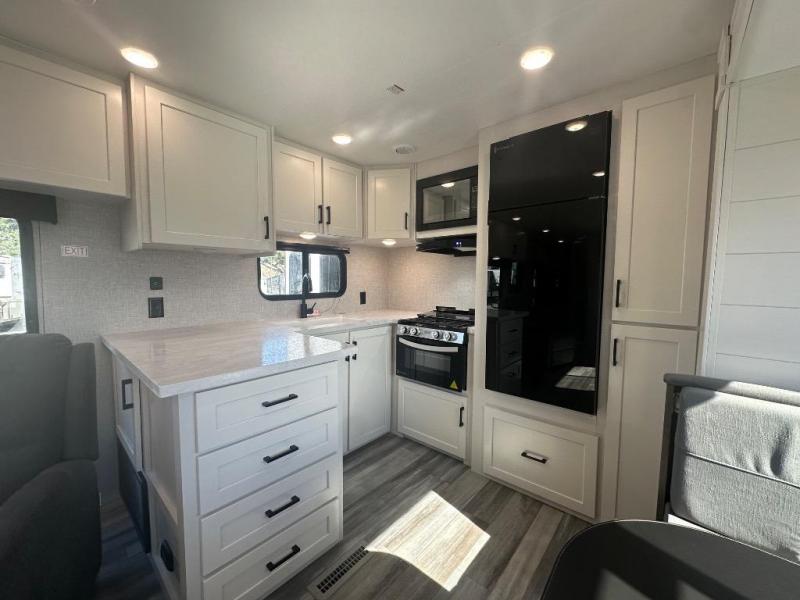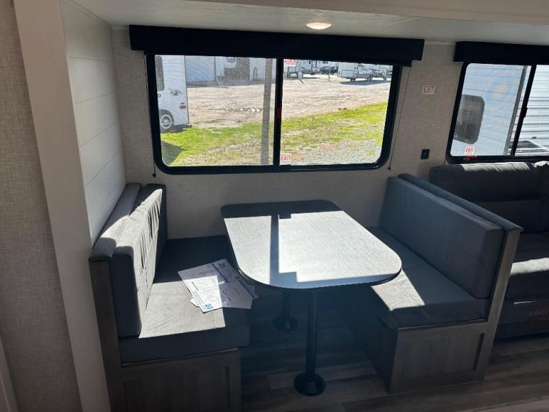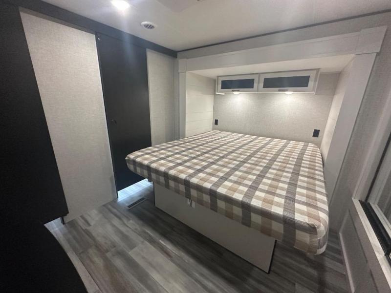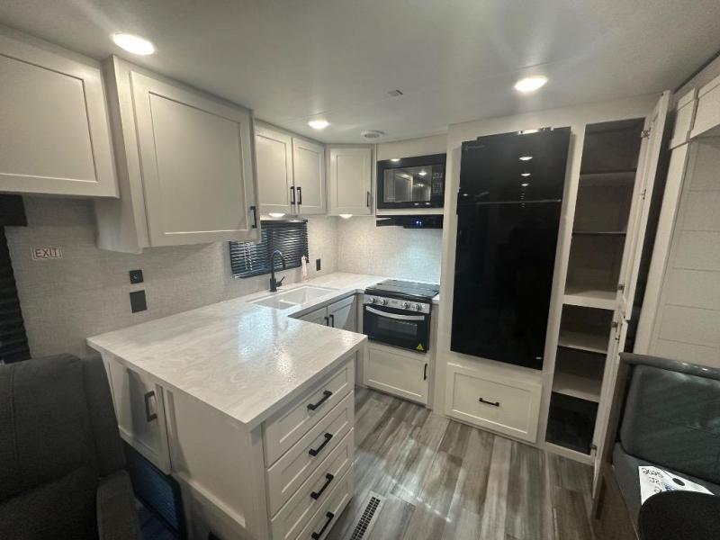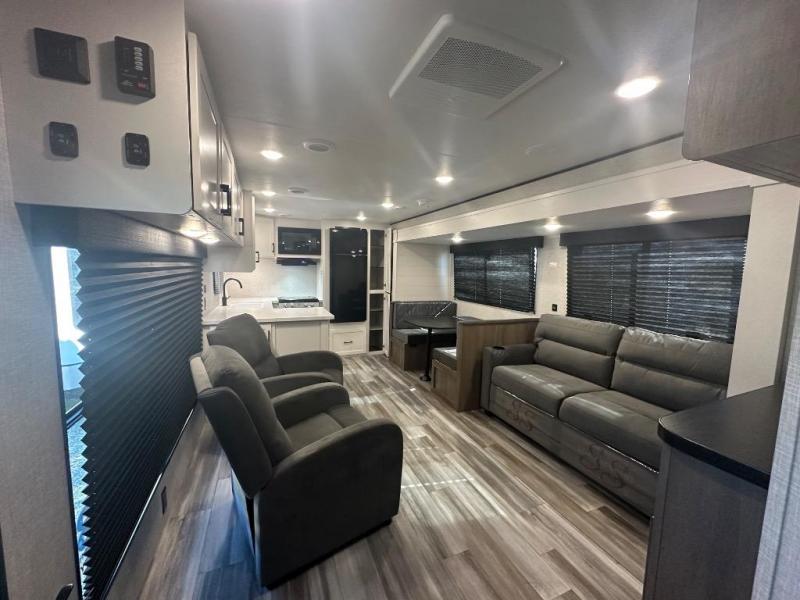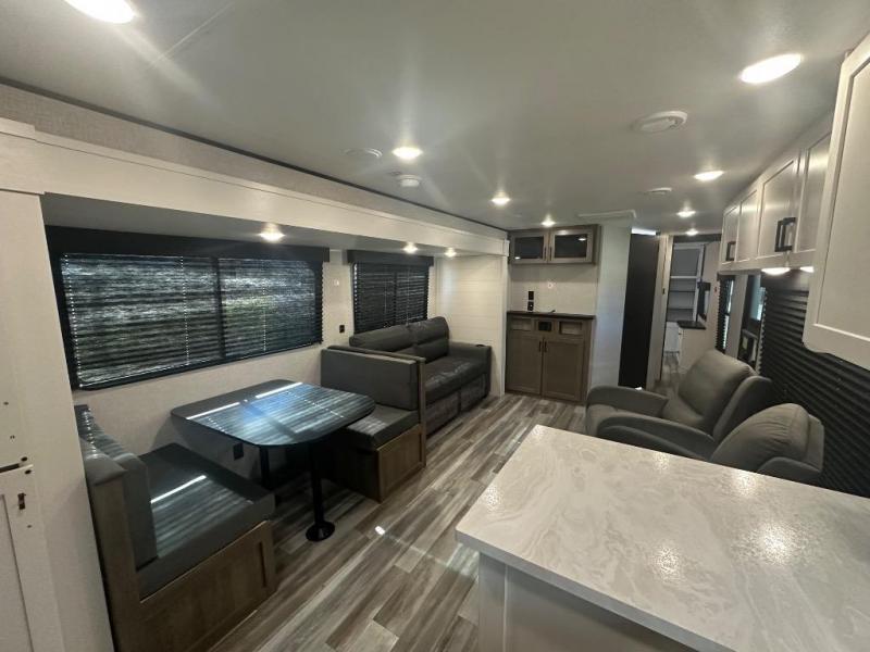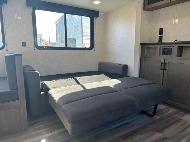 Time spent in this double slide out trailer will be time well spent! Your crew can relax on the sofa or lounge chairs, and dine at the booth dinette. A dual entry bath will create a front master bedroom you are sure to love. There is a queen bed slide out here, along with a front wardrobe, a dresser, plus washer and dryer prep. The rear kitchen includes ample counter space, all the appliances to create meals, and a pantry for snacks.