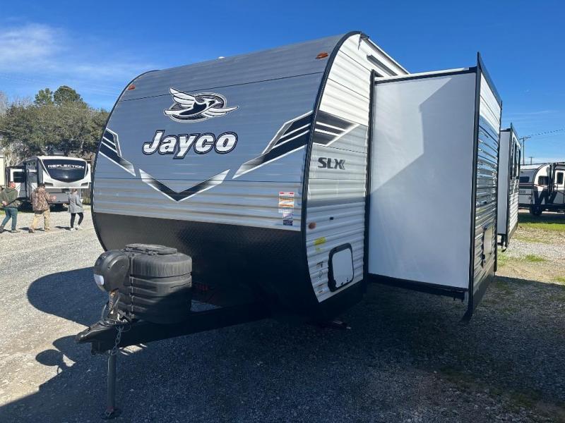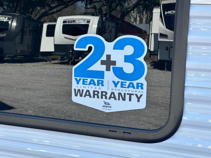 The Jayco Jay Flight SLX travel trailer is quite easy to own because it is lightweight for an easier towing experience. Built on a fully integrated A-frame with galvanized-steel, impact-resistant wheel wells, the Jay Flight SLX has quality at its very foundation. That quality continues on to the electric self-adjusting brakes, easy-lube hubs, Magnum Truss roof system, and LP quick connect. Some of what the mandatory Customer Value Package includes is backup camera prep, Keyed-Alike entry and baggage doors, marine grade exterior speakers, and an on-demand tankless water heater.