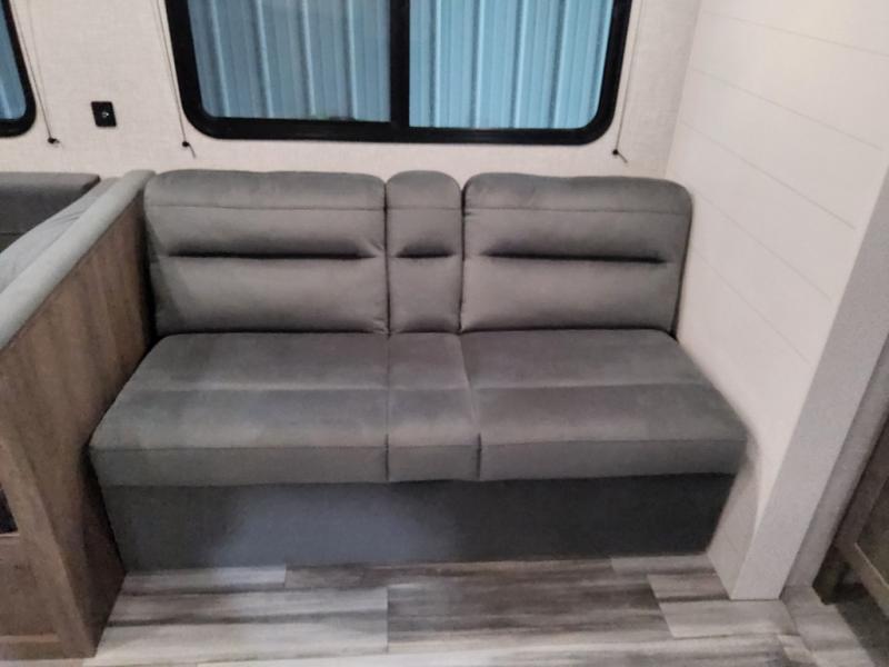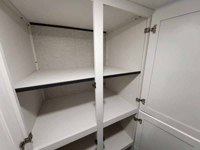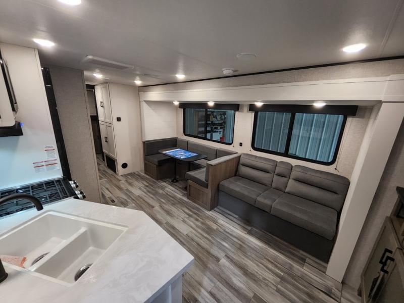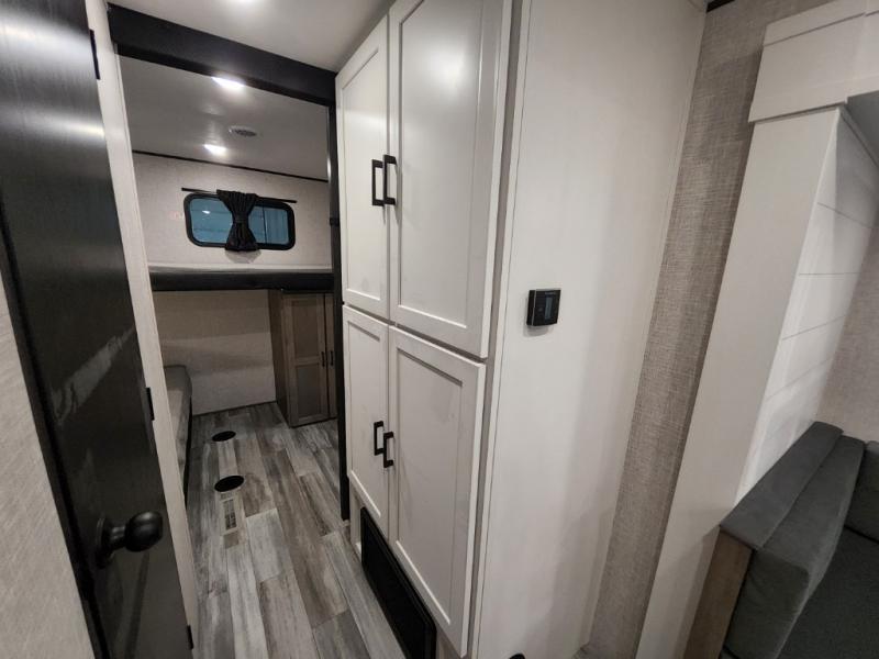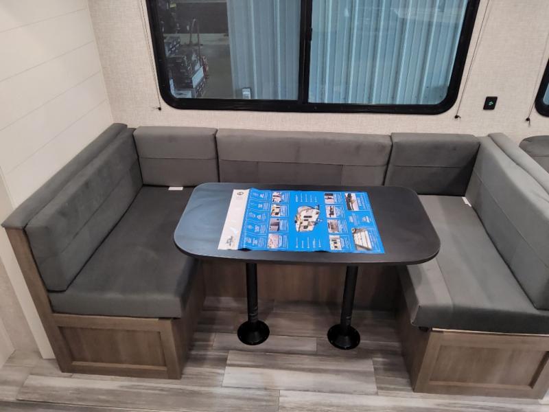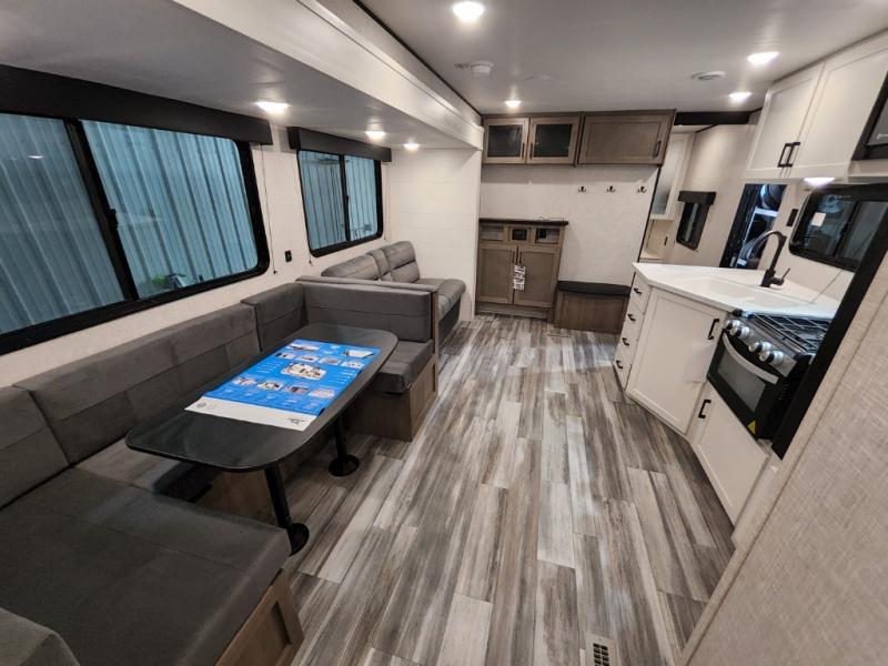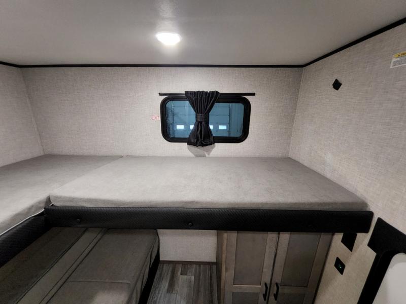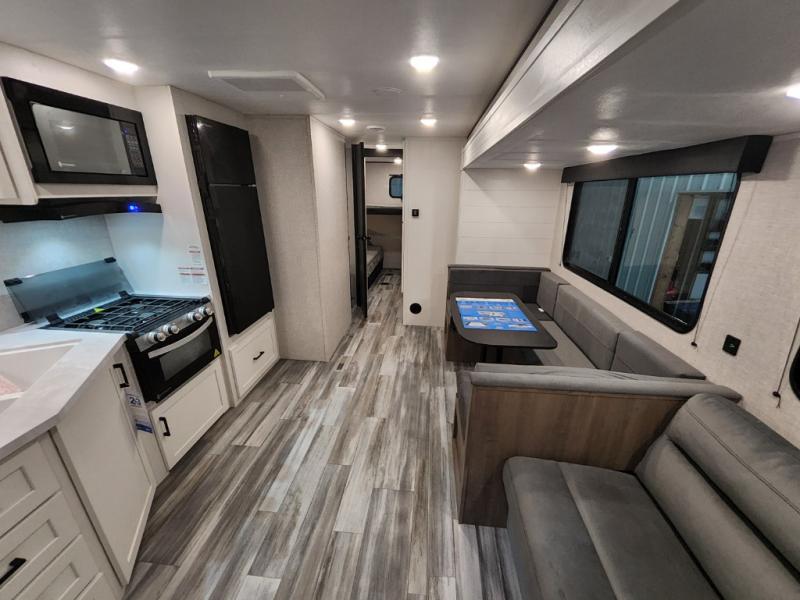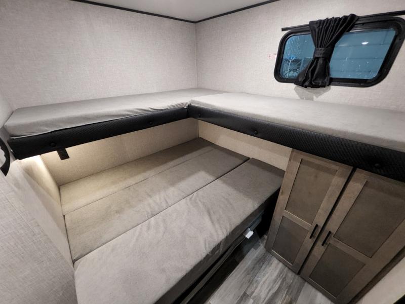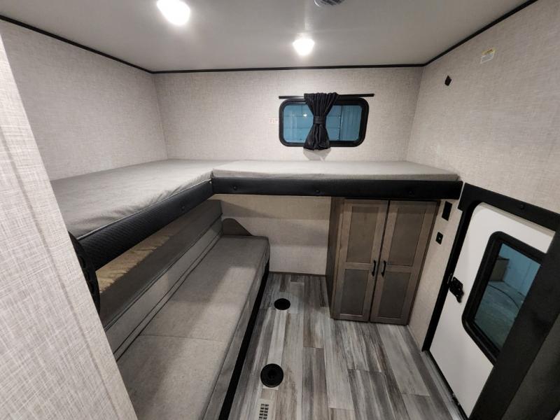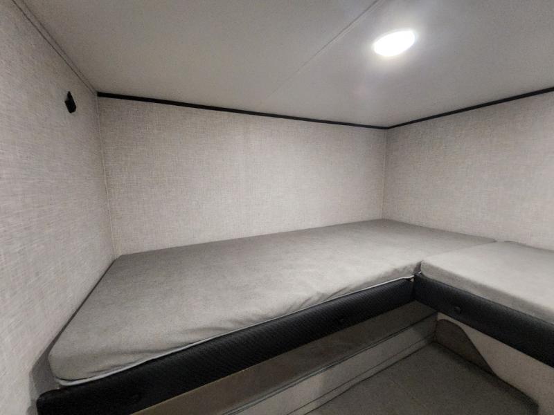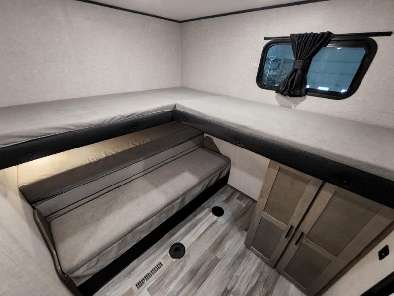 Spacious, accommodating, comfortable; start camping in this trailer that offers something for everyone! The popular bunkhouse offers two 31" x 75" bunk beds above a convertible sofa with 60" x 75" queen mattress, a wardrobe, and a cargo door for easy access. The kitchen provides full amenities to make delicious home cooked meals. The U-shaped dinette and Jack-knife sofa slide give you more floor space to stretch out and provide extra sleeping space, plus you will appreciate the bench/storage as you walk into the trailer. And the large pantry will hold all the goodies for the big group. The front bedroom gives you a 60" x 75" queen bed to sleep on, dual wardrobes and an overhead shelf to place your clothing and things, plus a space saving door to close for privacy.