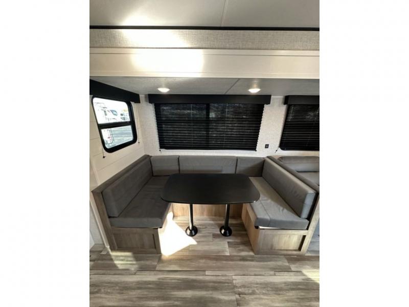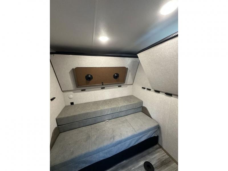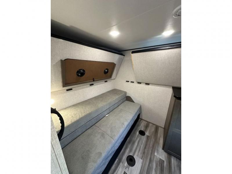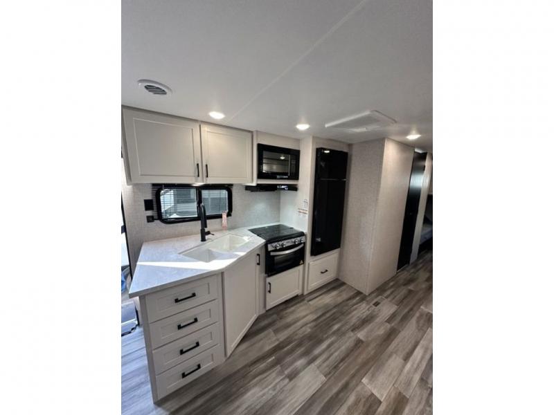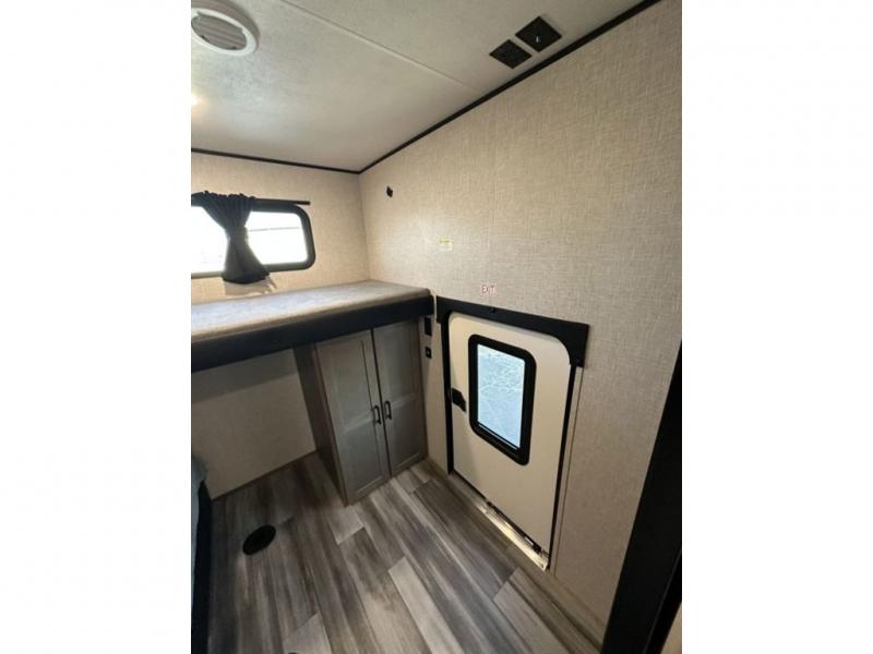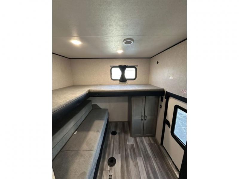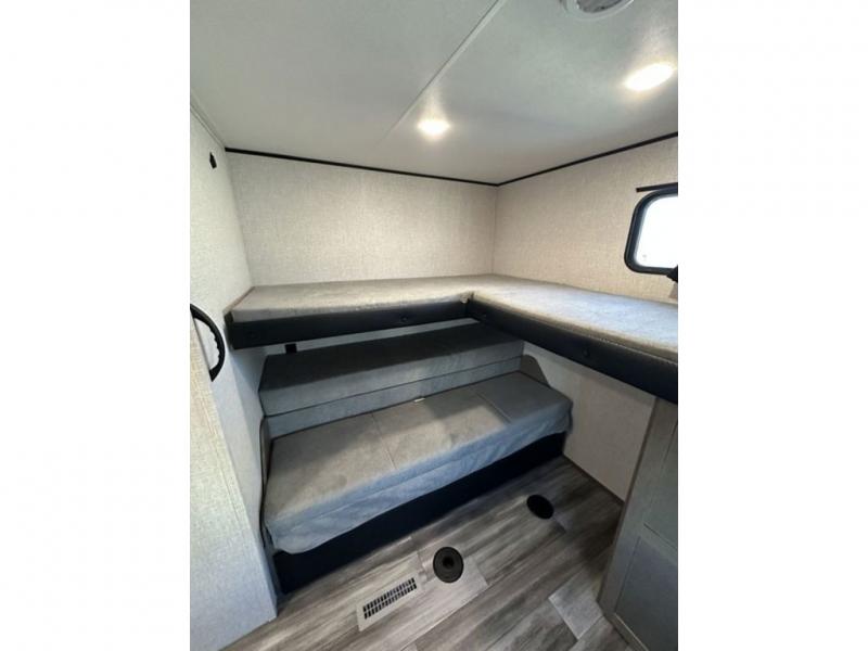 Spacious, accommodating, comfortable; start camping in this trailer that offers something for everyone! The popular bunkhouse offers two 31" x 75" bunk beds above a convertible sofa with 60" x 75" queen mattress, a wardrobe, and a cargo door for easy access. The kitchen provides full amenities to make delicious home cooked meals. The U-shaped dinette and Jack-knife sofa slide give you more floor space to stretch out and provide extra sleeping space, plus you will appreciate the bench/storage as you walk into the trailer. And the large pantry will hold all the goodies for the big group. The front bedroom gives you a 60" x 75" queen bed to sleep on, dual wardrobes and an overhead shelf to place your clothing and things, plus a space saving door to close for privacy.