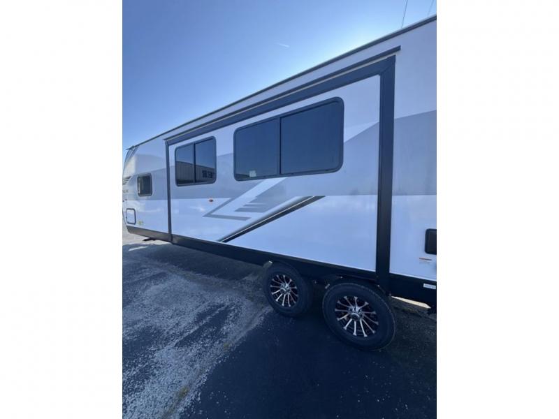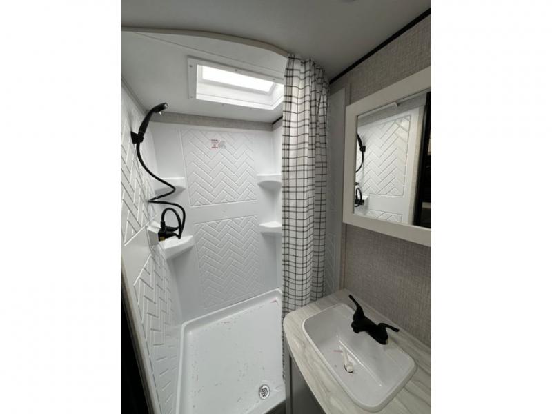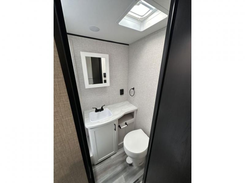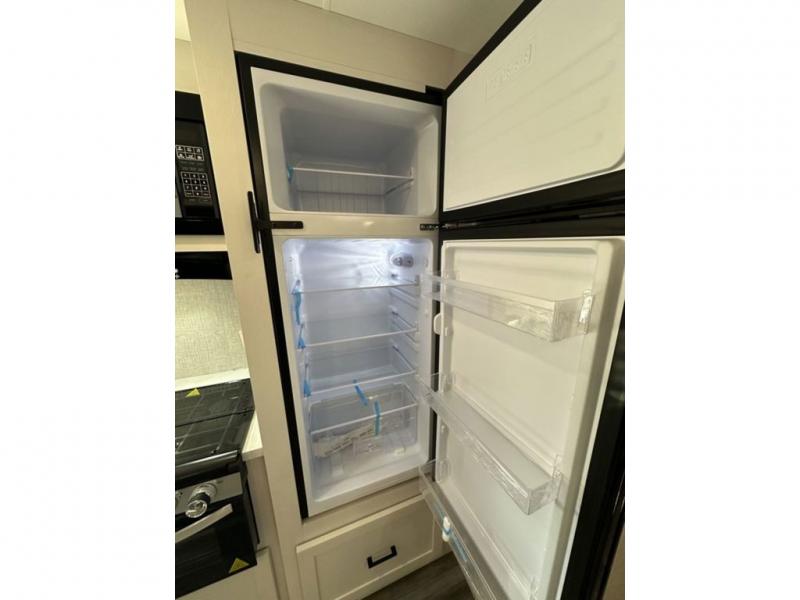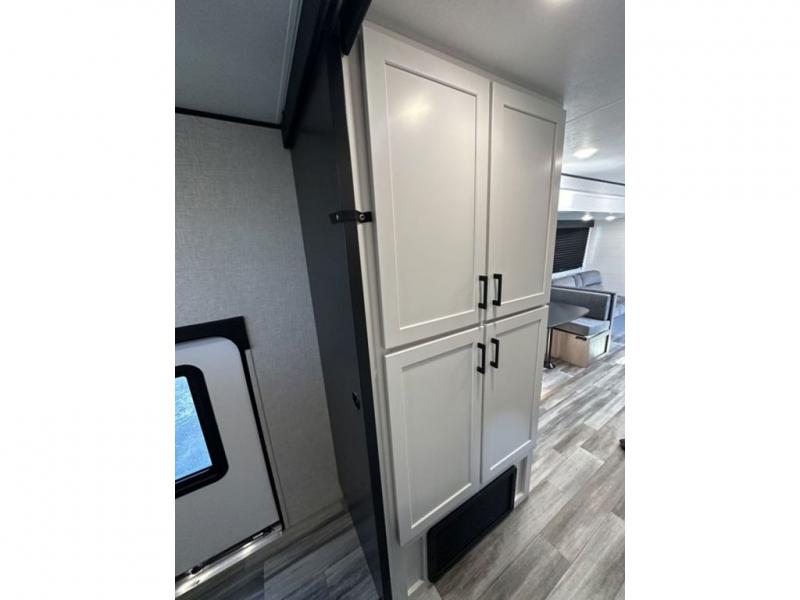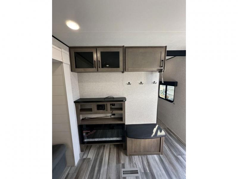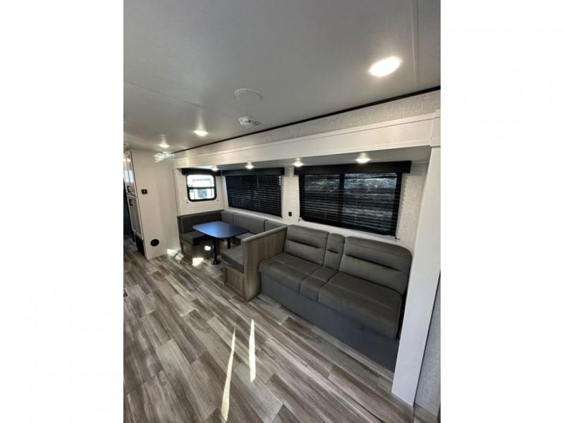 Spacious, accommodating, comfortable; start camping in this trailer that offers something for everyone! The popular bunkhouse offers two 31" x 75" bunk beds above a convertible sofa with 60" x 75" queen mattress, a wardrobe, and a cargo door for easy access. The kitchen provides full amenities to make delicious home cooked meals. The U-shaped dinette and Jack-knife sofa slide give you more floor space to stretch out and provide extra sleeping space, plus you will appreciate the bench/storage as you walk into the trailer. And the large pantry will hold all the goodies for the big group. The front bedroom gives you a 60" x 75" queen bed to sleep on, dual wardrobes and an overhead shelf to place your clothing and things, plus a space saving door to close for privacy.