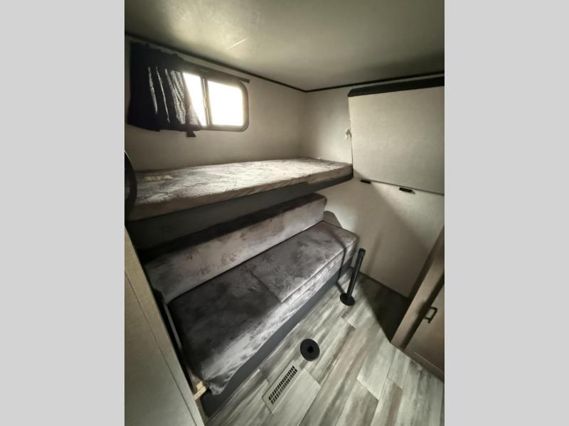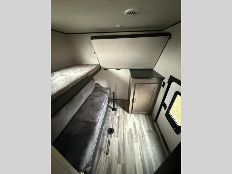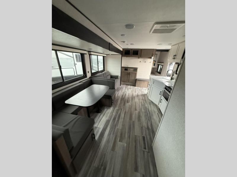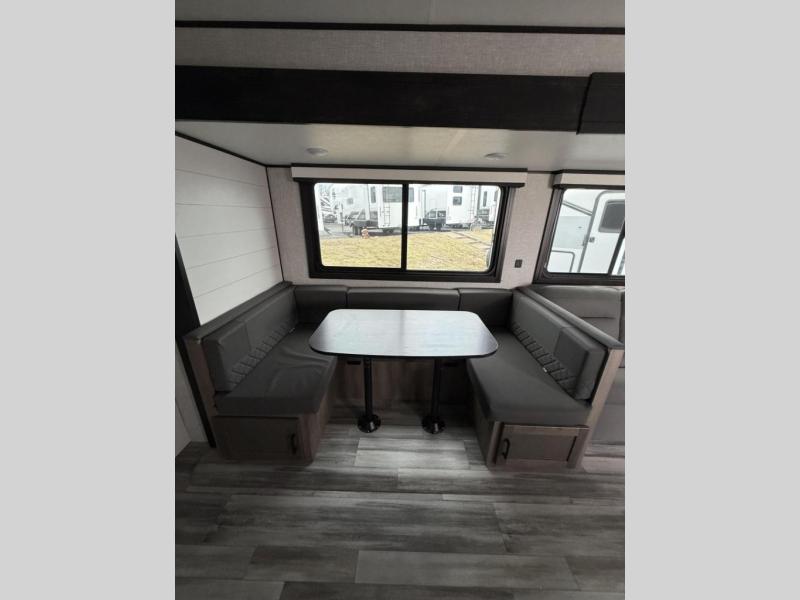 On top of that storage space, are superior and professionally designed pieces of furniture. Jack-knife sofas come with arm bolsters and pull-down center armrests with cupholders. Many floorplans offer different furniture options such as a tri-fold sofas and theater seating. The new MY25 fabric is stain resistant with an added protectant to keep your Jay Flight furniture looking new. This fabric is thoroughly tested and must pass the 50,000 double rub tests. The 4” high-density foam dinette cushions are designed for comfort and won’t break down over time.