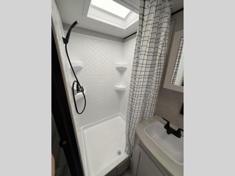 You’ll also notice the top-of-the-line InVision appliances that feature a 10-cubic-foot 12V refrigerator with a convenient bottom freezer and adjustable shelves. Matching is an overhead microwave, a three-burner stove top and an electronic temperature-controlled oven. Equally as impressive as the features previously listed, are the unseen amenities such as the 60,000 BTU on-demand tankless water heater that offers an endless supply of hot water. The oversized 52-gallon freshwater tank is roughly 25% larger than the competition.
