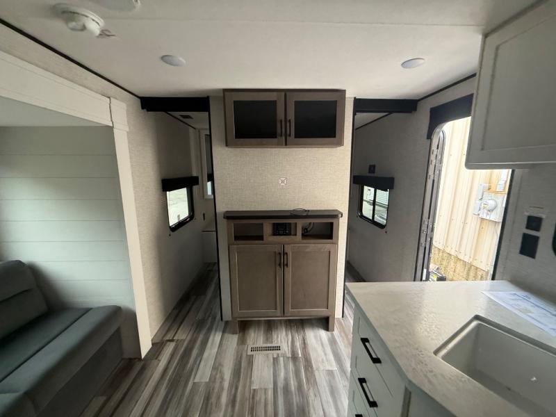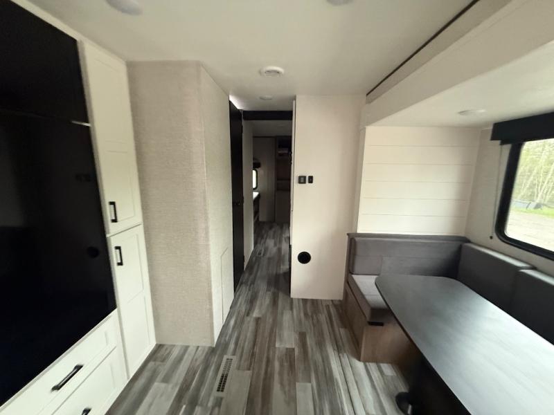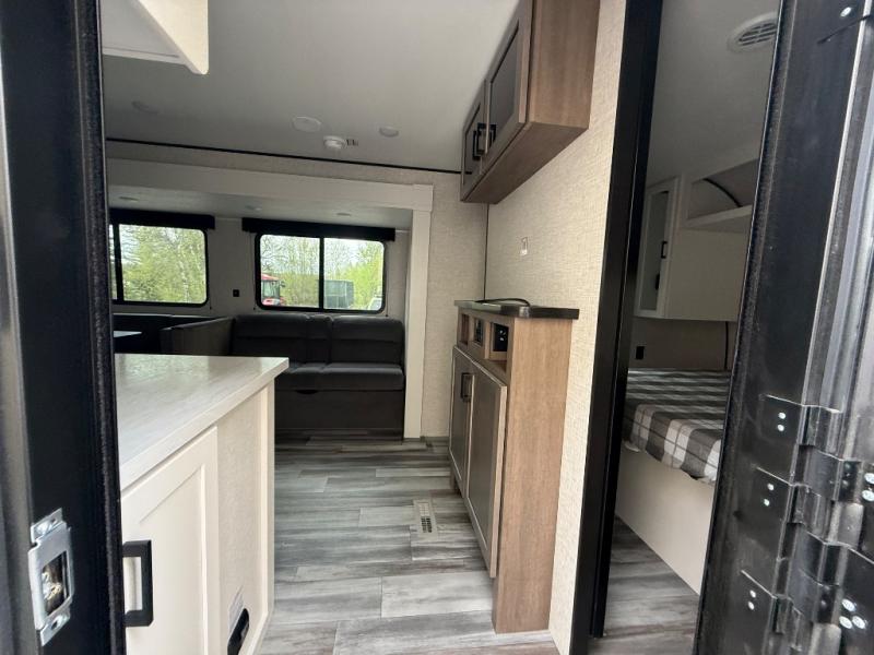 The whole gang can join along on camping trips in this double slide out travel trailer! There is a rear private bunkhouse with a bunk bed and J-cube futon sofa below plus two additional bunks across the room. You'll find your own space in the front private bedroom, which also includes an RV queen bed and dual wardrobes. The middle kitchen and living room will be a favorite place to come together since there is a jack-knife sofa and U-shaped dinette plus a fully-equipped kitchen to make meals each day. This model also includes a full bath with one of the dual entry doors for added convenience!
