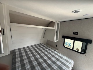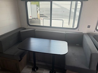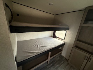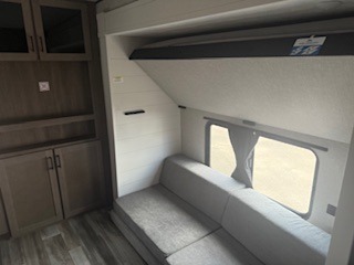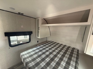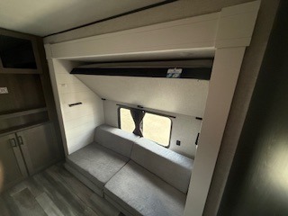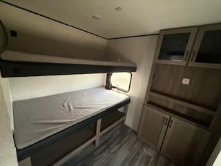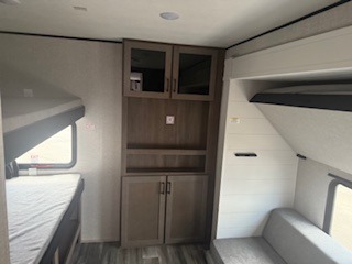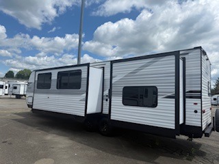The whole gang can join along on camping trips in this double slide out travel trailer! There is a rear private bunkhouse with a bunk bed and J-cube futon sofa below plus two additional bunks across the room. You'll find your own space in the front private bedroom, which also includes an RV queen bed and dual wardrobes. The middle kitchen and living room will be a favorite place to come together since there is a jack-knife sofa and U-shaped dinette plus a fully-equipped kitchen to make meals each day. This model also includes a full bath with one of the dual entry doors for added convenience!