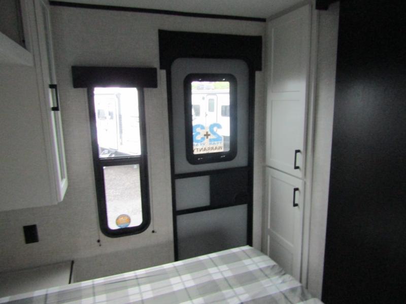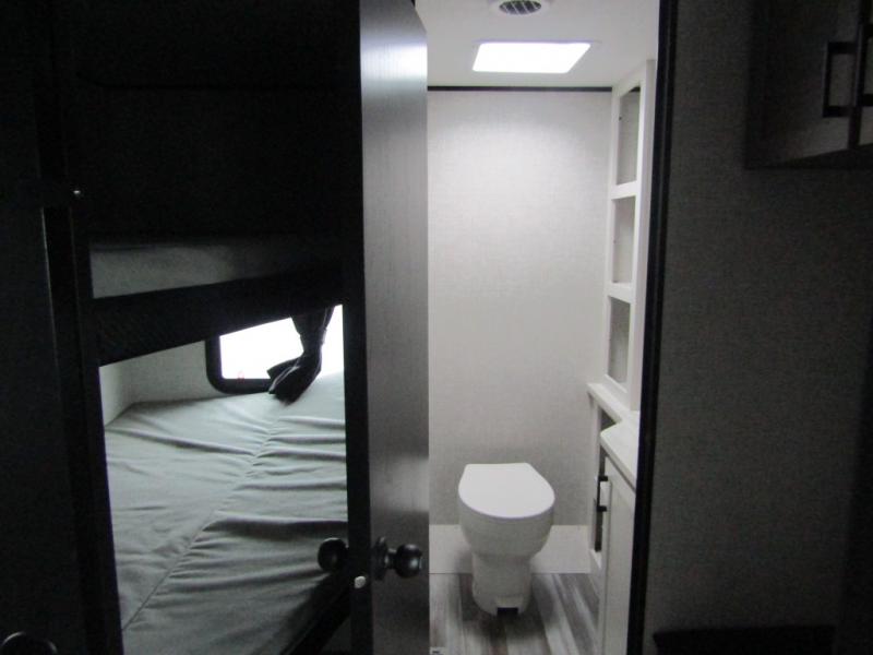 It's time to ditch that old tent and upgrade to this spacious travel trailer! The littles ones or your guests will love the double-size bunks in the rear bunkhouse, along with a half bath and storage space for their things. You'll enjoy the front private bedroom all to yourselves with a queen bed and dual wardrobes, and the full bath is close by for easy nighttime use. A U-shaped dinette slide and sofa in the main living area provide your crew with space to relax and dine together, and the fully equipped kitchen lets you cook up your best meals. Outside, you'll find exterior storage, a 20' power awning, plus an exterior refrigerator, LP Quick Connect, and an exterior spray port!