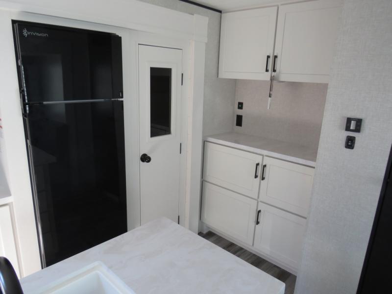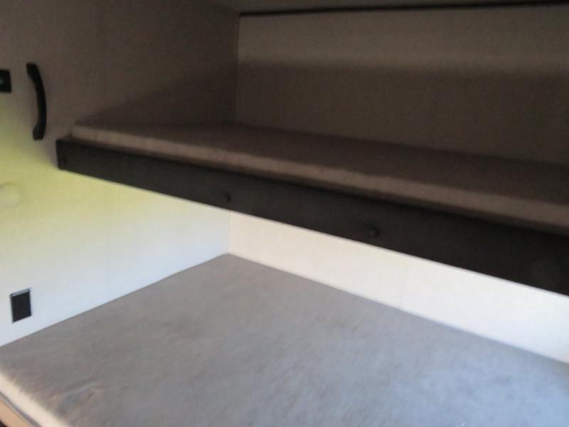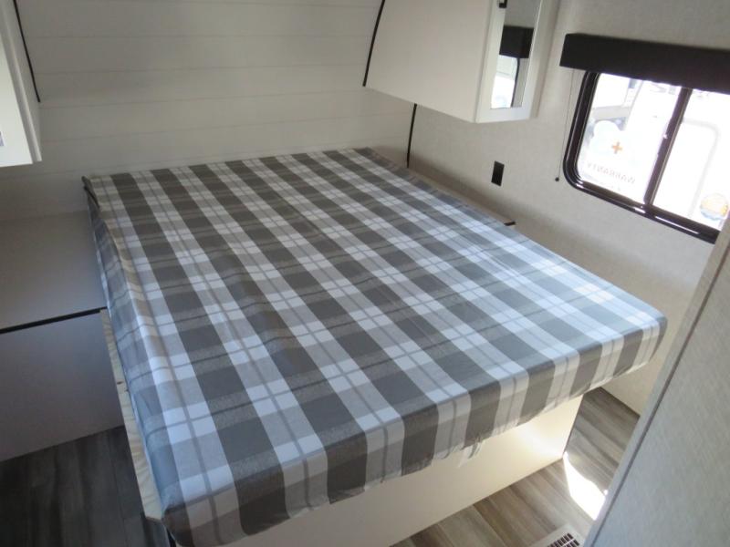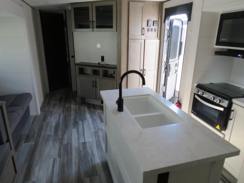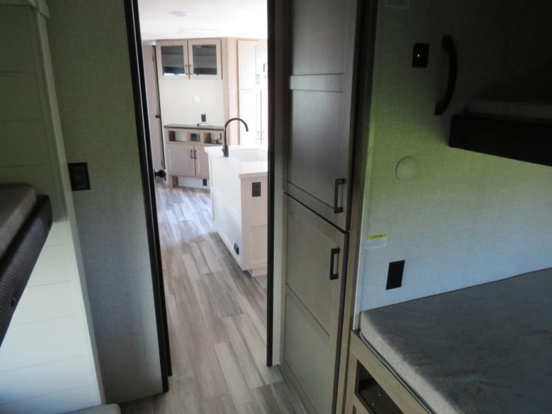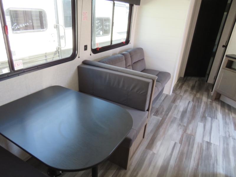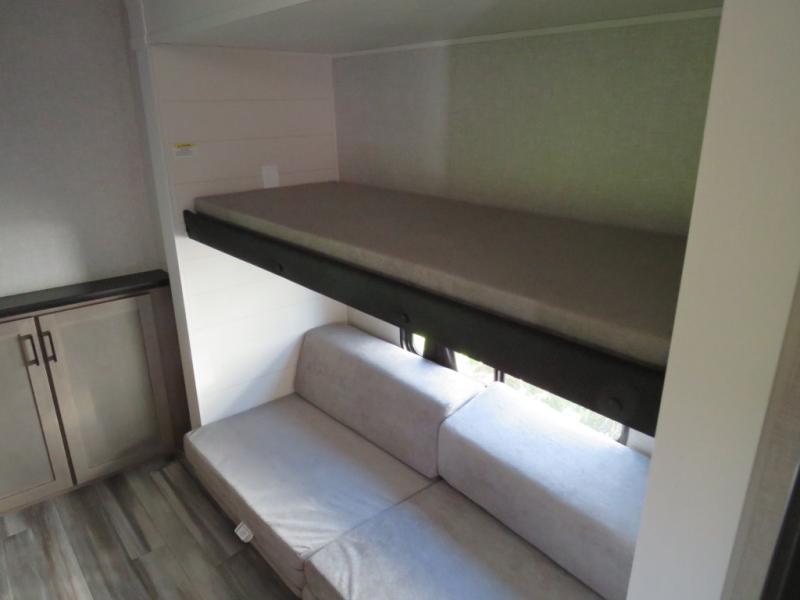 The whole gang can join along on camping trips in this triple slide out travel trailer! There is a rear private bunkhouse with a bunk bed and J-cube futon sofa below plus a second bunk bed and storage below to help keep this space tidy. You'll find your own space in the front private bedroom, which also includes a queen bed and dual wardrobes. The middle kitchen and living room will be a favorite place to come together since there is a jack-knife sofa and booth dinette, a kitchen island, plus a fully-equipped kitchen to make meals each day. There is also an exterior camp kitchen when you want fresh air!