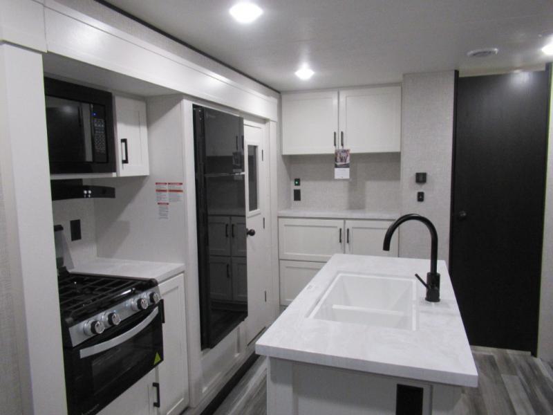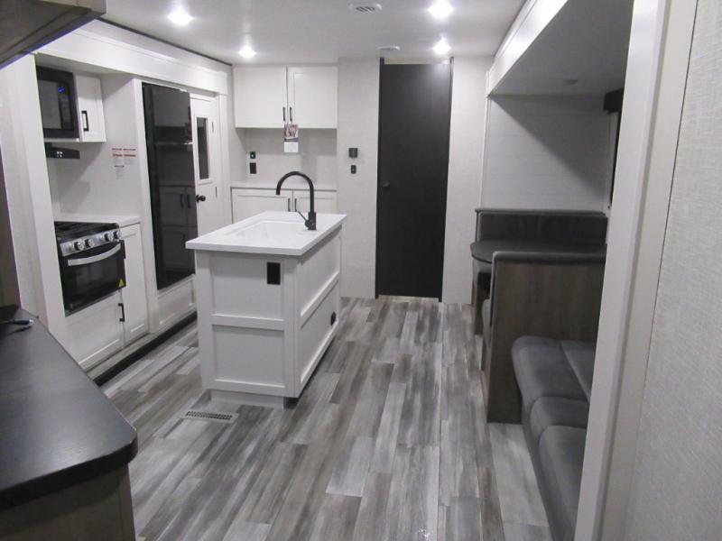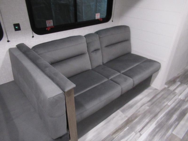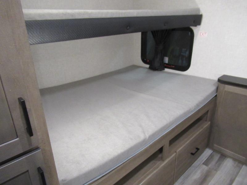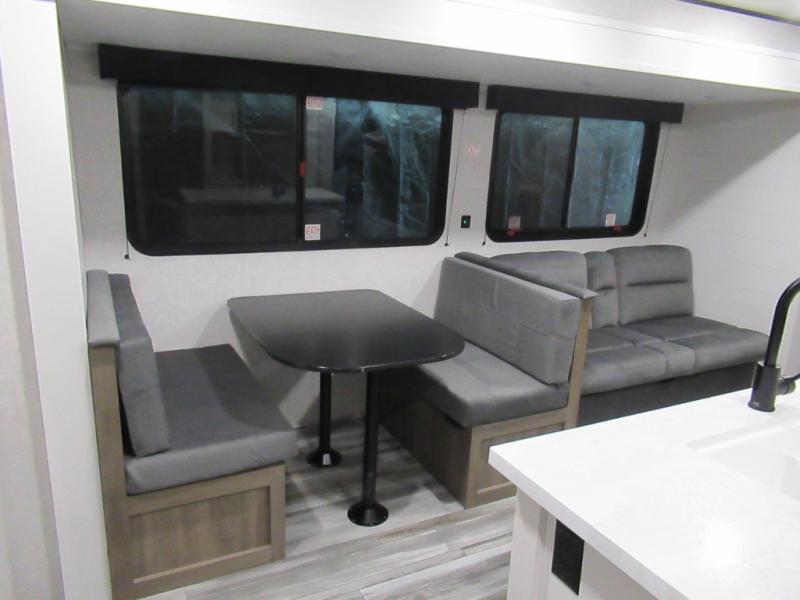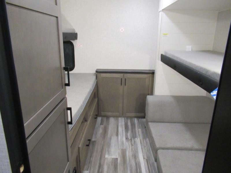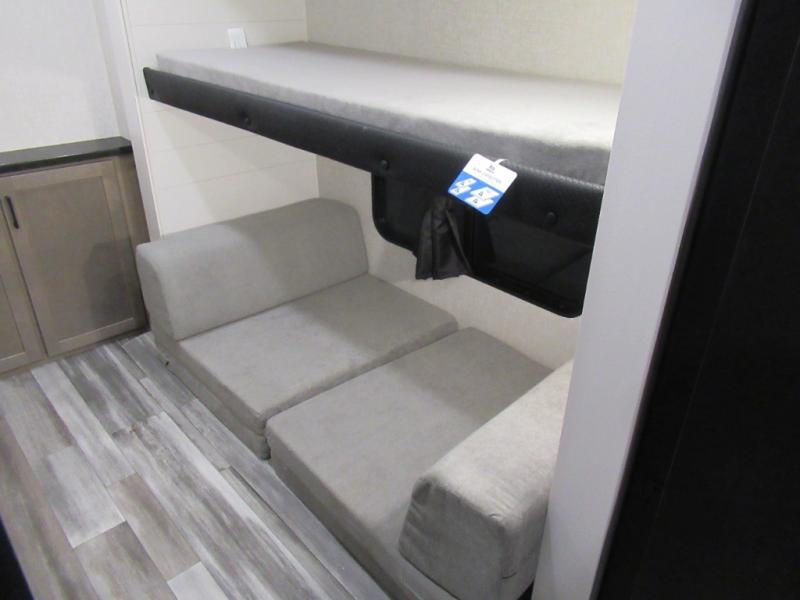 The whole gang can join along on camping trips in this triple slide out travel trailer! There is a rear private bunkhouse with a bunk bed and J-cube futon sofa below plus a second bunk bed and storage below to help keep this space tidy. You'll find your own space in the front private bedroom, which also includes a queen bed and dual wardrobes. The middle kitchen and living room will be a favorite place to come together since there is a jack-knife sofa and booth dinette, a kitchen island, plus a fully-equipped kitchen to make meals each day. There is also an exterior camp kitchen when you want fresh air!