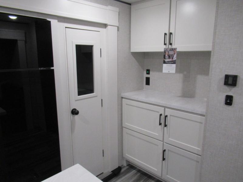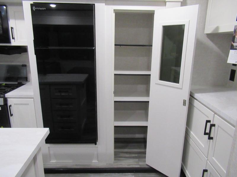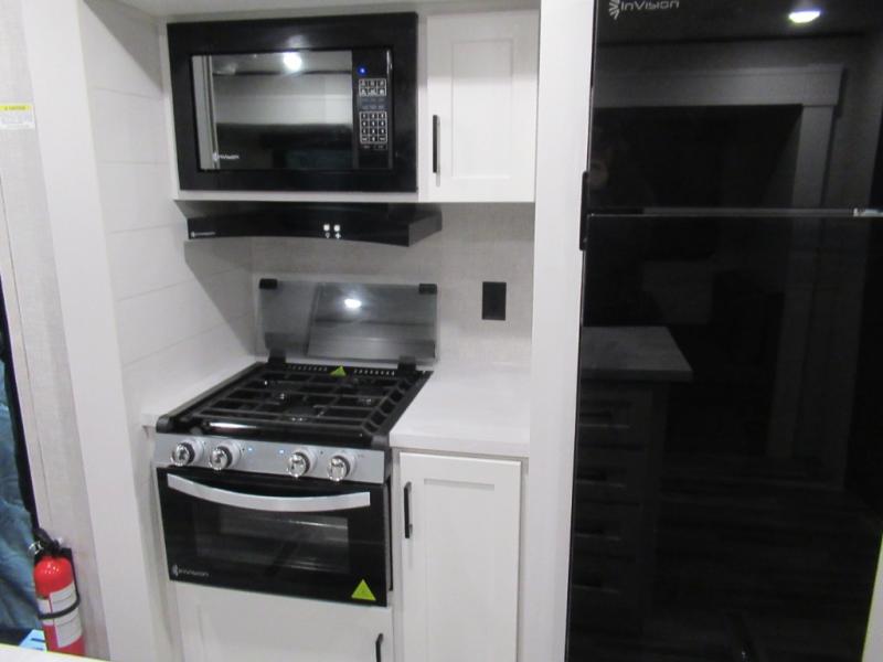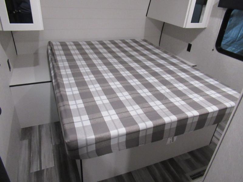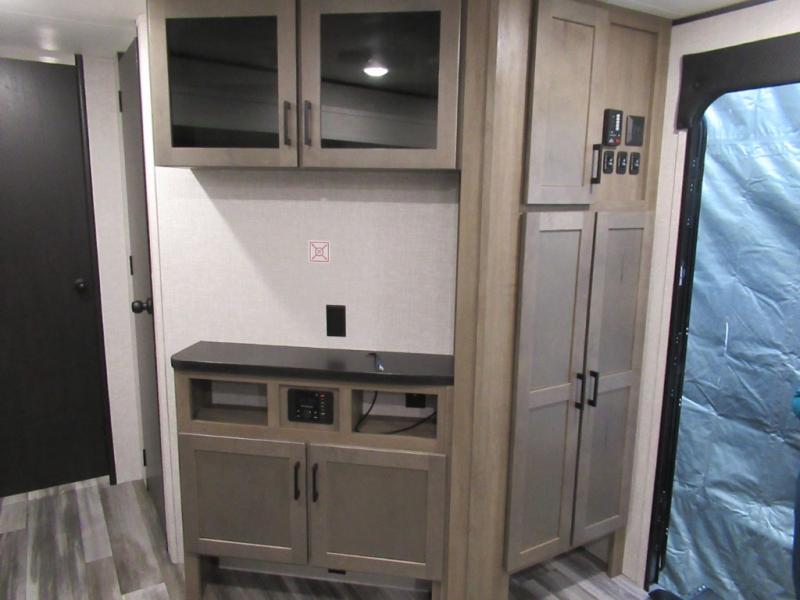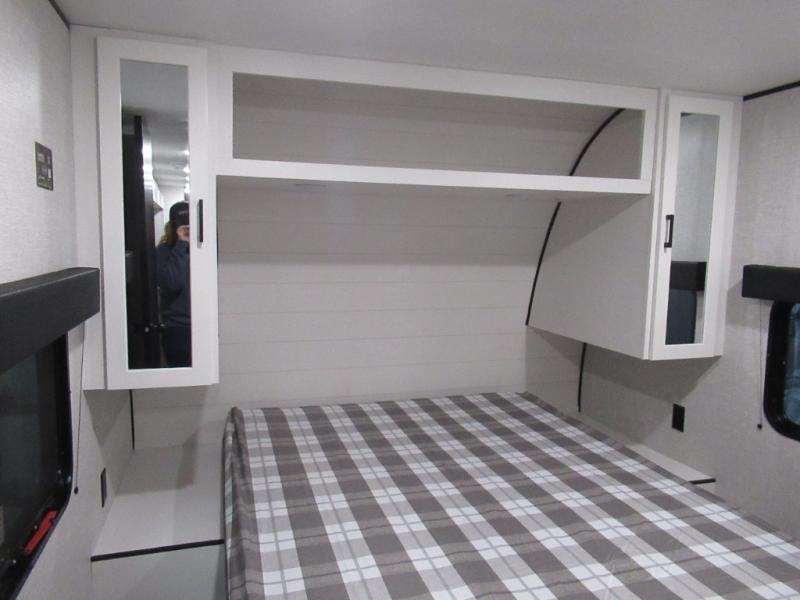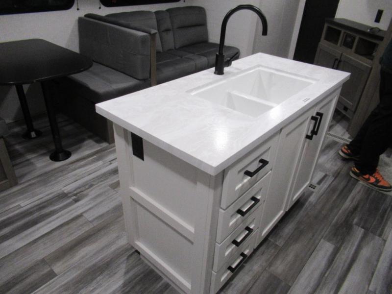The whole gang can join along on camping trips in this triple slide out travel trailer! There is a rear private bunkhouse with a bunk bed and J-cube futon sofa below plus a second bunk bed and storage below to help keep this space tidy. You'll find your own space in the front private bedroom, which also includes a queen bed and dual wardrobes. The middle kitchen and living room will be a favorite place to come together since there is a jack-knife sofa and booth dinette, a kitchen island, plus a fully-equipped kitchen to make meals each day. There is also an exterior camp kitchen when you want fresh air!
