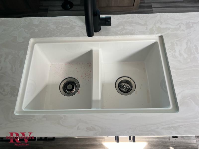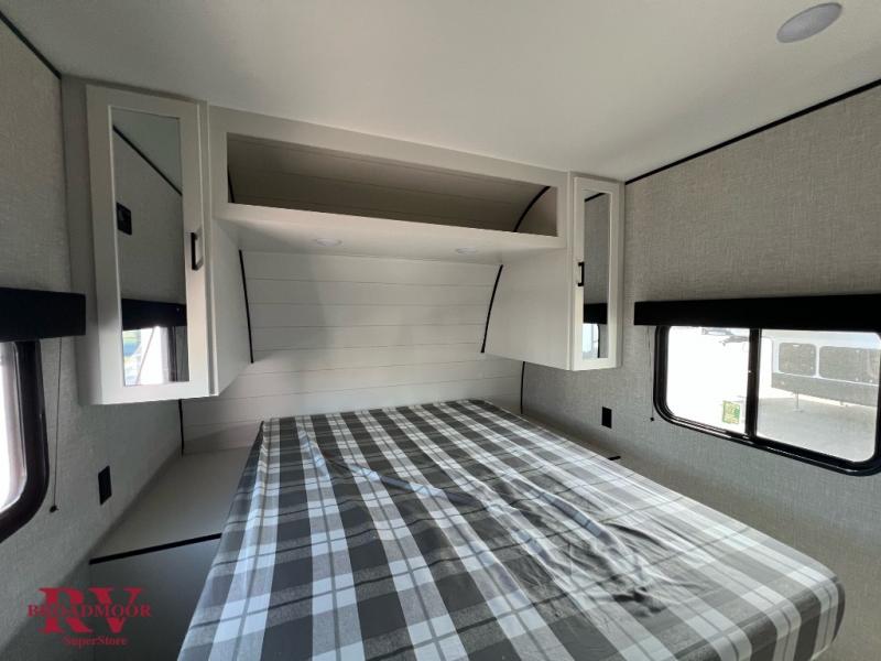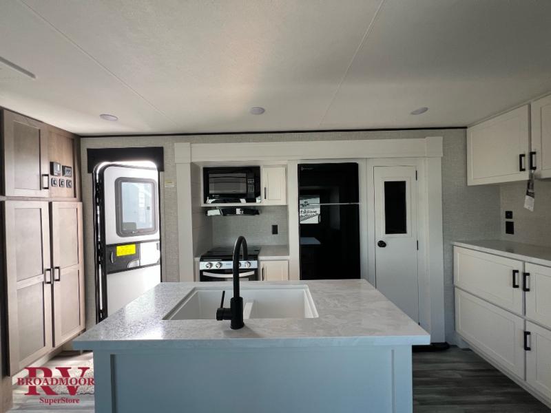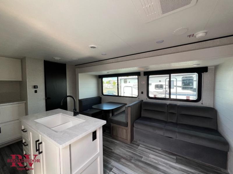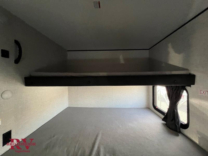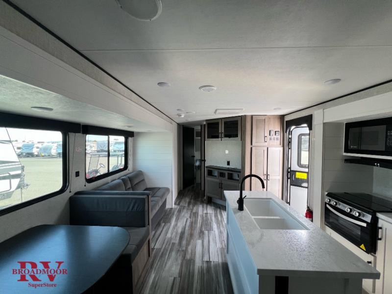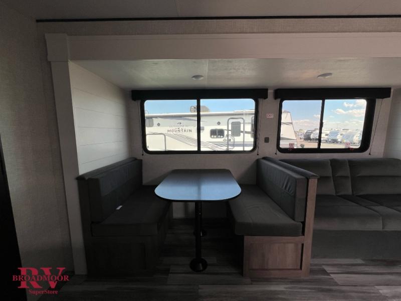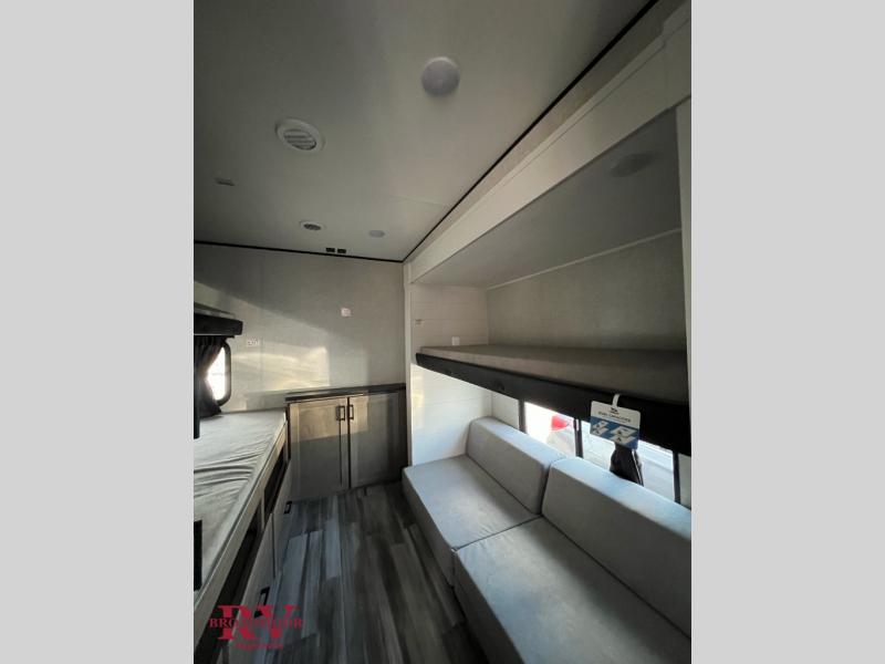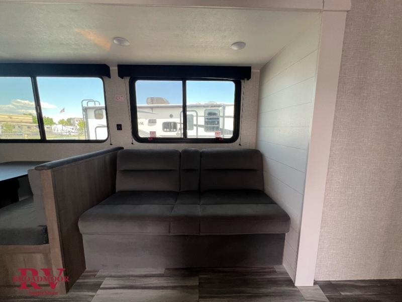 The whole gang can join along on camping trips in this triple slide out travel trailer! There is a rear private bunkhouse with a bunk bed and J-cube futon sofa below plus a second bunk bed and storage below to help keep this space tidy. You'll find your own space in the front private bedroom, which also includes a queen bed and dual wardrobes. The middle kitchen and living room will be a favorite place to come together since there is a jack-knife sofa and booth dinette, a kitchen island, plus a fully-equipped kitchen to make meals each day. There is also an exterior camp kitchen when you want fresh air!