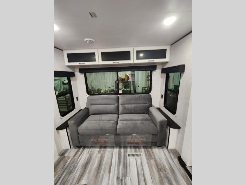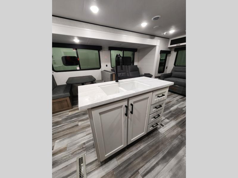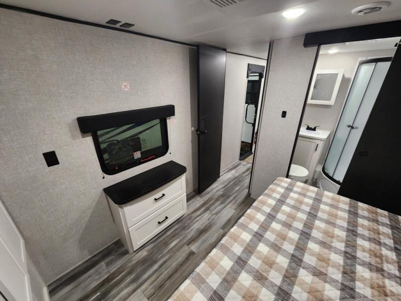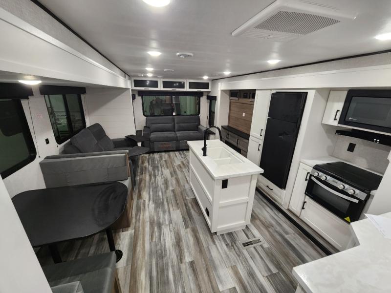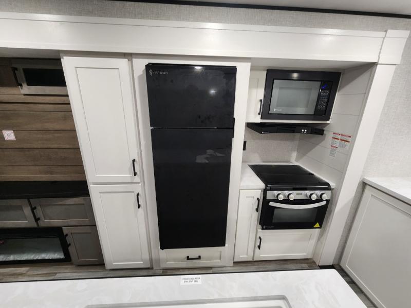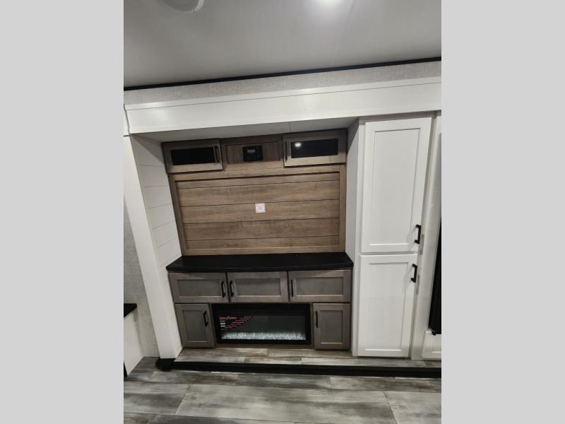 Enjoy a relaxing weekend getaway in this travel trailer! The dual entry bathroom with radius shower creates a front master suite with a queen bed slide, a dresser, and a front large wardrobe with storage space plus washer and dryer prep. The chef will have an easy time preparing their best home cooked meals with the kitchen island, hutch, three burner cooktop, and 12V refrigerator. Enjoy your meals at the booth dinette then play a card game or transform it into an extra sleeping space. The rear living area has a rear Jack-knife sofa for a quick afternoon nap and theater seating across from the entertainment center with a fireplace for the perfect spot on movie night!