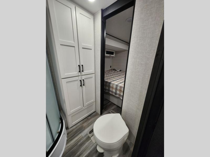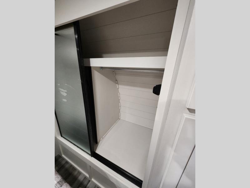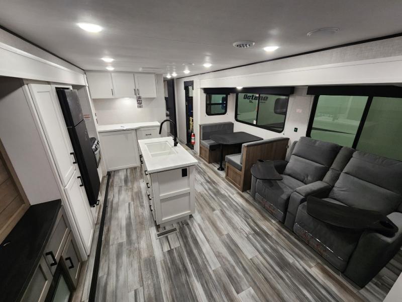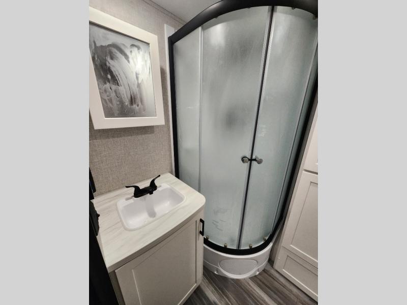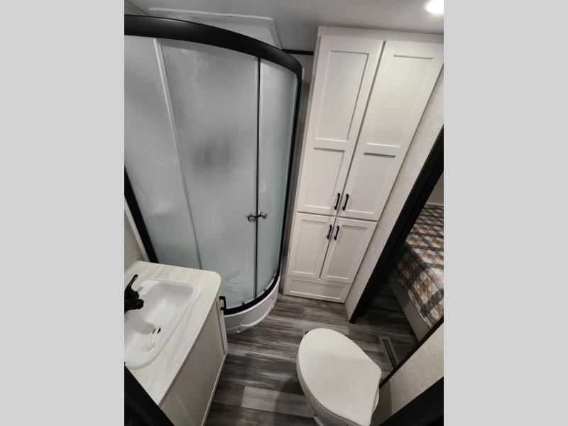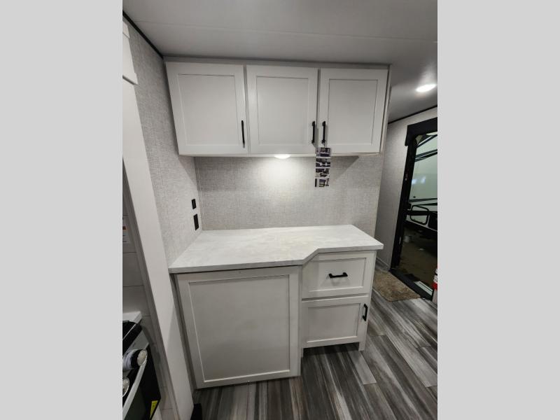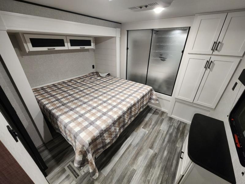 Enjoy a relaxing weekend getaway in this travel trailer! The dual entry bathroom with radius shower creates a front master suite with a queen bed slide, a dresser, and a front large wardrobe with storage space plus washer and dryer prep. The chef will have an easy time preparing their best home cooked meals with the kitchen island, hutch, three burner cooktop, and 12V refrigerator. Enjoy your meals at the booth dinette then play a card game or transform it into an extra sleeping space. The rear living area has a rear Jack-knife sofa for a quick afternoon nap and theater seating across from the entertainment center with a fireplace for the perfect spot on movie night!