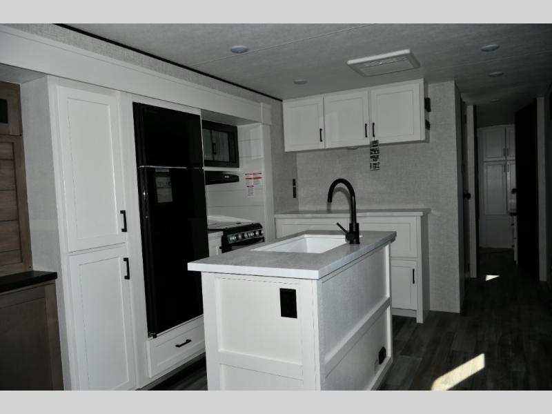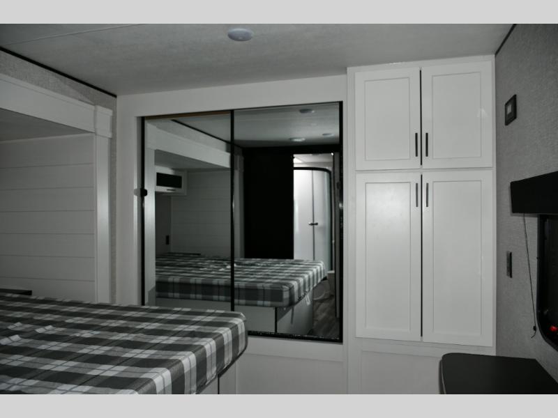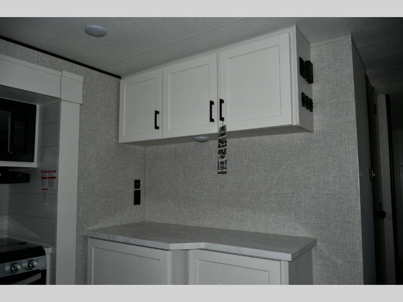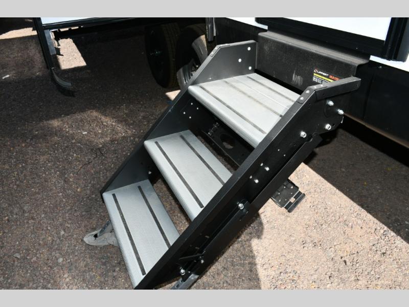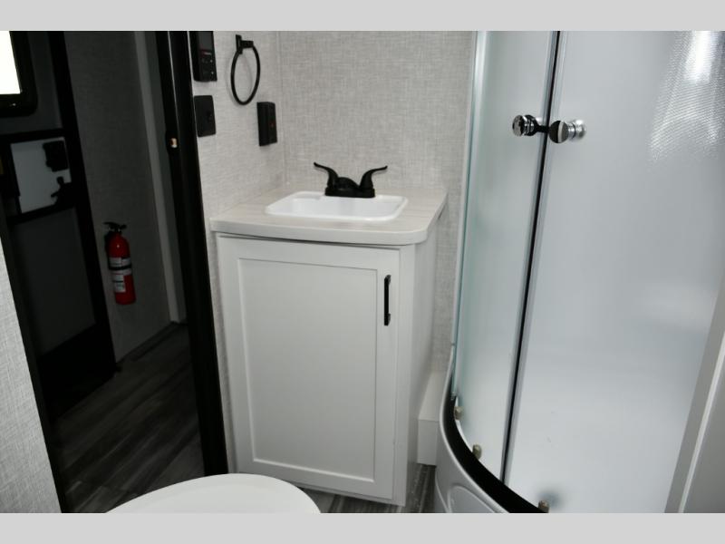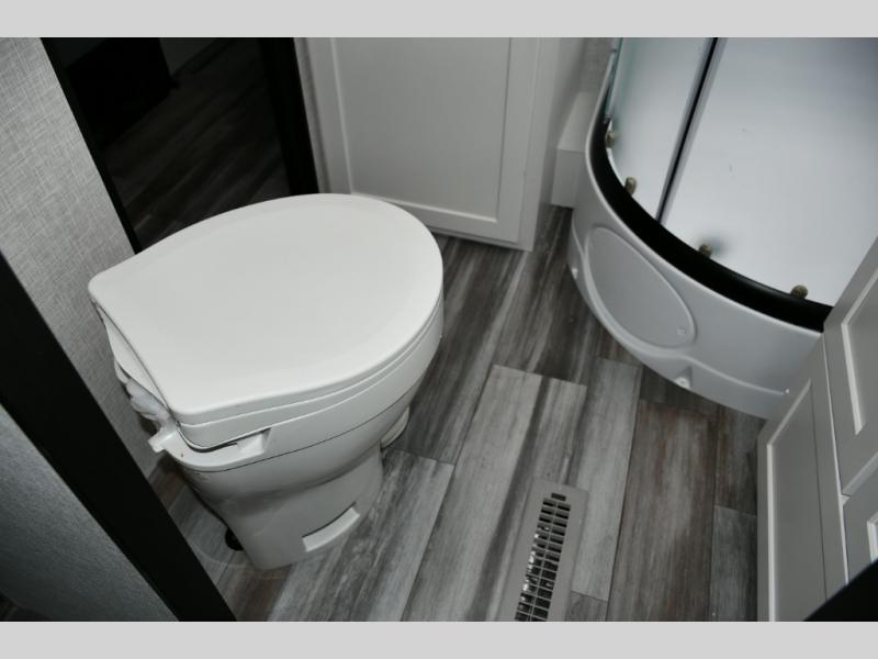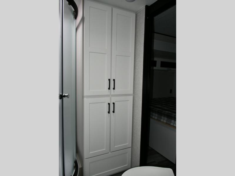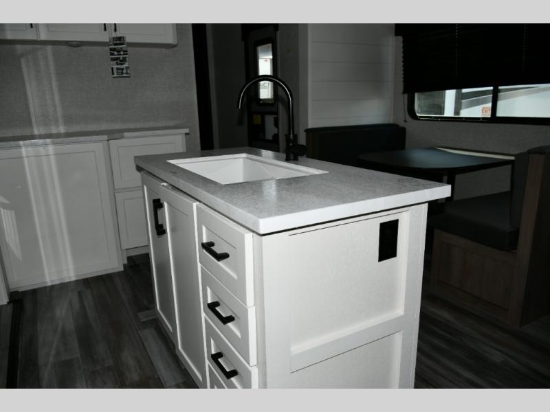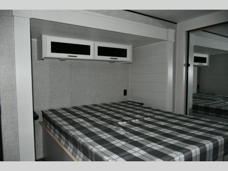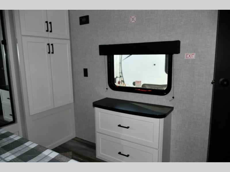 - Front Private Bedroom – Relax in a queen bed slide-out with a dresser and large front wardrobe featuring washer/dryer prep for long-term convenience.
