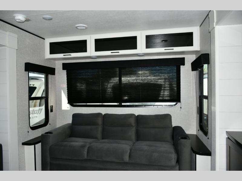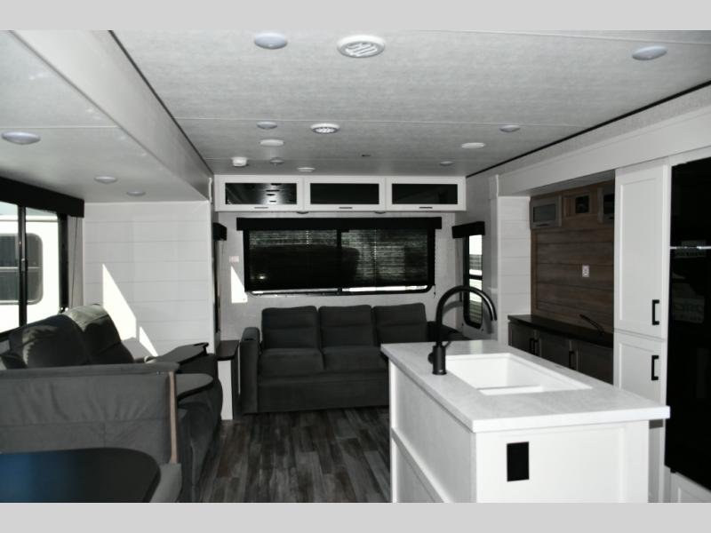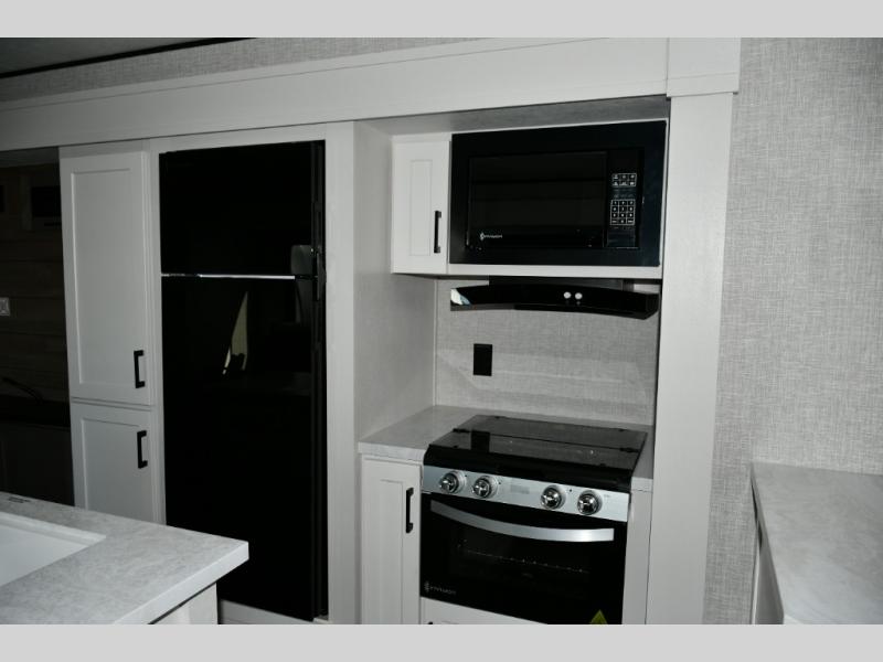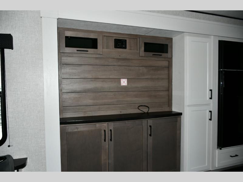 - Rear Living Area – Perfect for relaxing with a jackknife sofa and theater seating directly across from the entertainment center and fireplace.