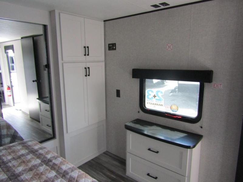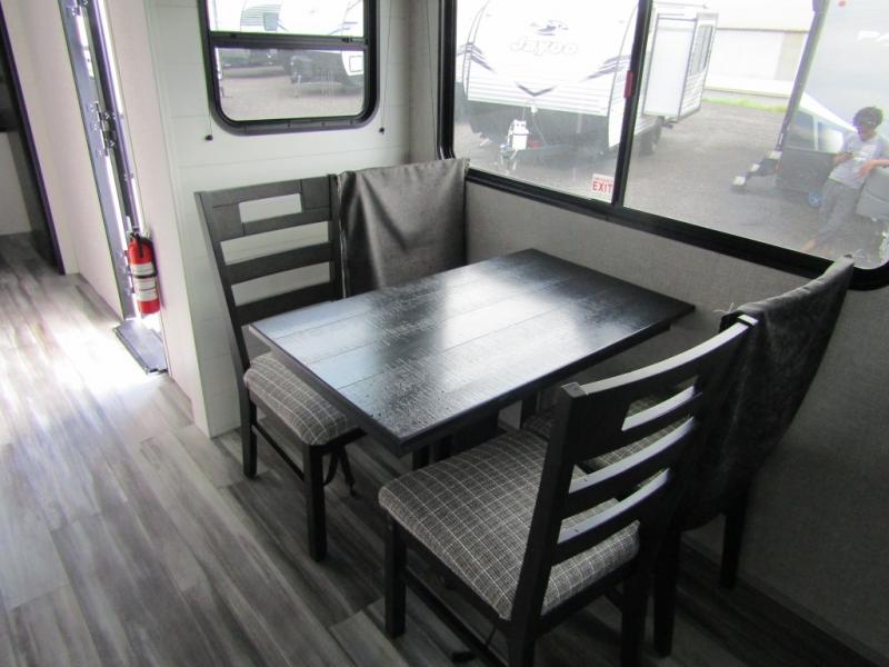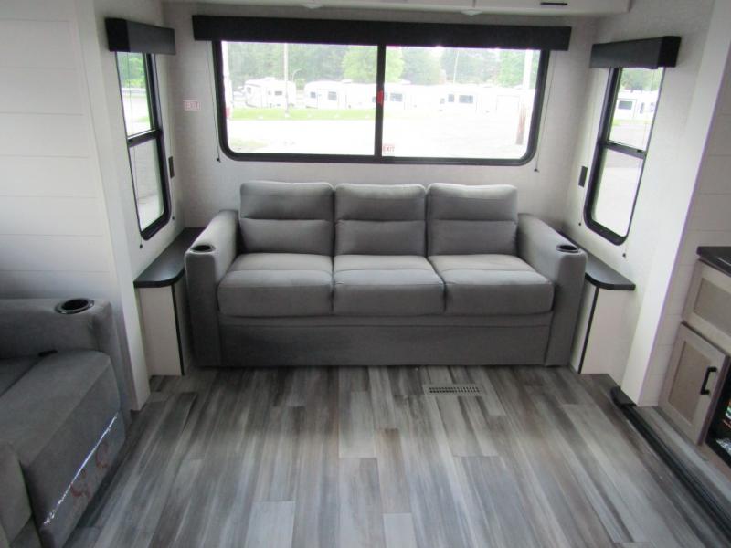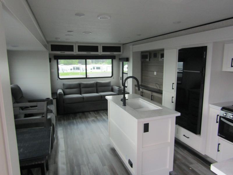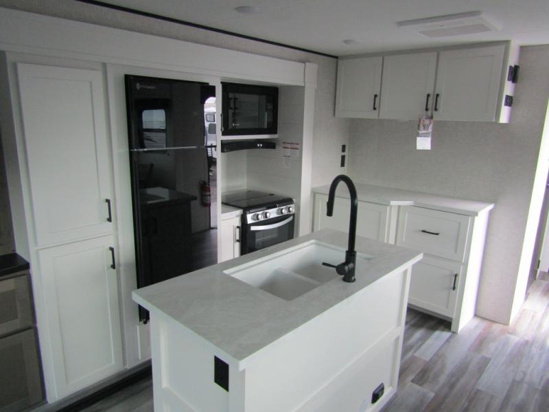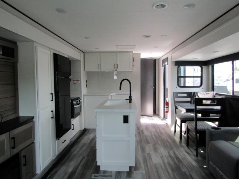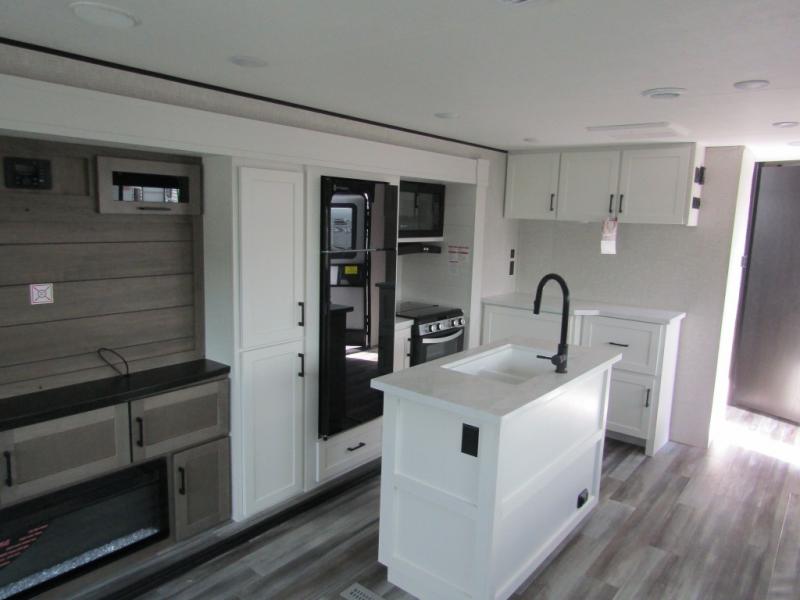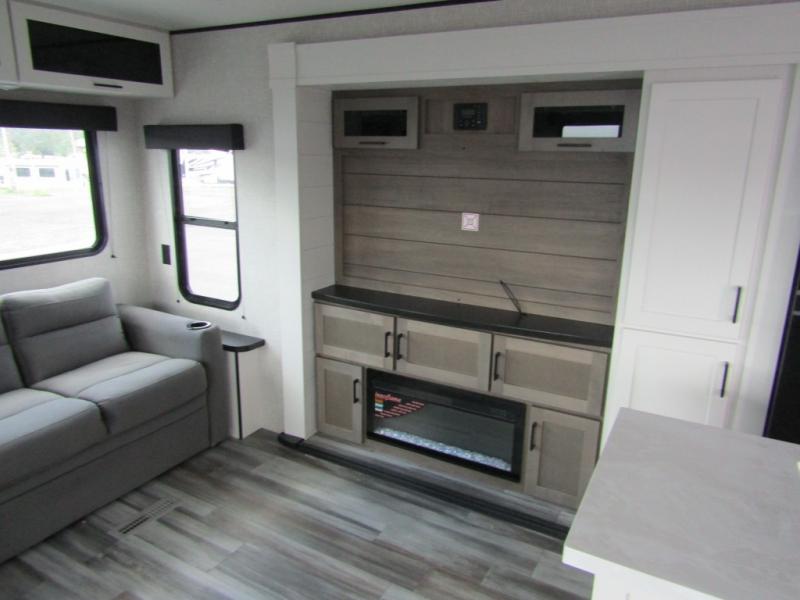 Enjoy a relaxing weekend getaway in this travel trailer! The dual entry bathroom with radius shower creates a front master suite with a queen bed slide, a dresser, and a front large wardrobe with storage space plus washer and dryer prep. The chef will have an easy time preparing their best home cooked meals with the kitchen island, hutch, three burner cooktop, and 12V refrigerator. Enjoy your meals at the booth dinette then play a card game or transform it into an extra sleeping space. The rear living area has a rear Jack-knife sofa for a quick afternoon nap and theater seating across from the entertainment center with a fireplace for the perfect spot on movie night!