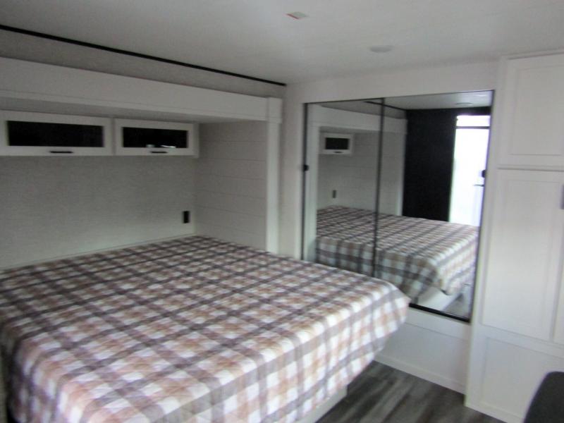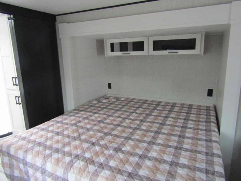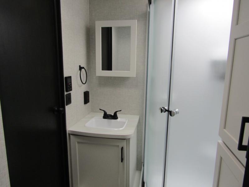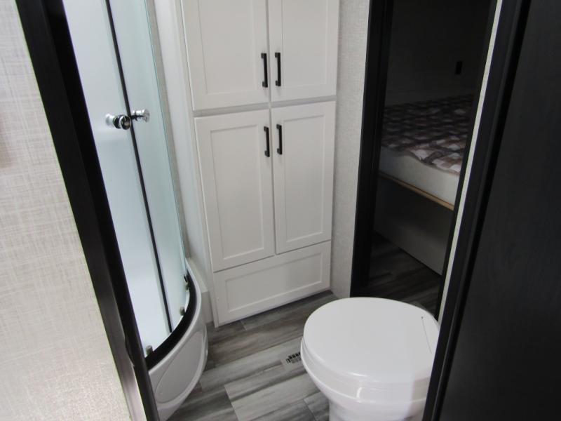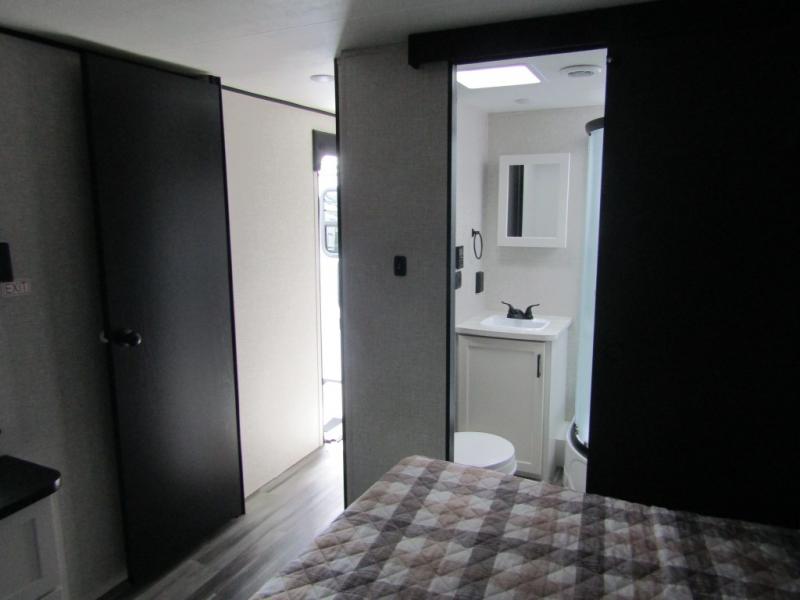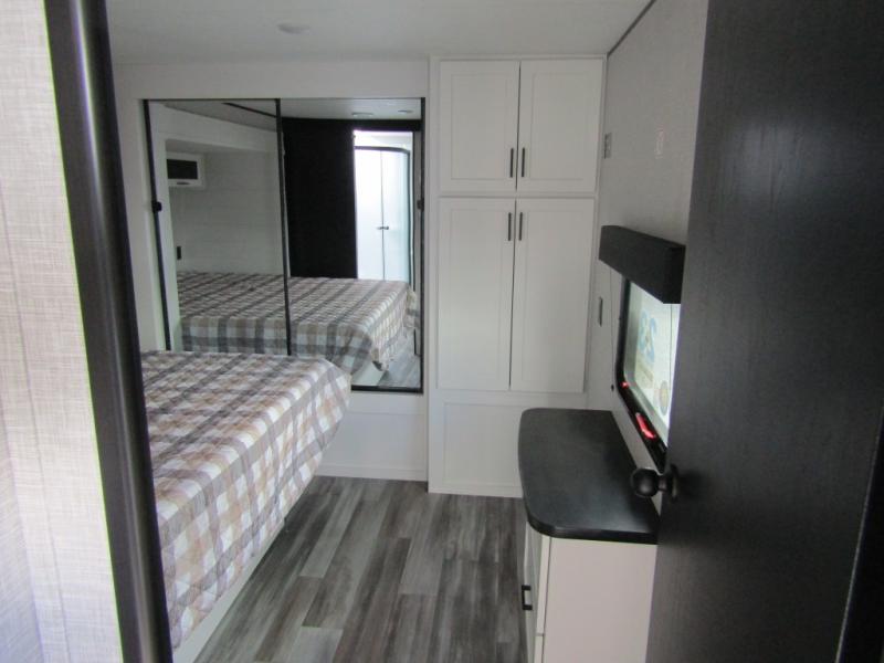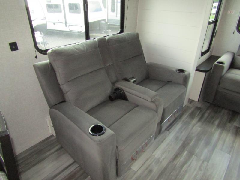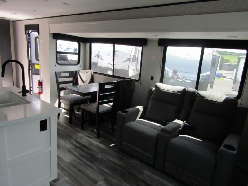 Enjoy a relaxing weekend getaway in this travel trailer! The dual entry bathroom with radius shower creates a front master suite with a queen bed slide, a dresser, and a front large wardrobe with storage space plus washer and dryer prep. The chef will have an easy time preparing their best home cooked meals with the kitchen island, hutch, three burner cooktop, and 12V refrigerator. Enjoy your meals at the booth dinette then play a card game or transform it into an extra sleeping space. The rear living area has a rear Jack-knife sofa for a quick afternoon nap and theater seating across from the entertainment center with a fireplace for the perfect spot on movie night!