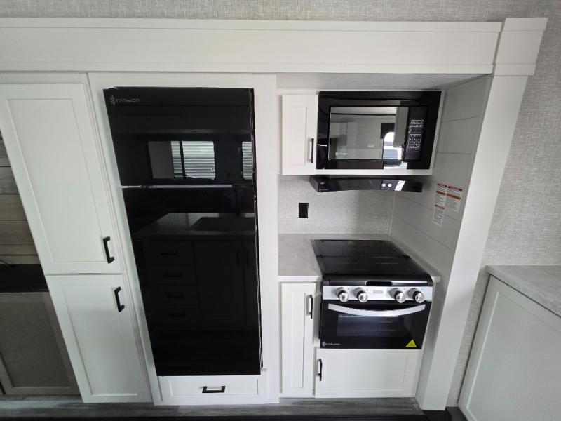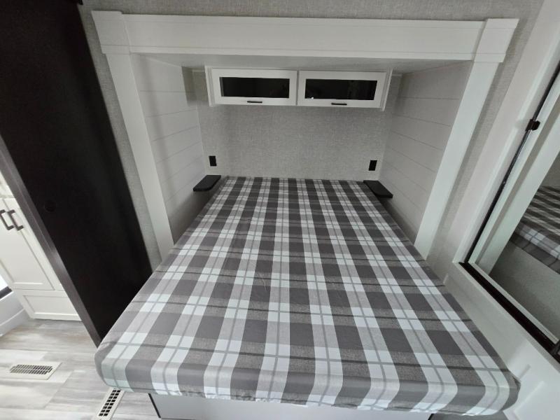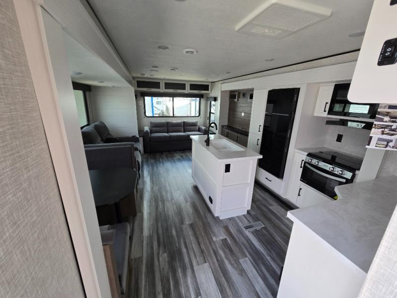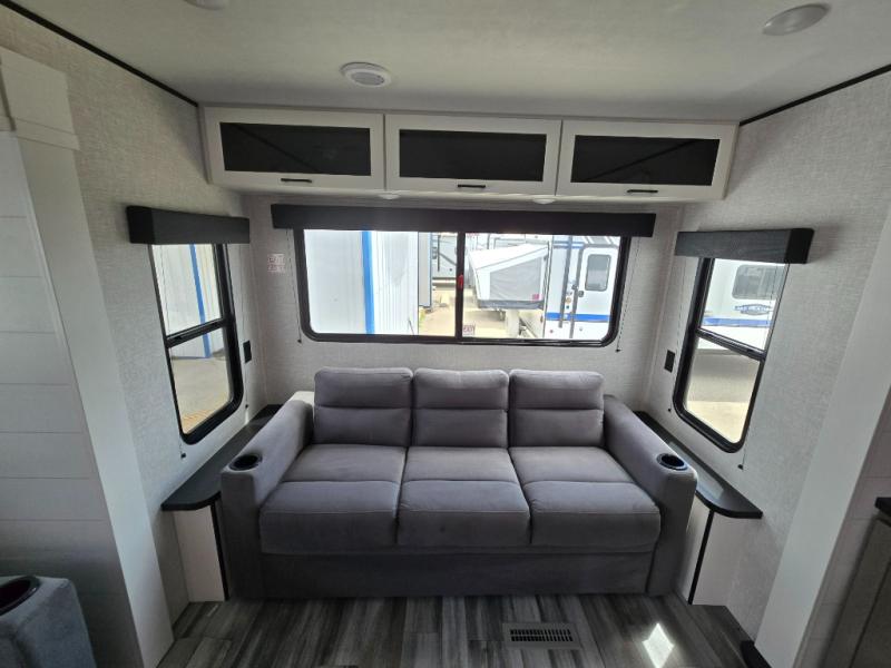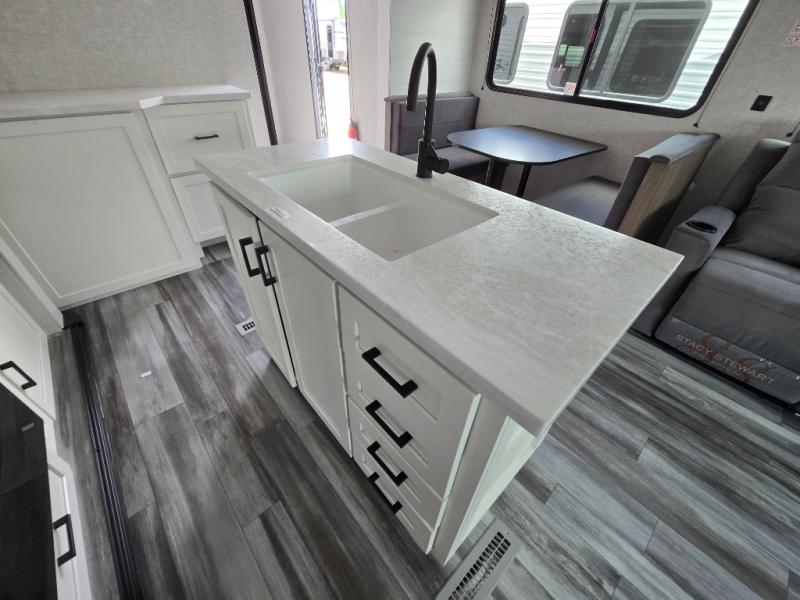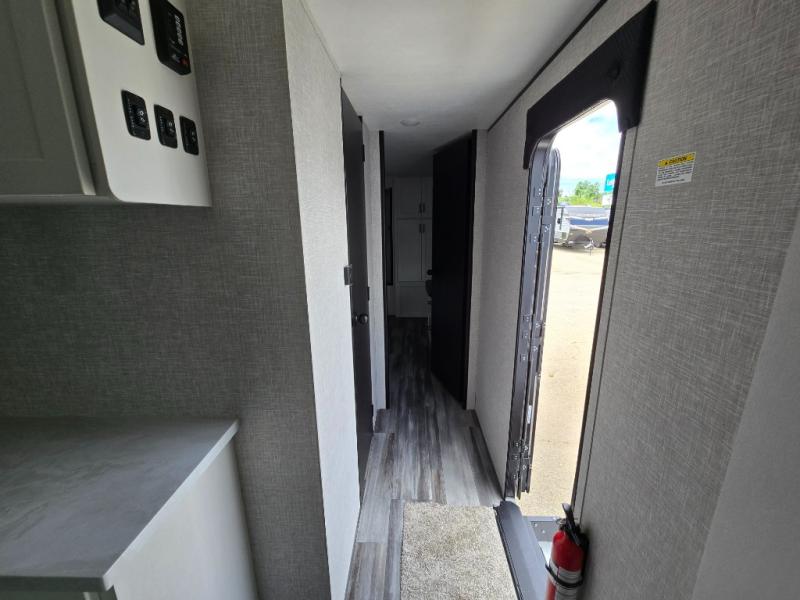 Enjoy a relaxing weekend getaway in this travel trailer! The dual entry bathroom with radius shower creates a front master suite with a queen bed slide, a dresser, and a front large wardrobe with storage space plus washer and dryer prep. The chef will have an easy time preparing their best home cooked meals with the kitchen island, hutch, three burner cooktop, and 12V refrigerator. Enjoy your meals at the booth dinette then play a card game or transform it into an extra sleeping space. The rear living area has a rear Jack-knife sofa for a quick afternoon nap and theater seating across from the entertainment center with a fireplace for the perfect spot on movie night!