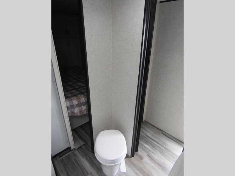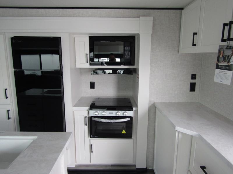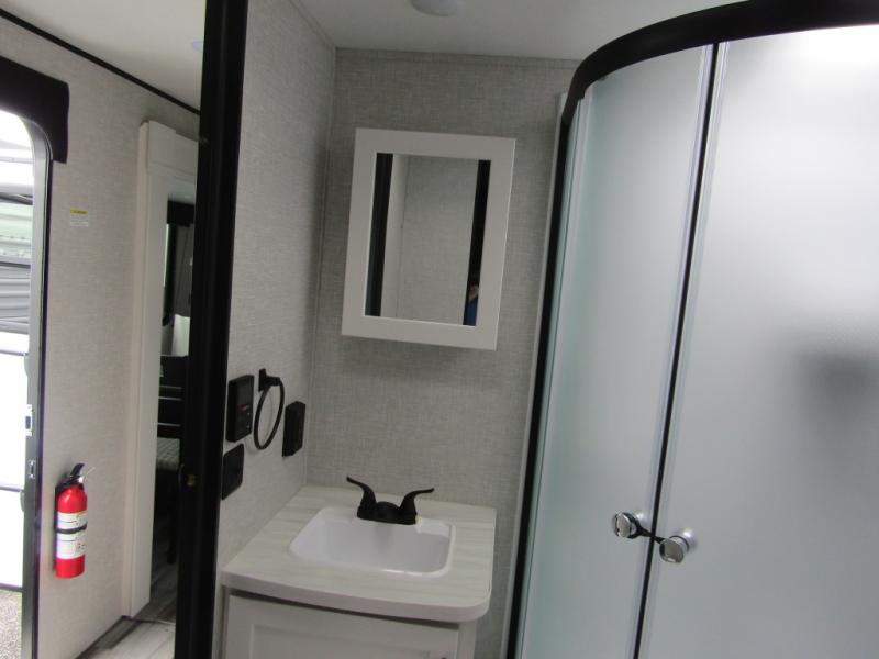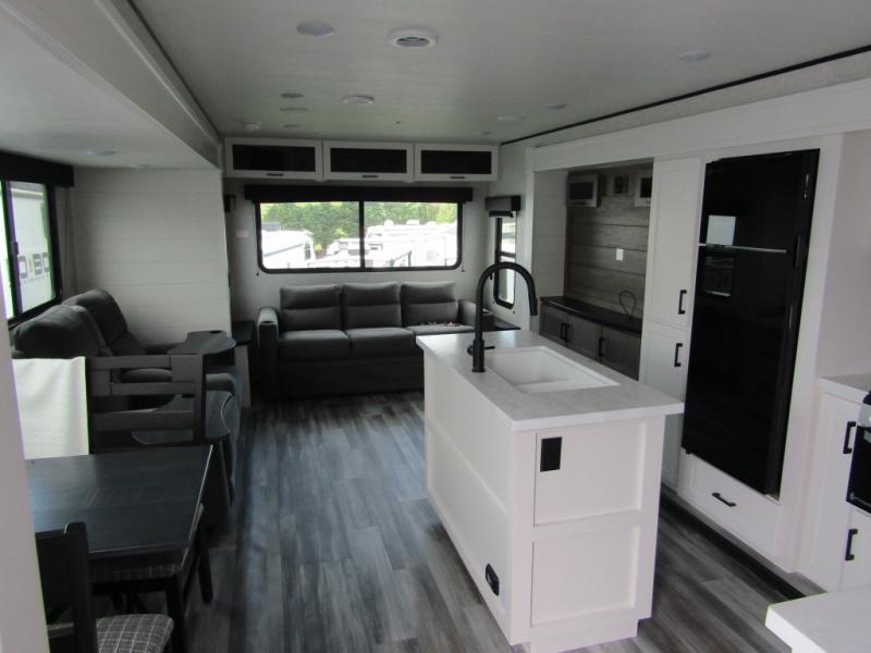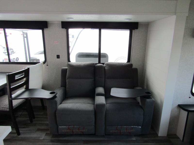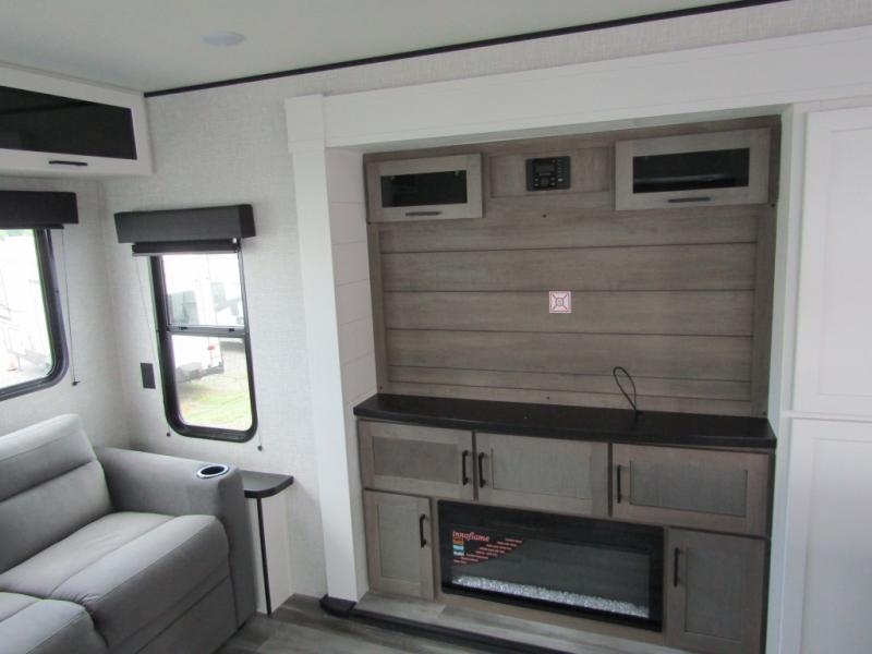 Enjoy a relaxing weekend getaway in this travel trailer! The dual entry bathroom with radius shower creates a front master suite with a queen bed slide, a dresser, and a front large wardrobe with storage space plus washer and dryer prep. The chef will have an easy time preparing their best home cooked meals with the kitchen island, hutch, three burner cooktop, and 12V refrigerator. Enjoy your meals at the booth dinette then play a card game or transform it into an extra sleeping space. The rear living area has a rear Jack-knife sofa for a quick afternoon nap and theater seating across from the entertainment center with a fireplace for the perfect spot on movie night!