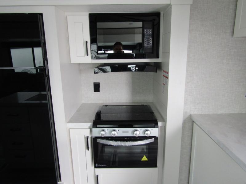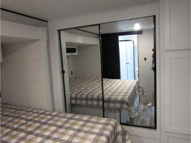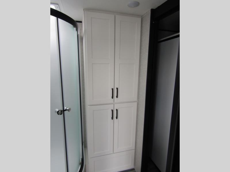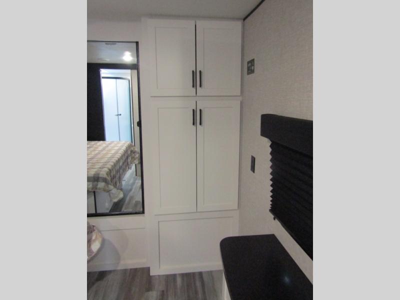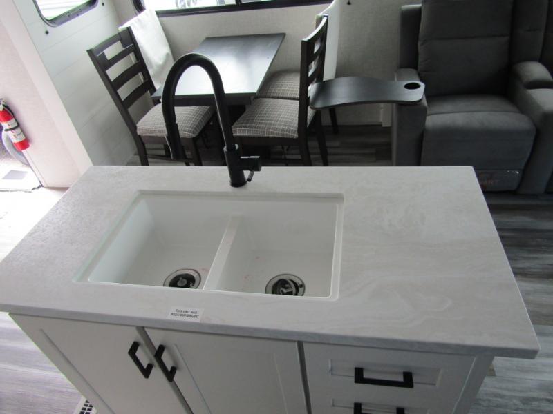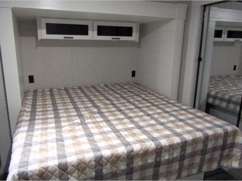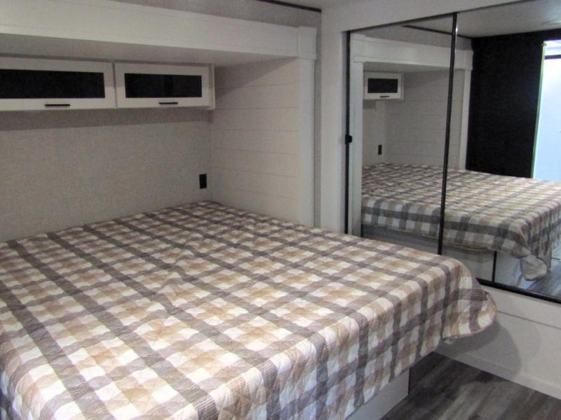 Enjoy a relaxing weekend getaway in this travel trailer! The dual entry bathroom with radius shower creates a front master suite with a queen bed slide, a dresser, and a front large wardrobe with storage space plus washer and dryer prep. The chef will have an easy time preparing their best home cooked meals with the kitchen island, hutch, three burner cooktop, and 12V refrigerator. Enjoy your meals at the booth dinette then play a card game or transform it into an extra sleeping space. The rear living area has a rear Jack-knife sofa for a quick afternoon nap and theater seating across from the entertainment center with a fireplace for the perfect spot on movie night!