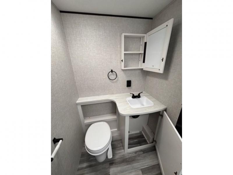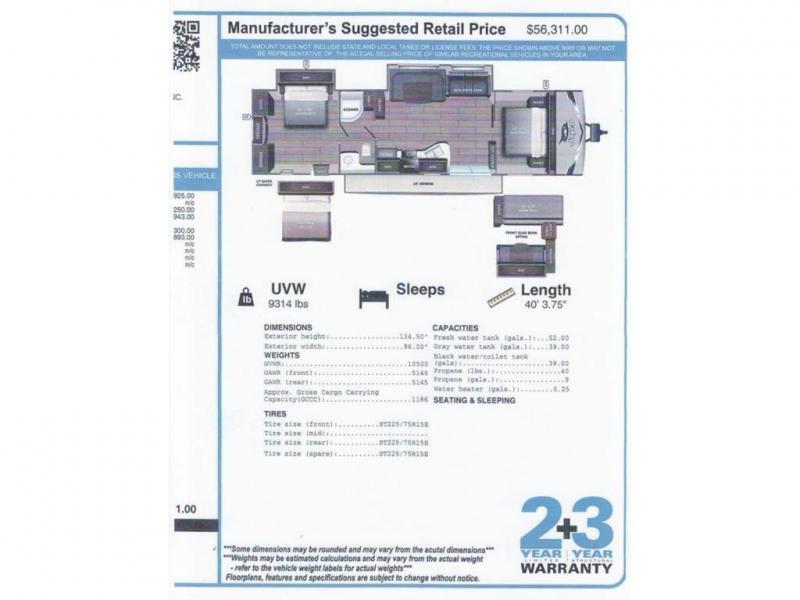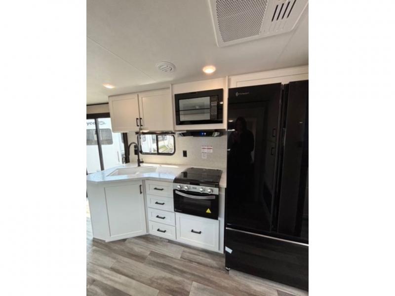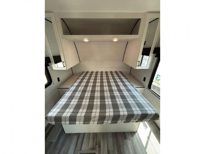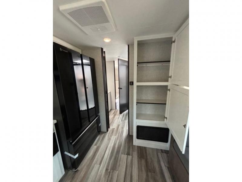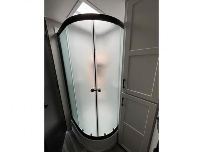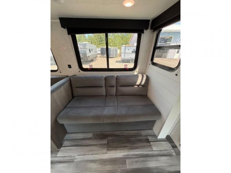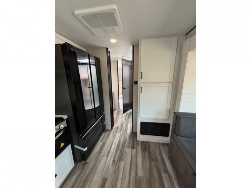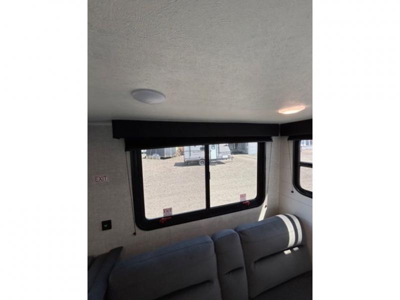With two private bedrooms, everyone will have a comfortable place to sleep in this travel trailer! The front private bedroom has a 60" x 75" queen bed with wardrobes on either side and the rear private bedroom has a 60" x 80" queen bed slide with a dresser, a wardrobe, one of the exit/entrance doors, and an entrance into the walk-through bathroom which has a radius shower for everyone to stay squeaky clean. The patio doors not only make it easy to enter and exit the unit, but also bring in tons of natural lighting. After you have prepared a delicious home cooked meal, you can can head to the U-shaped dinette to enjoy it there comfortably then relax on the Jack-knife sofa across from the entertainment center!