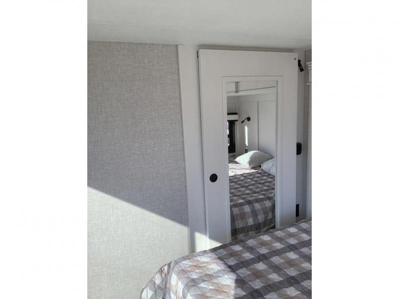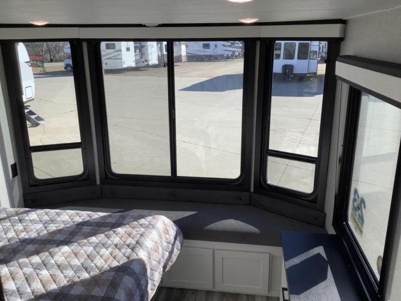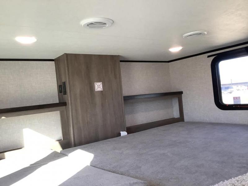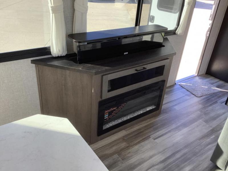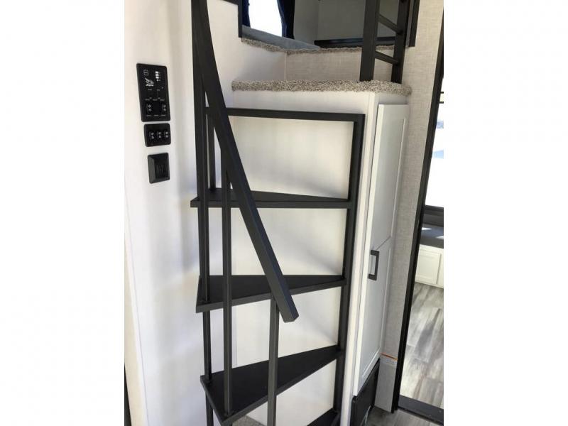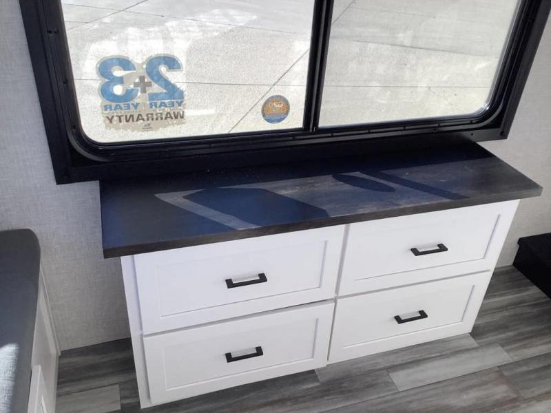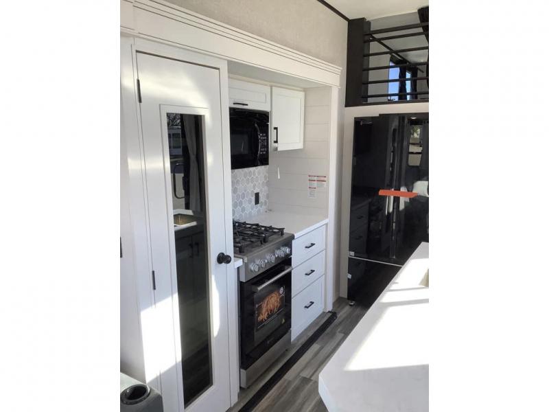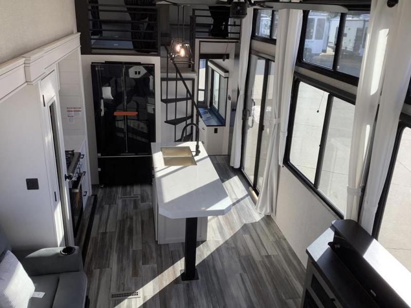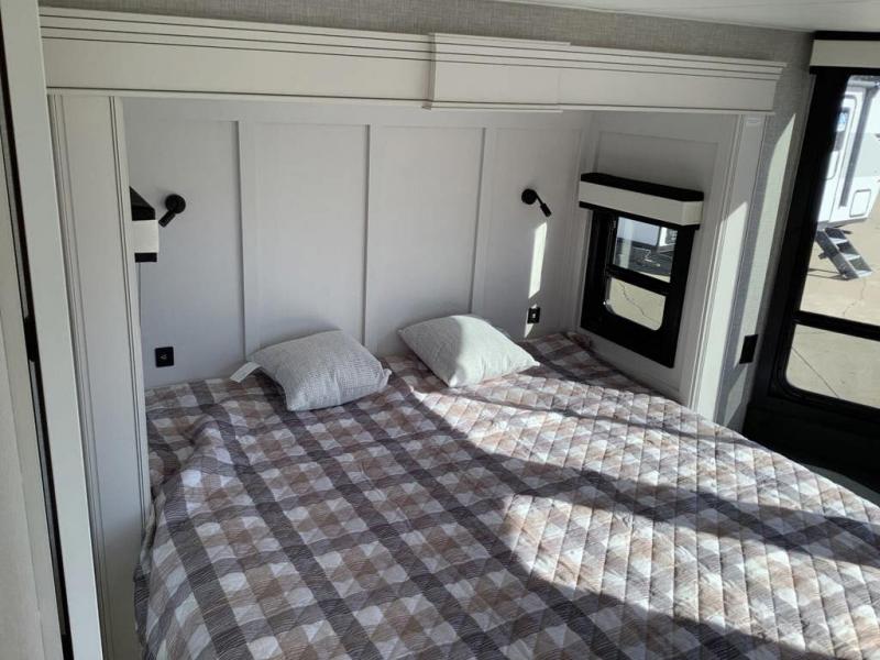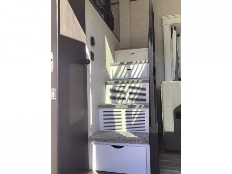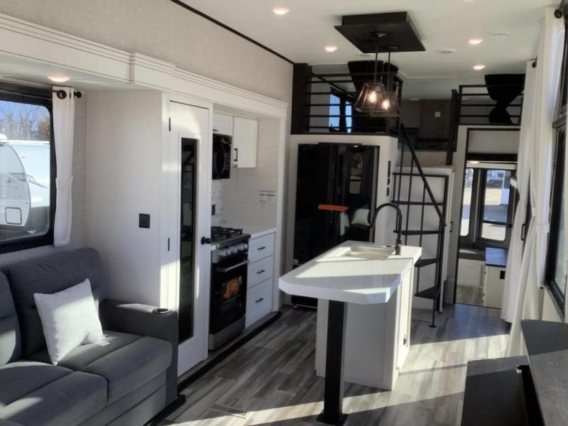 Travel in comfort with your family. You will love having your own bedroom up front with a queen bed, a bench with storage below, plus a dresser and over head cabinet for your things. This unit comes with more space for everyone to sleep for instance the loft area, which has multiple bunk mats where three people can easily fit, or the sectional sofa with hide-a-bed situated in the living room, ideal for two. Also in the living area, you will be able to enjoy the entertainment center, plus, a ceiling fan will keep the air moving while the chef cooks delicious meals in the morning, and you all can dine at the kitchen island which includes bar stools. The Kitchen is also fitted with a residential fridge, microwave, four cooktop burner, sink and pantry perfect to cook with luxury and comfort. Finally, take a bath in the full rear bathroom.