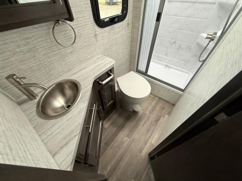 Head across the states in this comfortable coach that can sleep five each night. You will enjoy an RV queen bed just like you have at home, and your guests can sleep on the U-shaped dinette and cab-over bunk. If you're not needing the overhead bunk, just choose the optional front entertainment center with a 32" LED HDTV, and the dinette can also be optioned out for theater seating to make this a couples coach. You can prepare all your meals on the two burner drop-in cooktop, or use the convection microwave. The flip-up counter will provide more counter space, and all your perishables can be stored in the 10 cu. ft. 12V refrigerator.