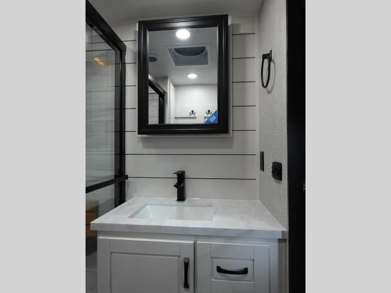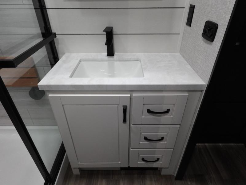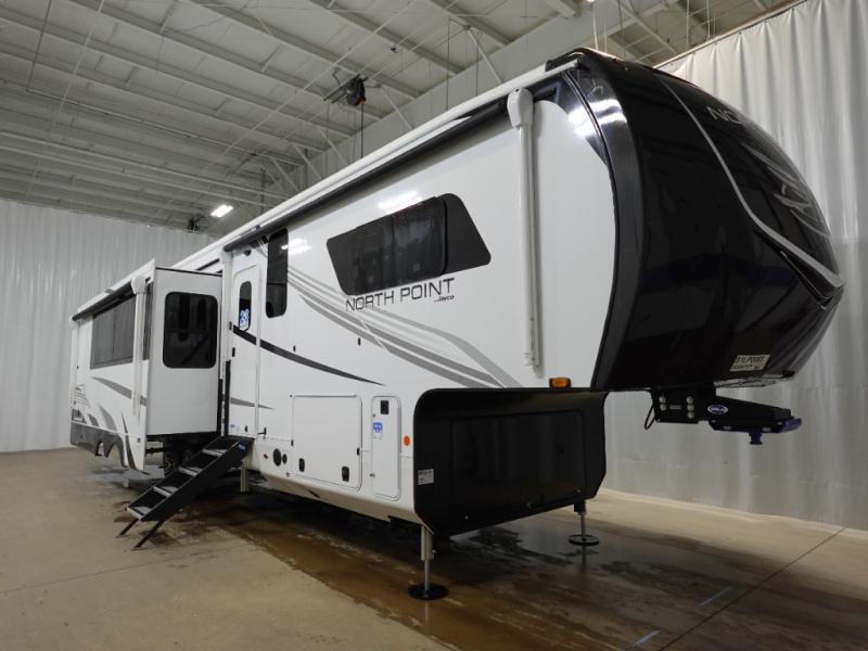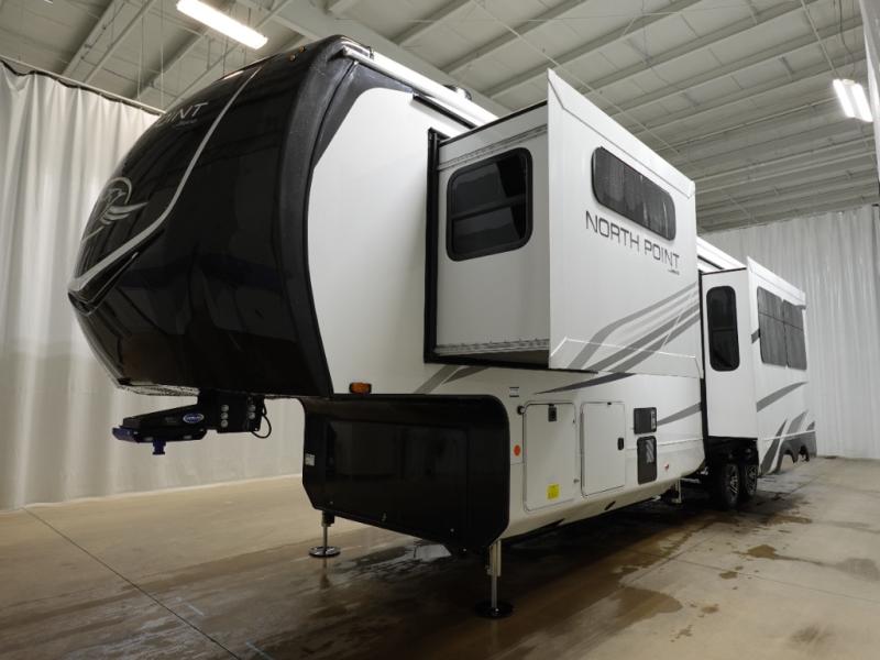 With any North Point fifth wheel by Jayco you begin with a strong foundation with a custom frame, designed and sized specifically to best support each unit. Constructed with Stronghold VBL™ aluminum framed, vacuum bond laminated walls and the Magnum Truss™ XL6™ roof system with a one-piece, seamless roof material, which is the strongest tested roof in the industry. The 5-Star Handling package is included with Uniroyal tires, a MORryde rubber pin box, Dexter axles with Nev-R-Adjust brakes, MORryde CRE-3000 rubberized suspension and wet bolt fasteners and bronze bushings. The interior has handcrafted hardwood glazed doors and drawers, vinyl flooring throughout, an integrated under-mount sink in the main bathroom, plus so much more you just have to see one to believe it all!