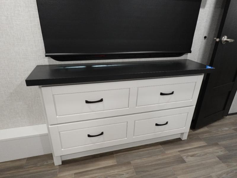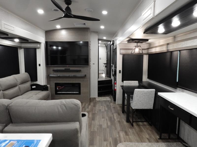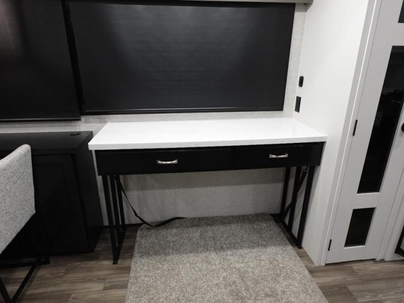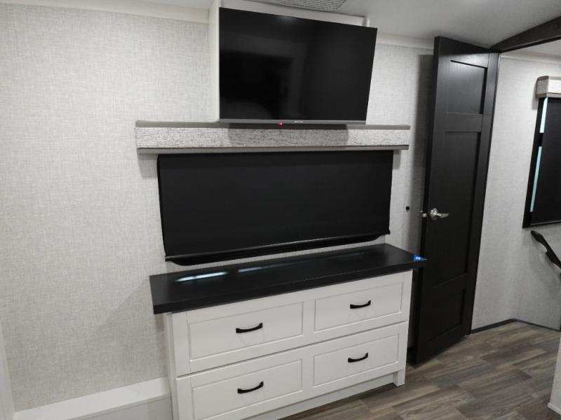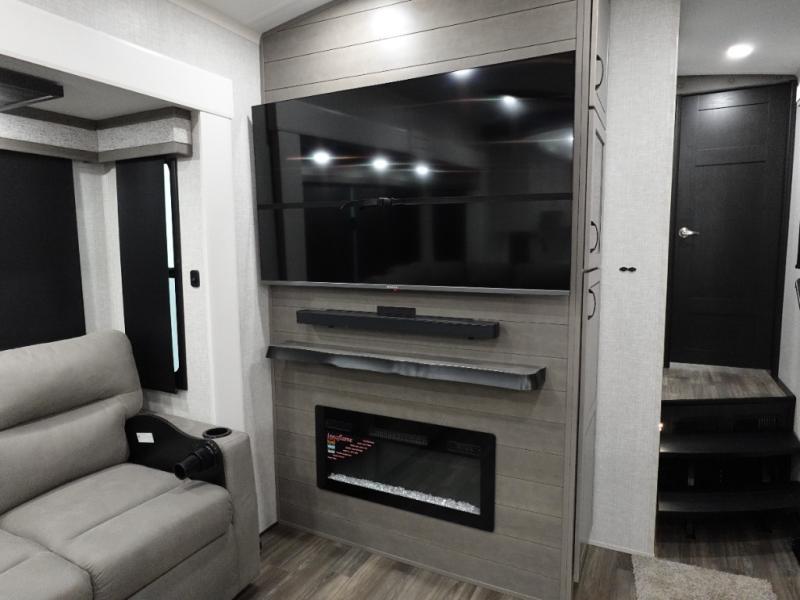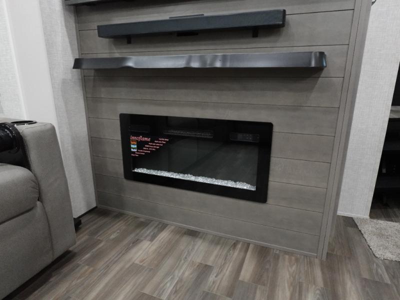 You can't go wrong when camping in this triple slide out fifth wheel! Once you've arrived at your destination and unloaded the pass-through storage, you can make lunch in the rear kitchen with generous counter space. There are also two pantries, one being a pull-out, plus a convenient pull-out butcher block so you can chop fresh veggies! You can enjoy your meal at the roll-top dinette with chairs, and if you need to get some work done, the desk/coffee bar will provide a space for your laptop. An L-shaped sofa and theater seat in the main living area will create an inviting space, plus there is a 65" TV and a mantle with a fireplace just like at home! Freshen up in the full bath at the end of the day, then head to the front private bedroom for a great night's rest on the king bed slide out. There is a closet with drawers and a hamper below, a chest with a TV.