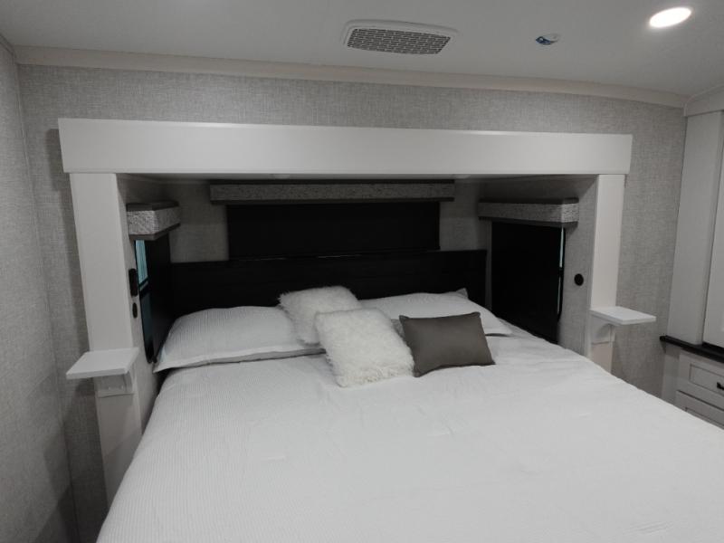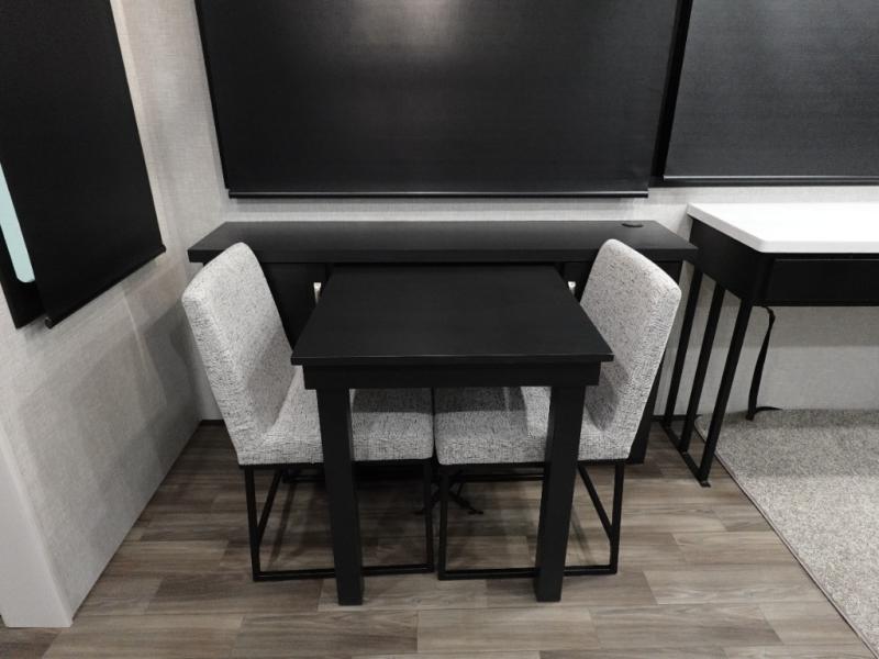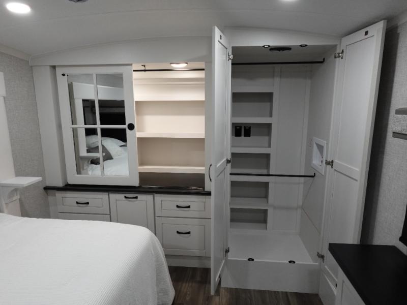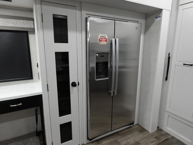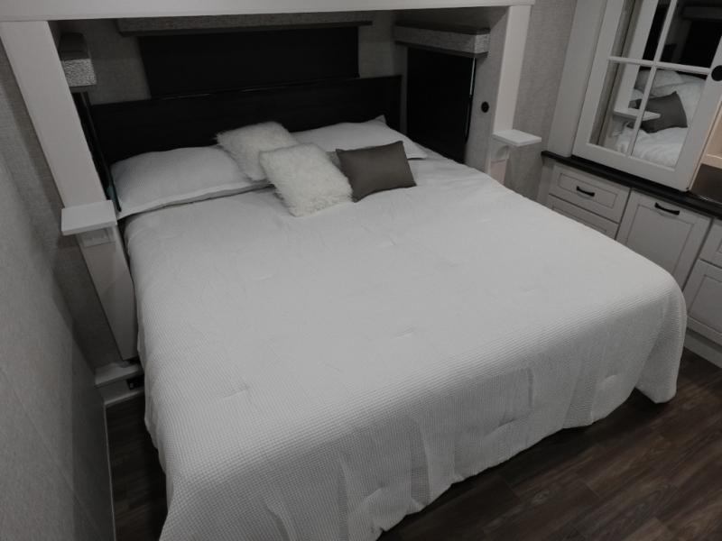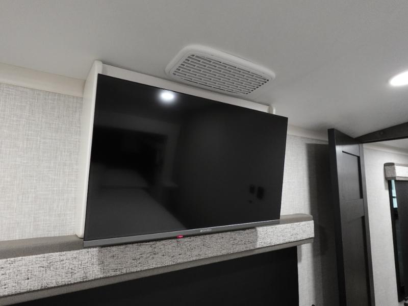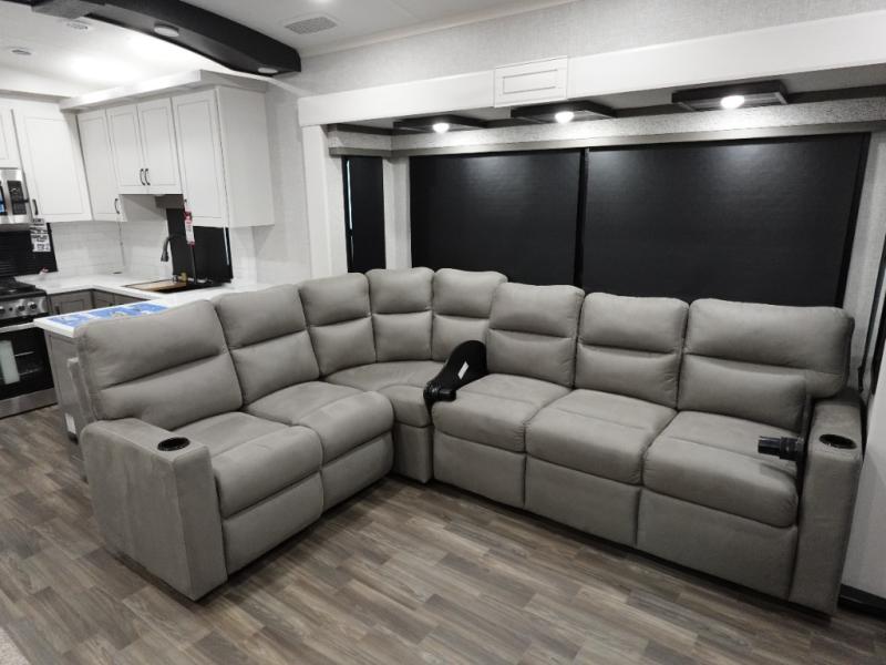 You can't go wrong when camping in this triple slide out fifth wheel! Once you've arrived at your destination and unloaded the pass-through storage, you can make lunch in the rear kitchen with generous counter space. There are also two pantries, one being a pull-out, plus a convenient pull-out butcher block so you can chop fresh veggies! You can enjoy your meal at the roll-top dinette with chairs, and if you need to get some work done, the desk/coffee bar will provide a space for your laptop. An L-shaped sofa and theater seat in the main living area will create an inviting space, plus there is a 65" TV and a mantle with a fireplace just like at home! Freshen up in the full bath at the end of the day, then head to the front private bedroom for a great night's rest on the king bed slide out. There is a closet with drawers and a hamper below, a chest with a TV.