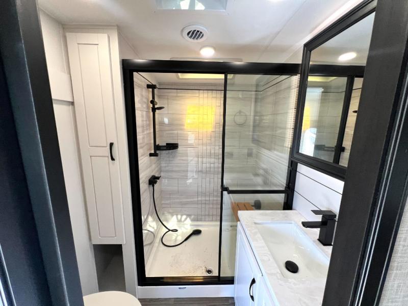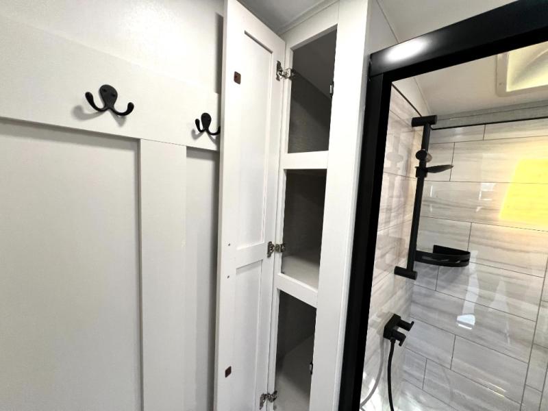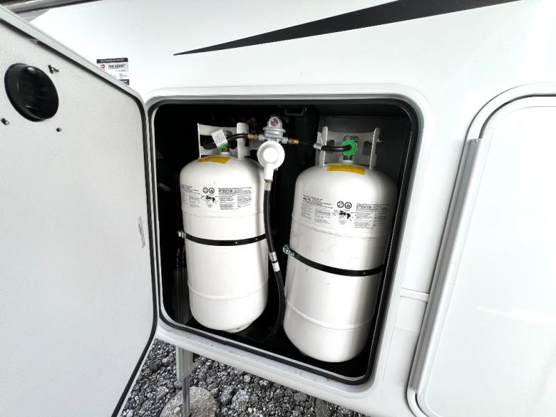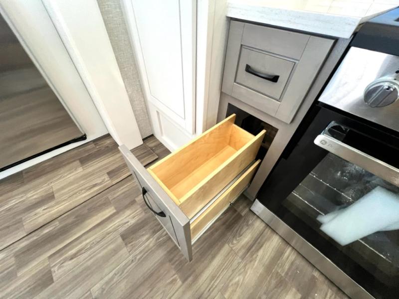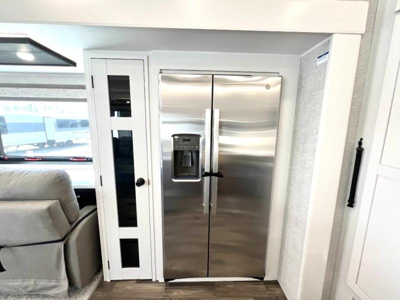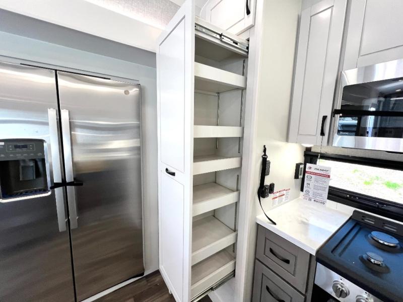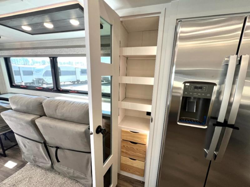 You can't go wrong when camping in this triple slide out fifth wheel! Once you've arrived at your destination and unloaded the pass-through storage, you can make lunch in the rear kitchen with generous counter space. There are also two pantries, one being a pull-out, plus a convenient pull-out butcher block so you can chop fresh veggies! You can enjoy your meal at the roll-top dinette with chairs, and if you need to get some work done, the desk/coffee bar will provide a space for your laptop. An L-shaped sofa and theater seat in the main living area will create an inviting space, plus there is a 65" TV and a mantle with a fireplace just like at home! Freshen up in the full bath at the end of the day, then head to the front private bedroom for a great night's rest on the king bed slide out. There is a closet with drawers and a hamper below, a chest with a TV, plus washer and dryer prep for the option to add these appliances; how convenient!
