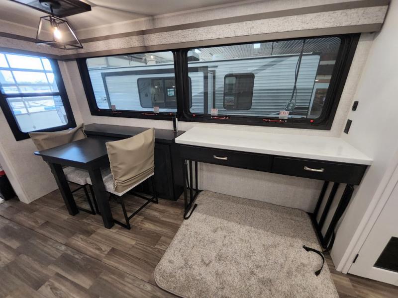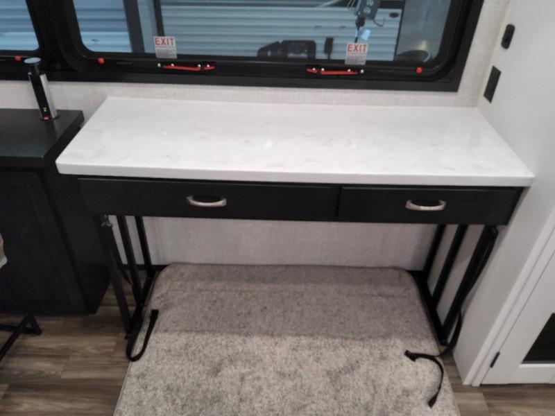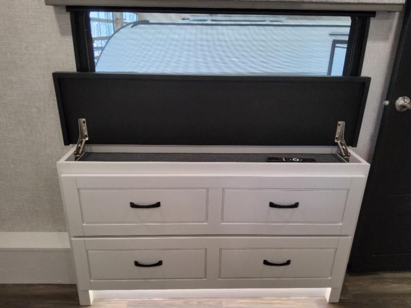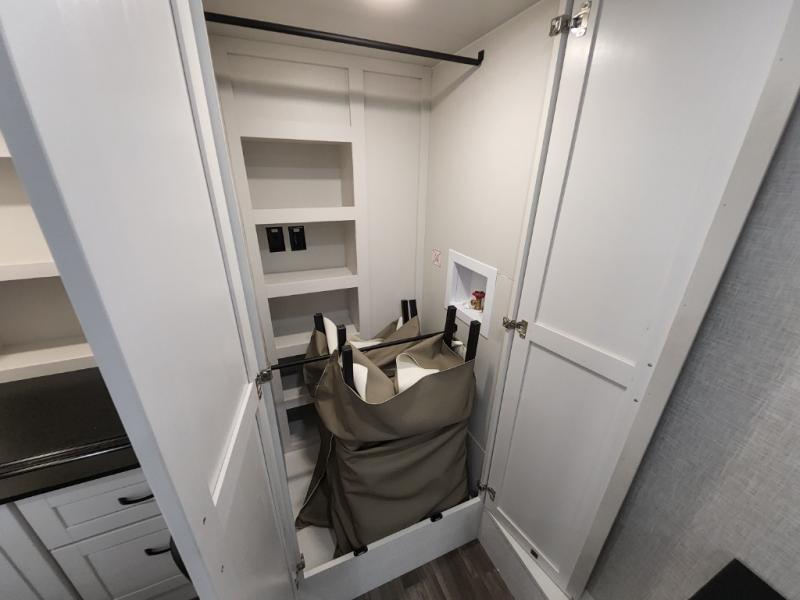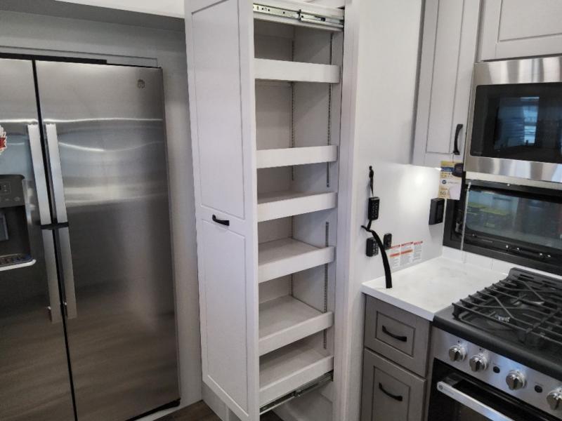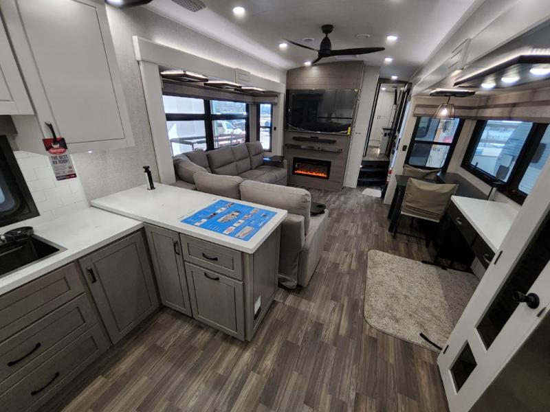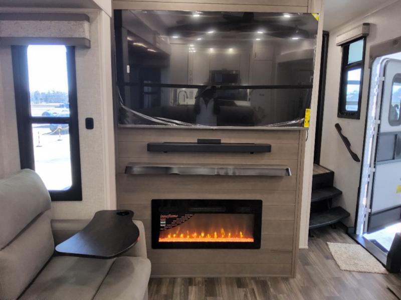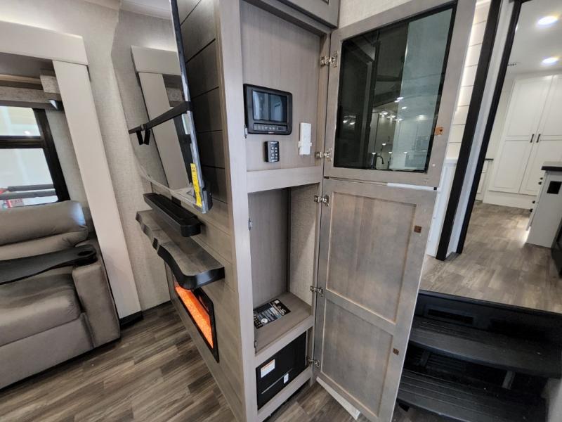 You can't go wrong when camping in this triple slide out fifth wheel! Once you've arrived at your destination and unloaded the pass-through storage, you can make lunch in the rear kitchen with generous counter space. There are also two pantries, one being a pull-out, plus a convenient pull-out butcher block so you can chop fresh veggies! You can enjoy your meal at the roll-top dinette with chairs, and if you need to get some work done, the desk/coffee bar will provide a space for your laptop. An L-shaped sofa and theater seat in the main living area will create an inviting space, plus there is a 65" TV and a mantle with a fireplace just like at home! Freshen up in the full bath at the end of the day, then head to the front private bedroom for a great night's rest on the king bed slide out. There is a closet with drawers and a hamper below, a chest with a TV, plus washer and dryer prep for the option to add these appliances; how convenient!