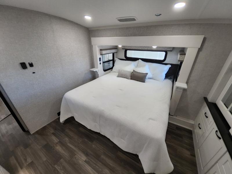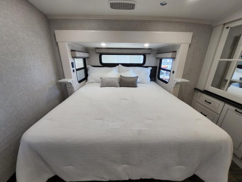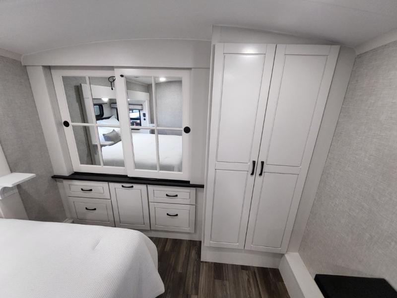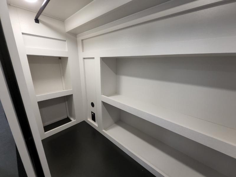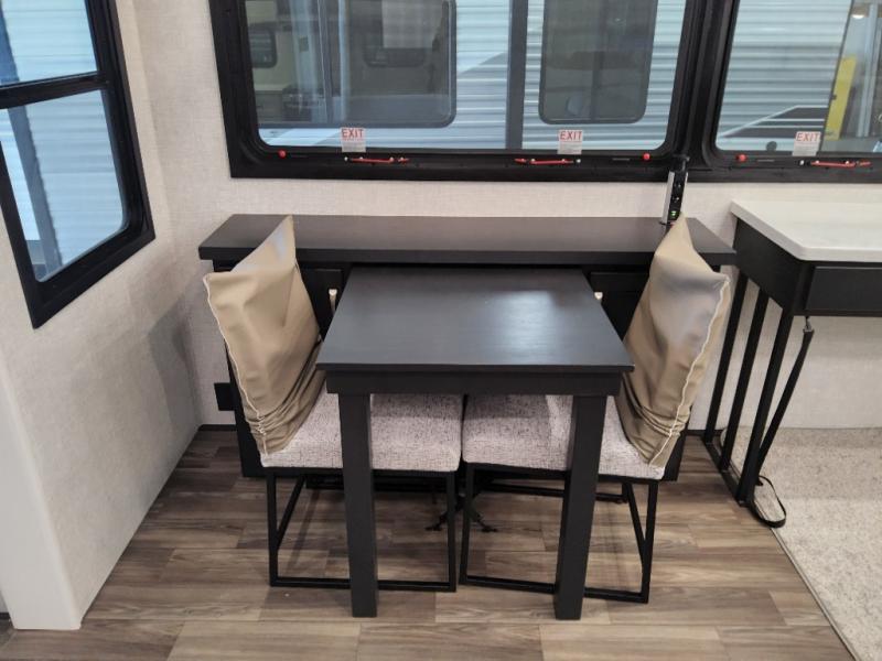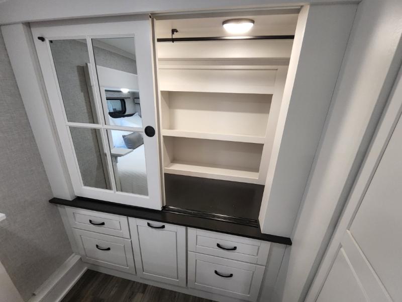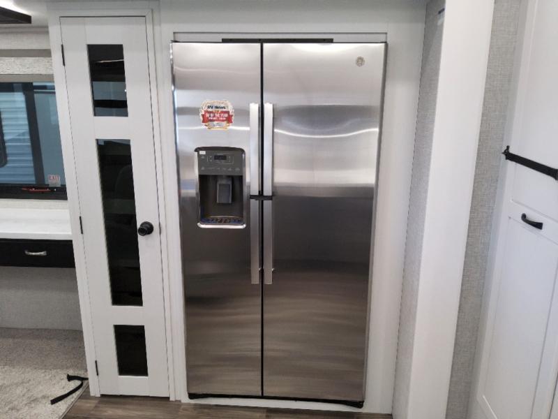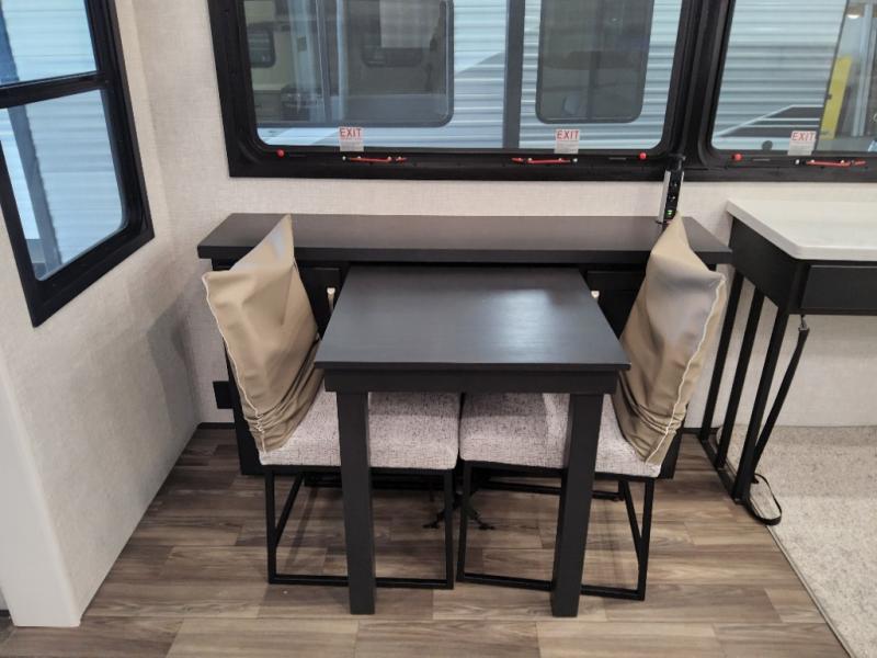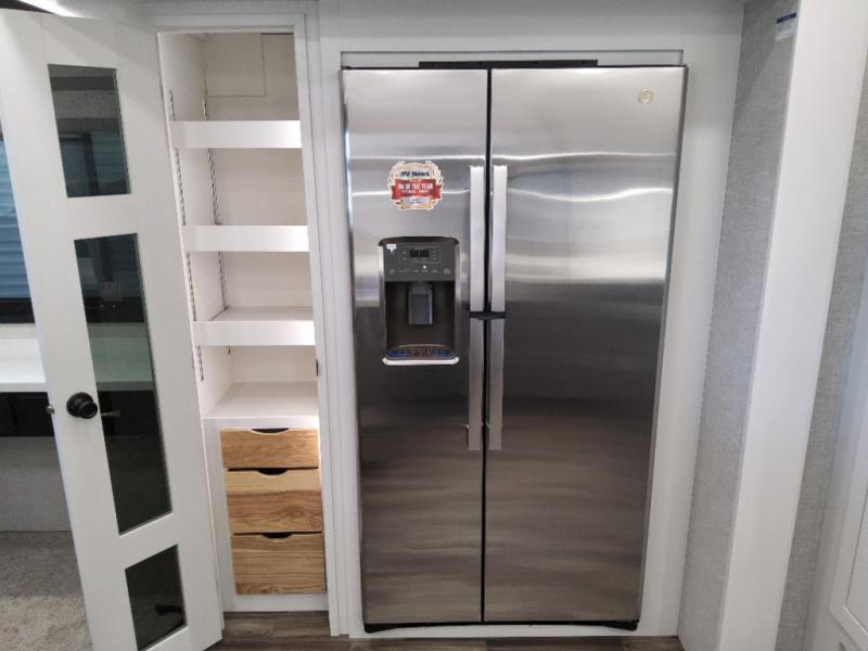 You can't go wrong when camping in this triple slide out fifth wheel! Once you've arrived at your destination and unloaded the pass-through storage, you can make lunch in the rear kitchen with generous counter space. There are also two pantries, one being a pull-out, plus a convenient pull-out butcher block so you can chop fresh veggies! You can enjoy your meal at the roll-top dinette with chairs, and if you need to get some work done, the desk/coffee bar will provide a space for your laptop. An L-shaped sofa and theater seat in the main living area will create an inviting space, plus there is a 65" TV and a mantle with a fireplace just like at home! Freshen up in the full bath at the end of the day, then head to the front private bedroom for a great night's rest on the king bed slide out. There is a closet with drawers and a hamper below, a chest with a TV, plus washer and dryer prep for the option to add these appliances; how convenient!