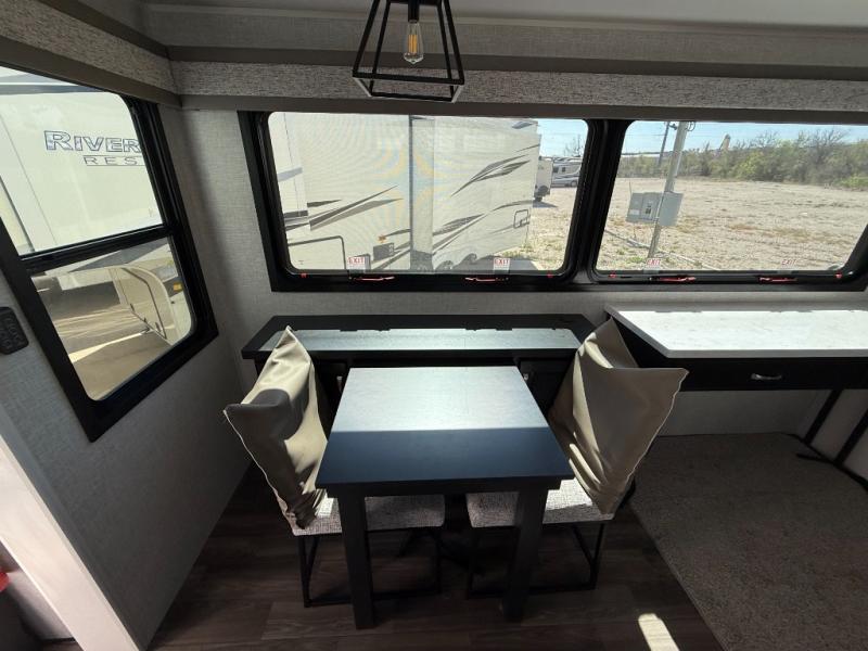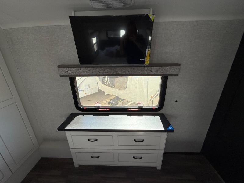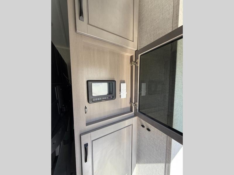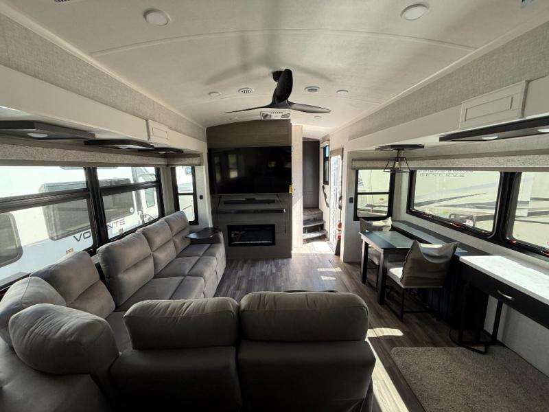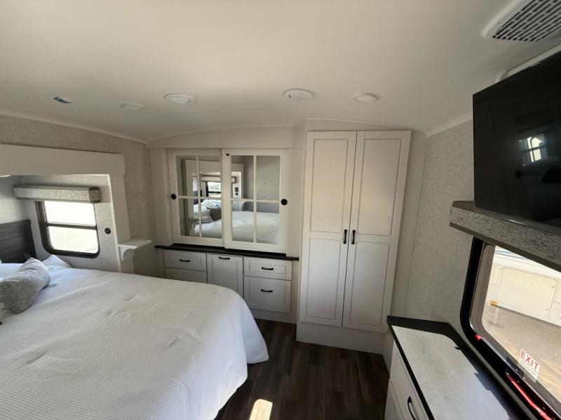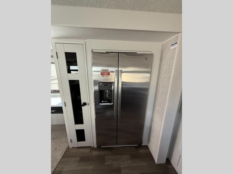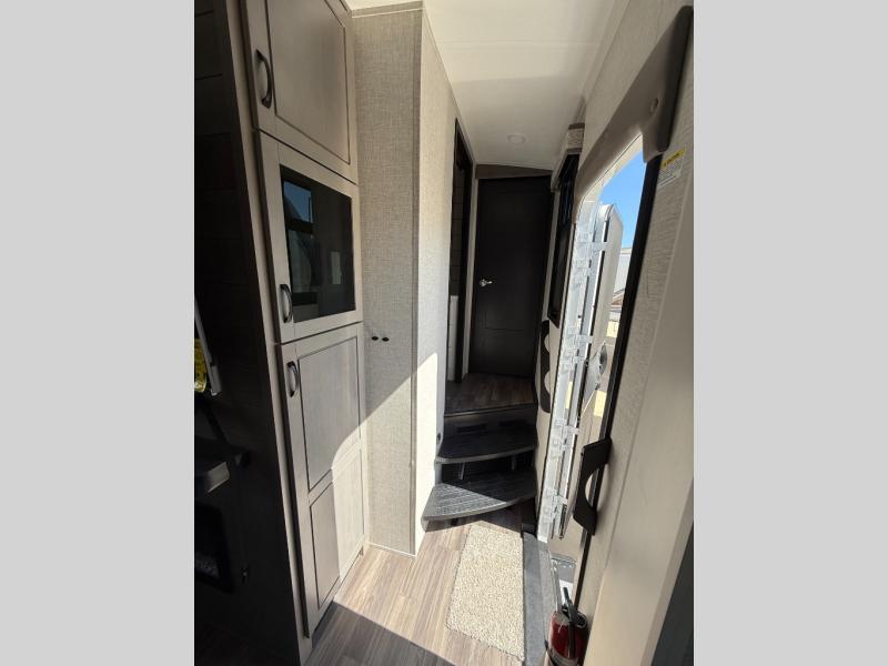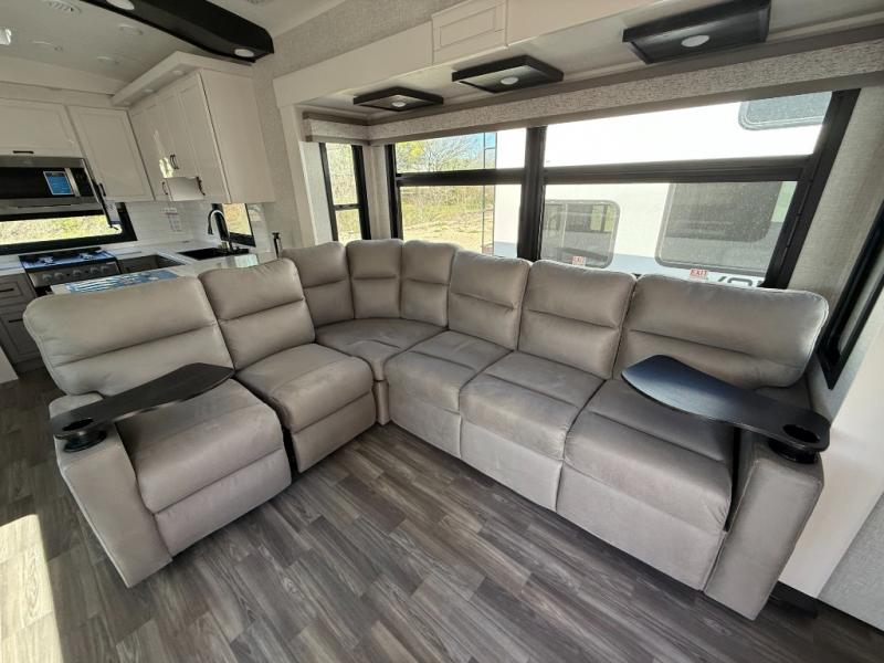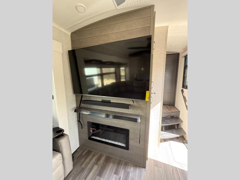 You can't go wrong when camping in this triple slide out fifth wheel! Once you've arrived at your destination and unloaded the pass-through storage, you can make lunch in the rear kitchen with generous counter space. There are also two pantries, one being a pull-out, plus a convenient pull-out butcher block so you can chop fresh veggies! You can enjoy your meal at the roll-top dinette with chairs, and if you need to get some work done, the desk/coffee bar will provide a space for your laptop. An L-shaped sofa and theater seat in the main living area will create an inviting space, plus there is a 65" TV and a mantle with a fireplace just like at home! Freshen up in the full bath at the end of the day, then head to the front private bedroom for a great night's rest on the king bed slide out. There is a closet with drawers and a hamper below, a chest with a TV, plus washer and dryer prep for the option to add these appliances; how convenient!