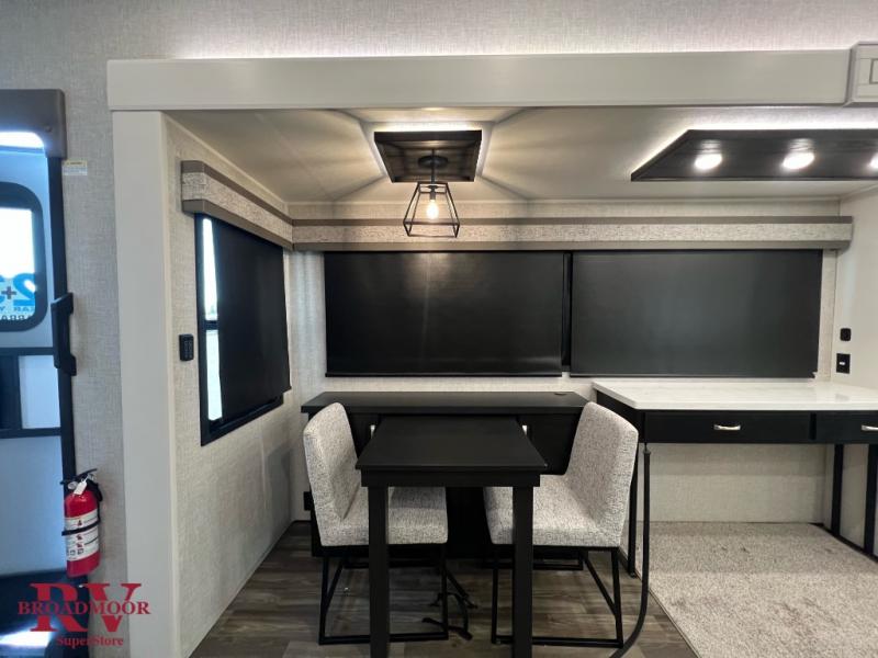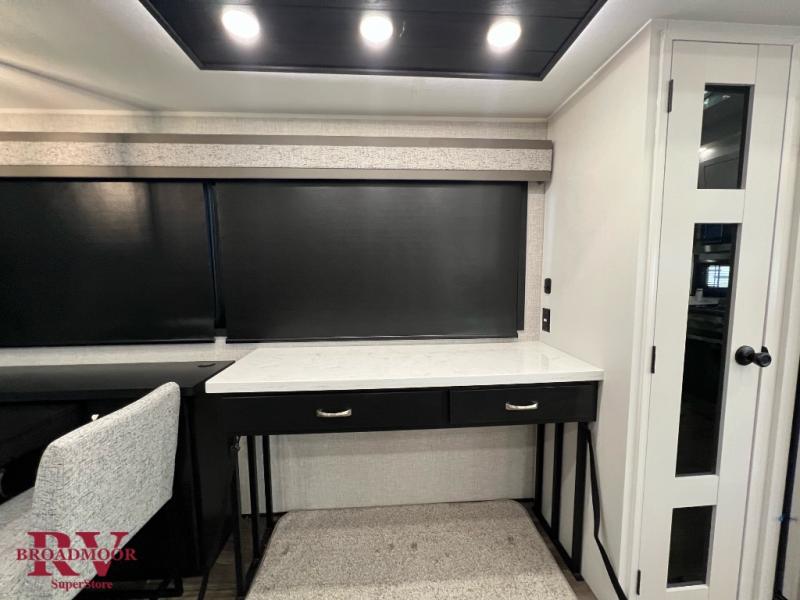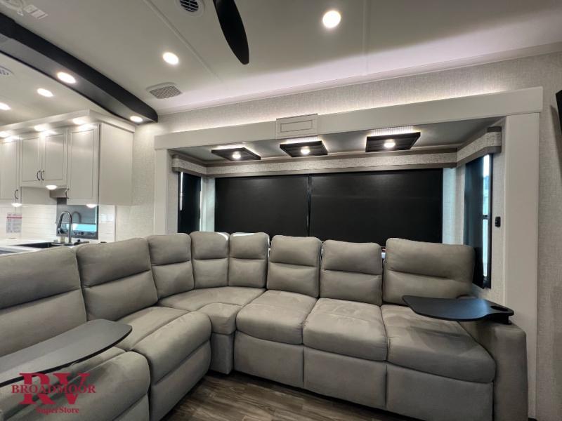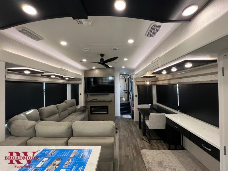You can't go wrong when camping in this triple slide out fifth wheel! Once you've arrived at your destination and unloaded the pass-through storage, you can make lunch in the rear kitchen with generous counter space. There are also two pantries, one being a pull-out, plus a convenient pull-out butcher block so you can chop fresh veggies! You can enjoy your meal at the roll-top dinette with chairs, and if you need to get some work done, the desk/coffee bar will provide a space for your laptop. An L-shaped sofa and theater seat in the main living area will create an inviting space, plus there is a 65" TV and a mantle with a fireplace just like at home! Freshen up in the full bath at the end of the day, then head to the front private bedroom for a great night's rest on the king bed slide out. There is a closet with drawers and a hamper below, a chest with a TV, plus washer and dryer prep for the option to add these appliances; how convenient!