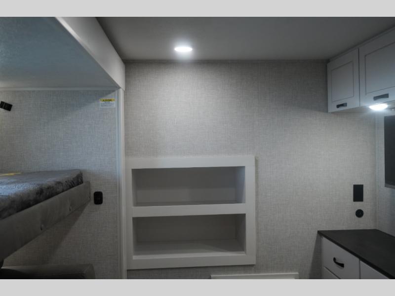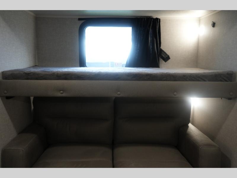 The middle bonus room with a desk, tri-fold sofa, flip-up bunk, and closet transforms effortlessly from an office to a guest suite or entertainment space. Above, a loft bunk area adds even more sleeping flexibility for guests or kids. Every detail is built for convenience, comfort, and lasting quality.