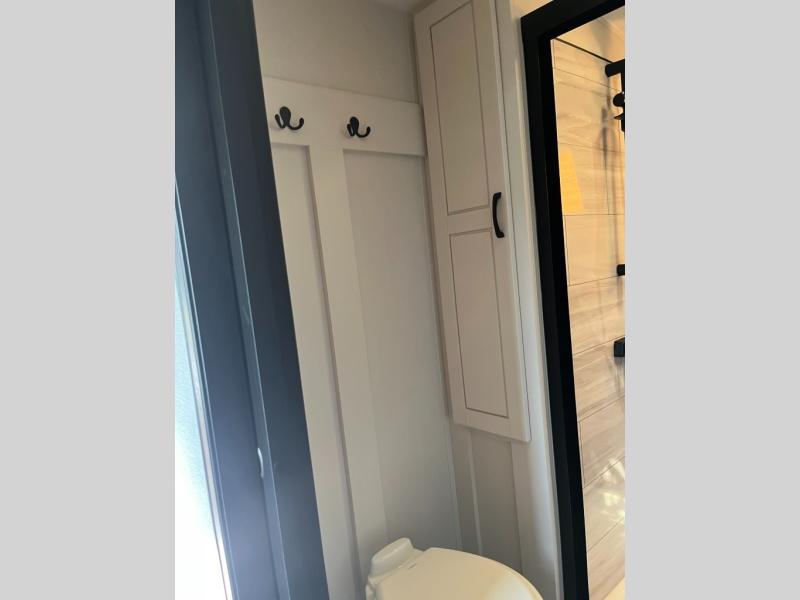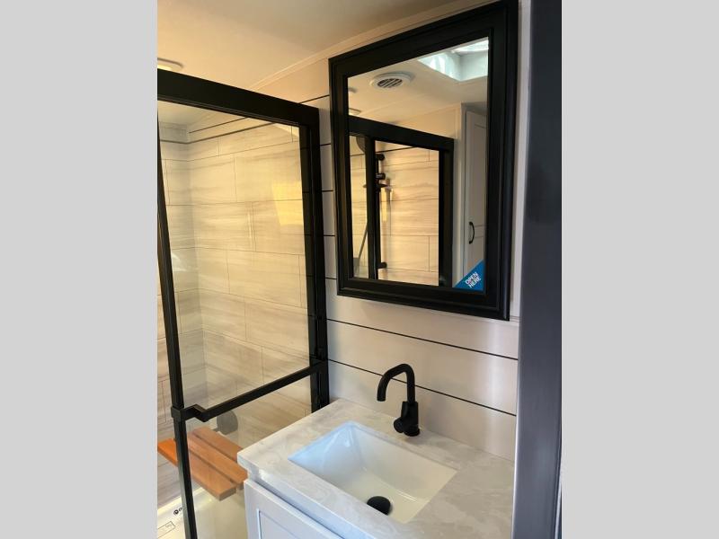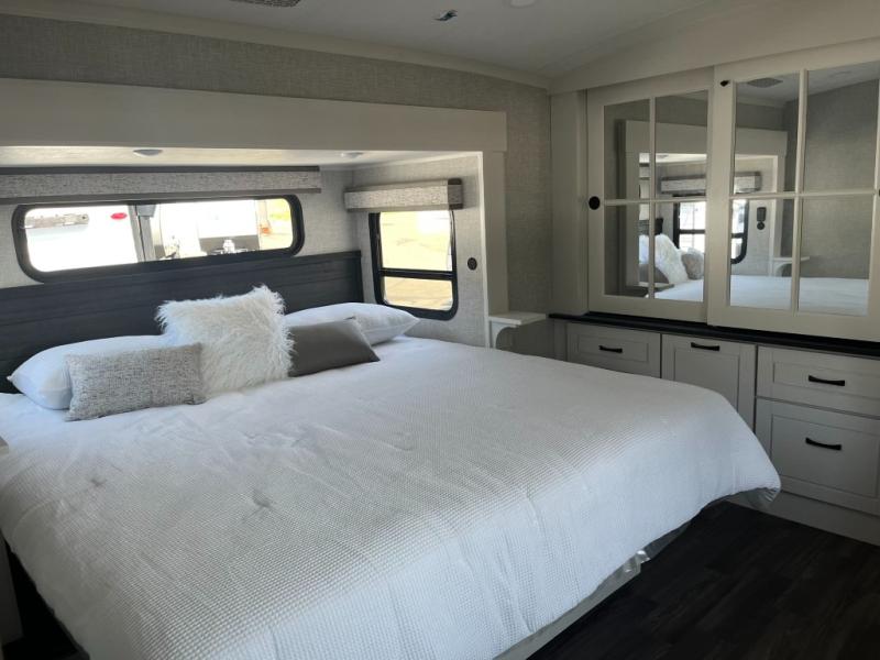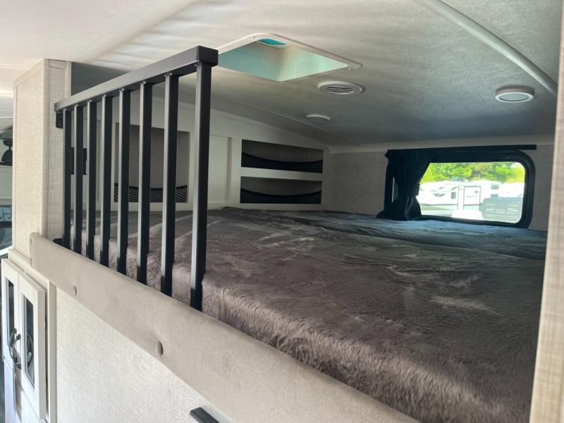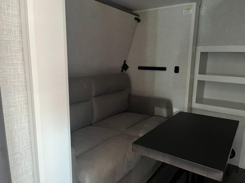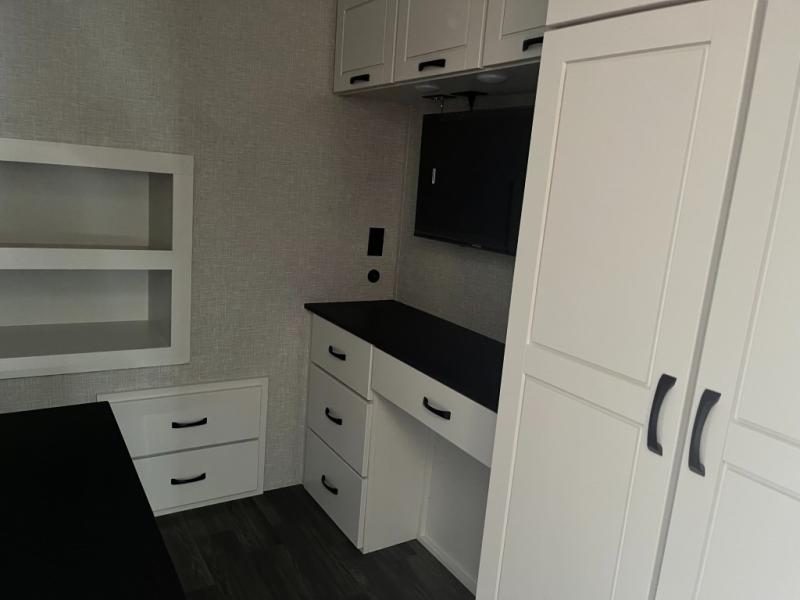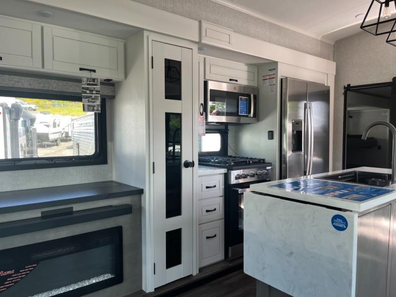 You can work from anywhere with this fifth wheel thanks to the middle bonus room that offers a desk with TV above, a tri-fold sofa with removable table, a flip-up bunk and a closet. This multi-use room works for just about anything including an extra living area and bunkhouse. The shoe storage under the interior steps, the linen cabinet in the full bathroom, the walk-in closet in the bedroom, and the overhead cabinets plus exterior storage allows you to bring whatever you want. Enjoy cooking in the kitchen that provides an island with a flip-up butcher block, a residential refrigerator, a pantry, and everything you need to keep everyone fed. The theater seats, the tri-fold sofa and the free standing table without a pedestal are great places to sit while watching the 50" Smart LED HDTV with fully digital HDMI output and home entertainment system with subwoofer, plus there is a fireplace below for those chilly evenings.