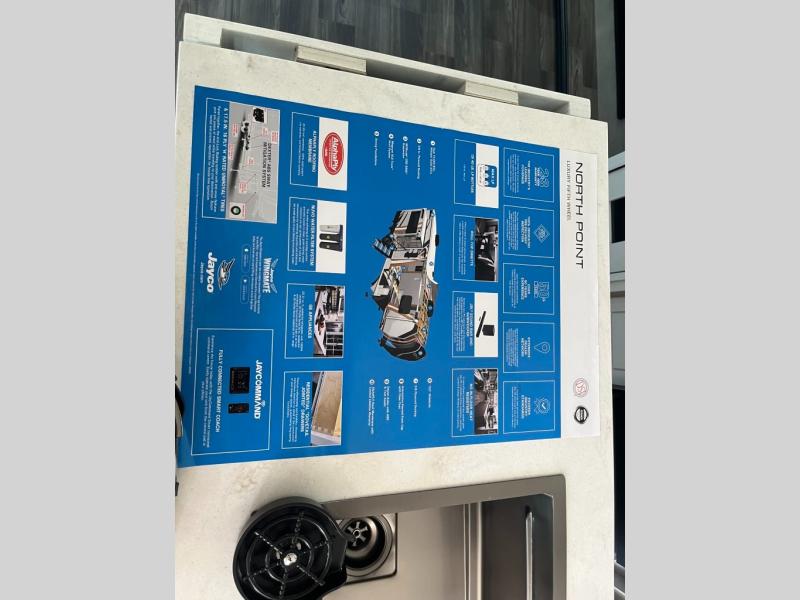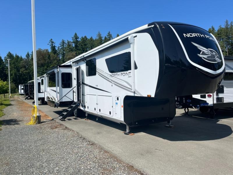 With any North Point fifth wheel by Jayco you begin with a strong foundation with a custom frame, designed and sized specifically to best support each unit. Constructed with Stronghold VBL™ aluminum framed, vacuum bond laminated walls and the Magnum Truss™ XL6™ roof system with a one-piece, seamless roof material which is the strongest tested roof in the industry. The 5-Star Handling package is included with Uniroyal tires, a MORryde rubber pin box, Dexter axles with Nev-R-Adjust brakes, MORryde CRE-3000 rubberized suspension and wet bolt fasteners and bronze bushings. The interior has handcrafted hardwood glazed doors and drawers, vinyl flooring throughout, an integrated under-mount sink in the main bathroom, plus so much more you just have to see one to believe it all!