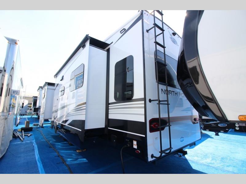 With any North Point fifth wheel by Jayco you begin with a strong foundation with a custom frame, designed and sized specifically to best support each unit. Constructed with Stronghold VBL™ aluminum framed, vacuum bond laminated walls and the Magnum Truss™ XL6™ roof system with a one-piece, seamless roof material which is the strongest tested roof in the industry. The 5-Star Handling package is included with Uniroyal tires, a MORryde rubber pin box, Dexter axles with Nev-R-Adjust brakes, MORryde CRE-3000 rubberized suspension and wet bolt fasteners and bronze bushings. The interior has handcrafted hardwood glazed doors and drawers, vinyl flooring throughout, an integrated under-mount sink in the main bathroom, plus so much more you just have to see one to believe it all!