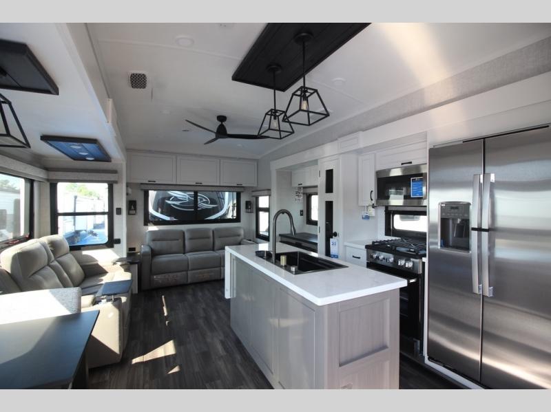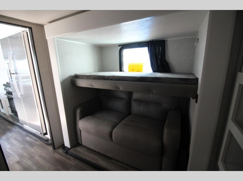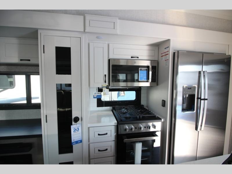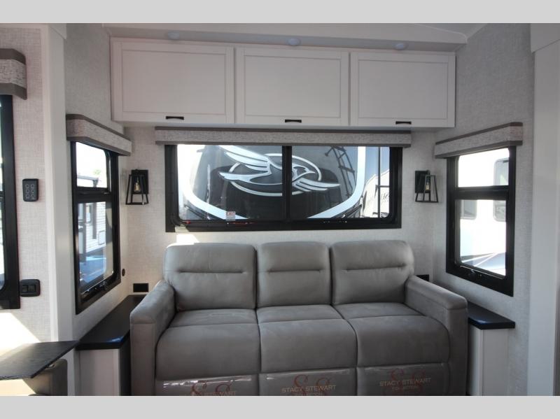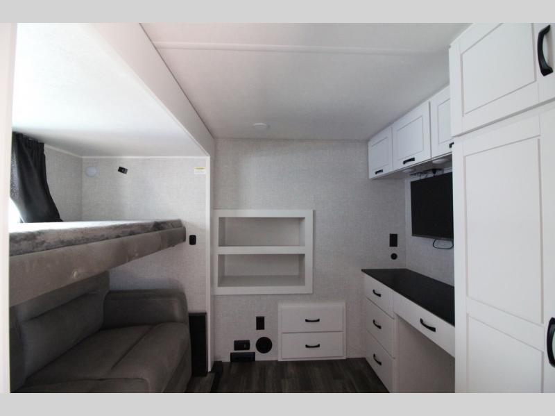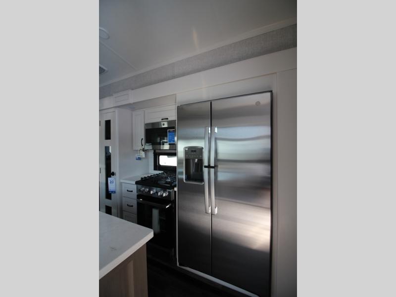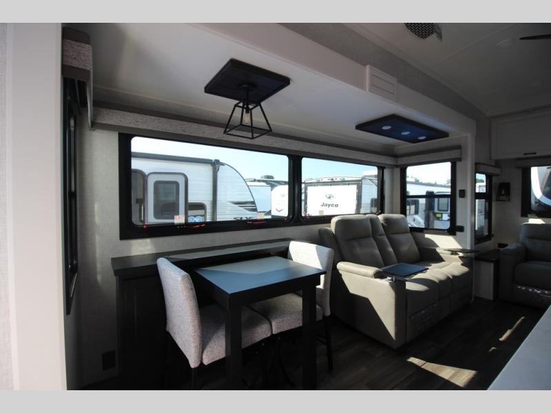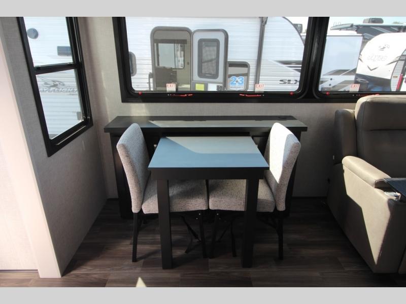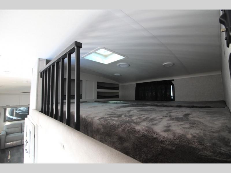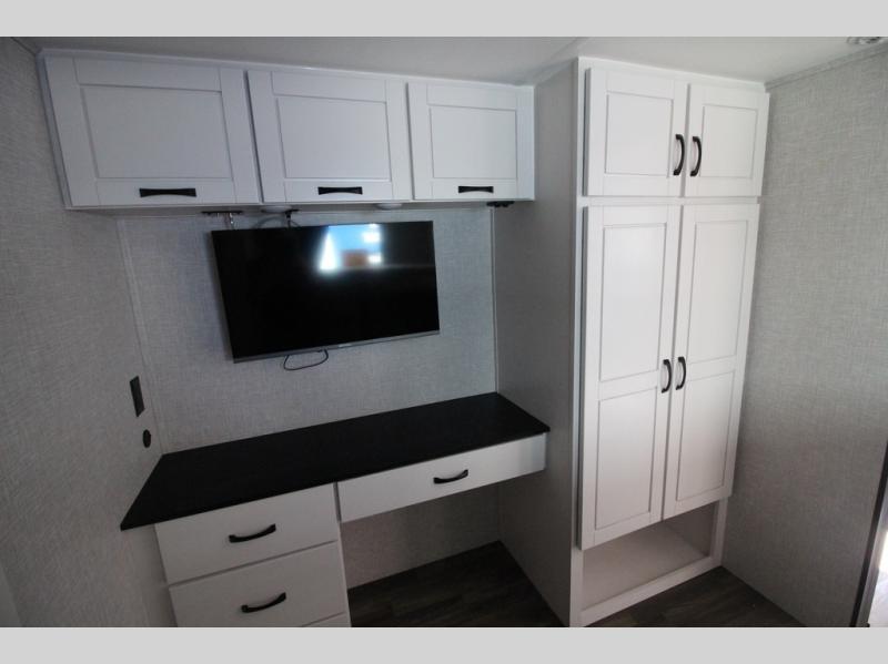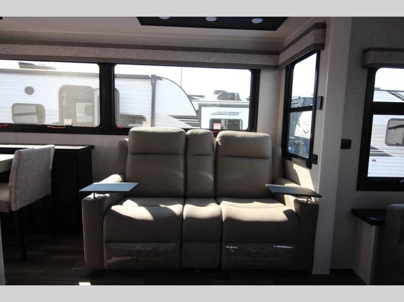 You can work from anywhere with this fifth wheel thanks to the middle bonus room that offers a desk with TV above, a tri-fold sofa with removable table, a flip-up bunk and a closet. This multi-use room works for just about anything including an extra living area and bunkhouse. The shoe storage under the interior steps, the linen cabinet in the full bathroom, the walk-in closet in the bedroom, and the overhead cabinets plus exterior storage allows you to bring whatever you want. Enjoy cooking in the kitchen that provides an island with a flip-up butcher block, a residential refrigerator, a pantry, and everything you need to keep everyone fed. The theater seats, the tri-fold sofa and the free standing table without a pedestal are great places to sit while watching the 50" Smart LED HDTV with fully digital HDMI output and home entertainment system with subwoofer, plus there is a fireplace below for those chilly evenings.