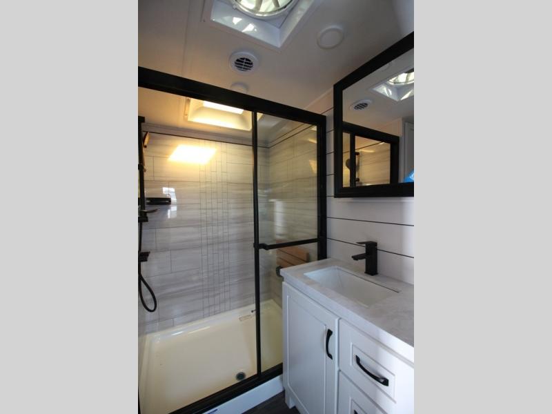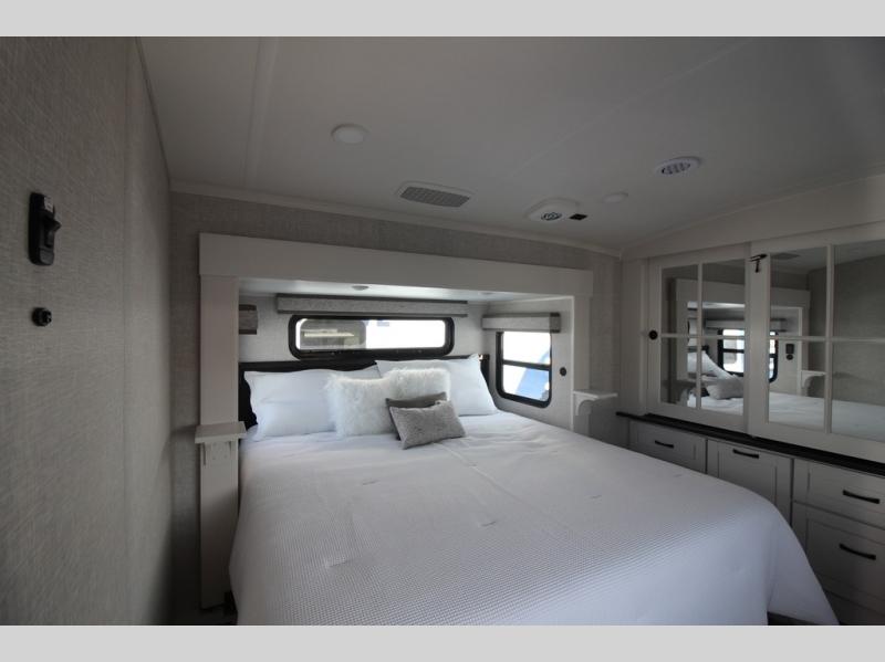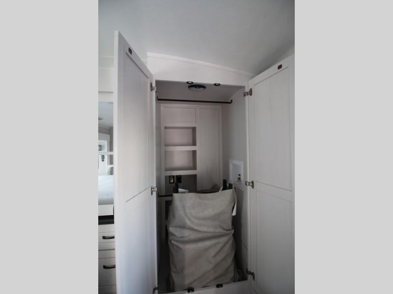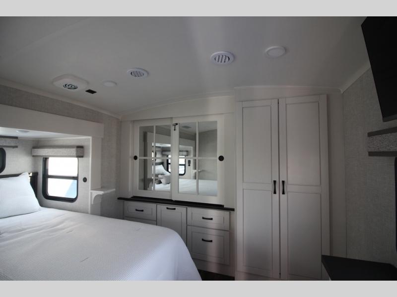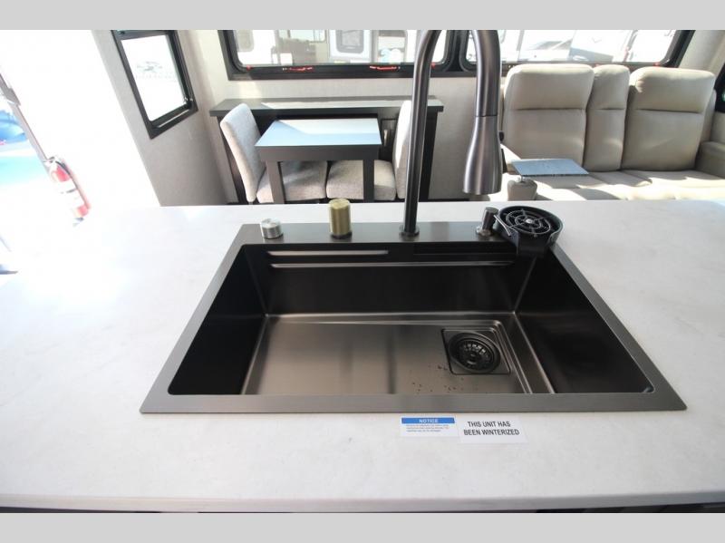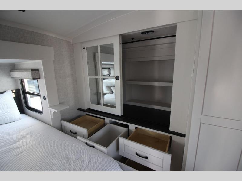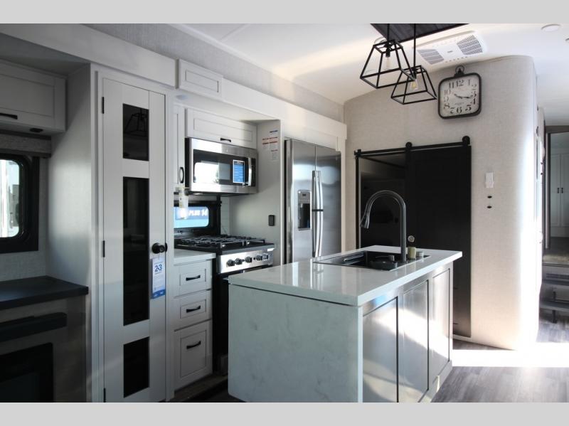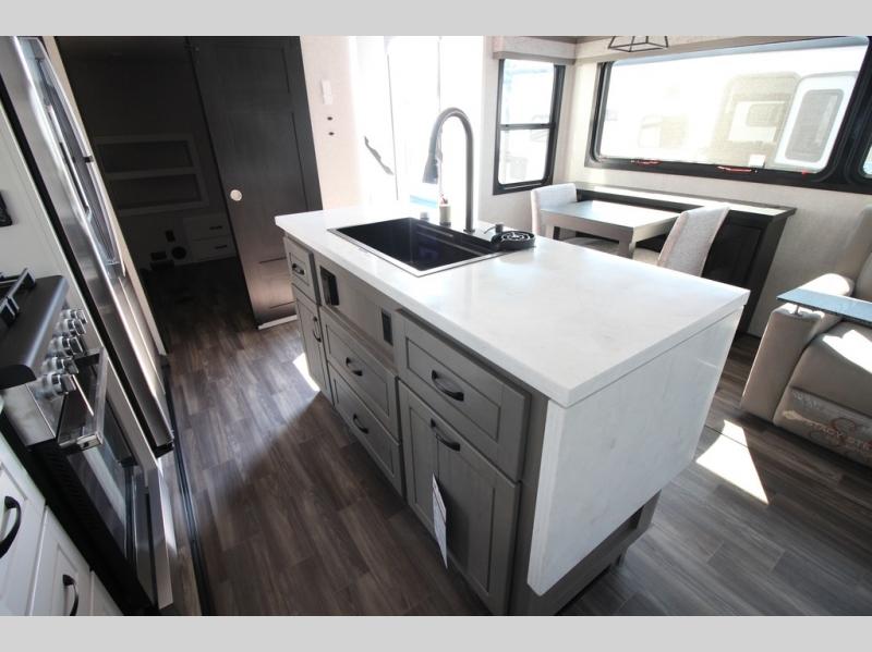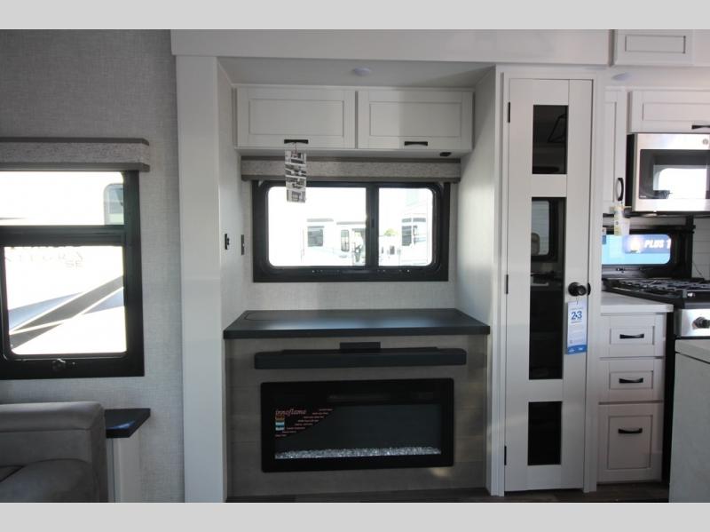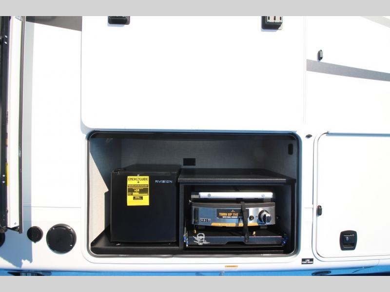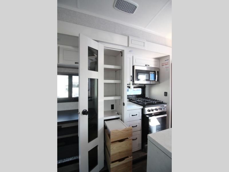 You can work from anywhere with this fifth wheel thanks to the middle bonus room that offers a desk with TV above, a tri-fold sofa with removable table, a flip-up bunk and a closet. This multi-use room works for just about anything including an extra living area and bunkhouse. The shoe storage under the interior steps, the linen cabinet in the full bathroom, the walk-in closet in the bedroom, and the overhead cabinets plus exterior storage allows you to bring whatever you want. Enjoy cooking in the kitchen that provides an island with a flip-up butcher block, a residential refrigerator, a pantry, and everything you need to keep everyone fed. The theater seats, the tri-fold sofa and the free standing table without a pedestal are great places to sit while watching the 50" Smart LED HDTV with fully digital HDMI output and home entertainment system with subwoofer, plus there is a fireplace below for those chilly evenings.